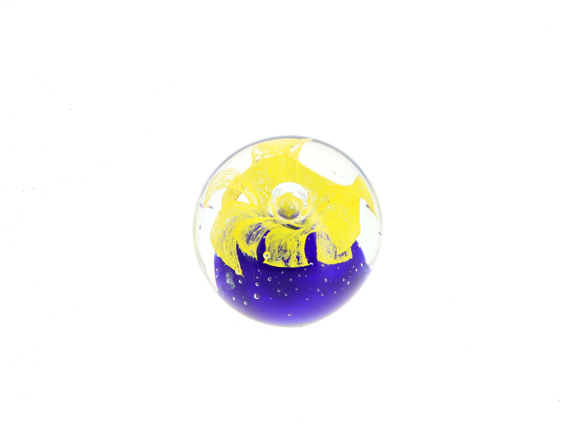 Lote 045 - Peso de papel em Vidro, bolha controlada com base azul e flor em tom de amarelo. Estado de Conservação: Bom. Medidas (Diâm): 8cm. Peso Total: 878,02g.
