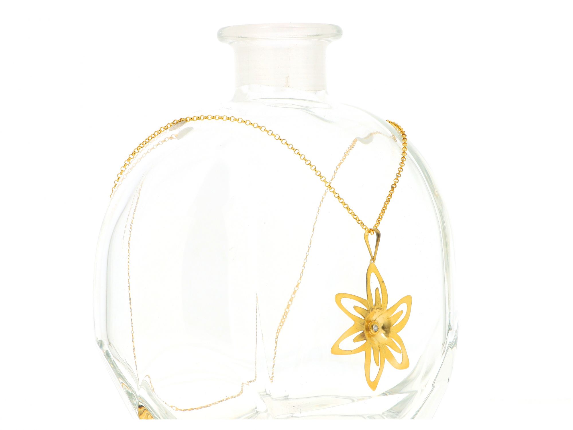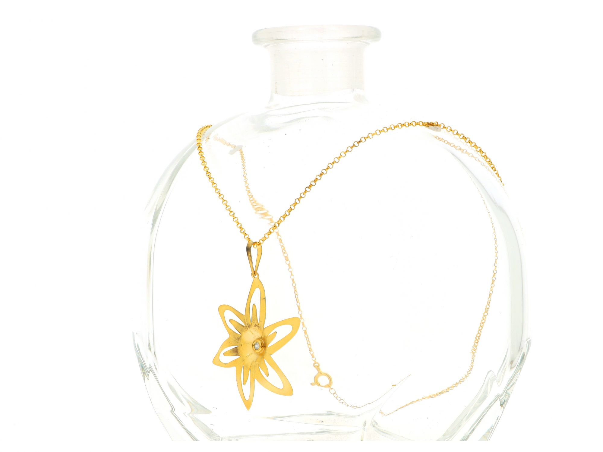 Lote 005 - Colar em Prata Dourada (banhada Ouro) de malha Elo Português com medalha de forma de Flor com zicórnia no centro, elaborado em PRATA 925. Estado de Conservação: Bom. Contraste: Marca 925. (PRATA - ao abrigo do Decreto Lei 120/2017, artigo 3.º, alínea x). Medidas (CxL): 48*4cm. Peso Total: 5,79g.