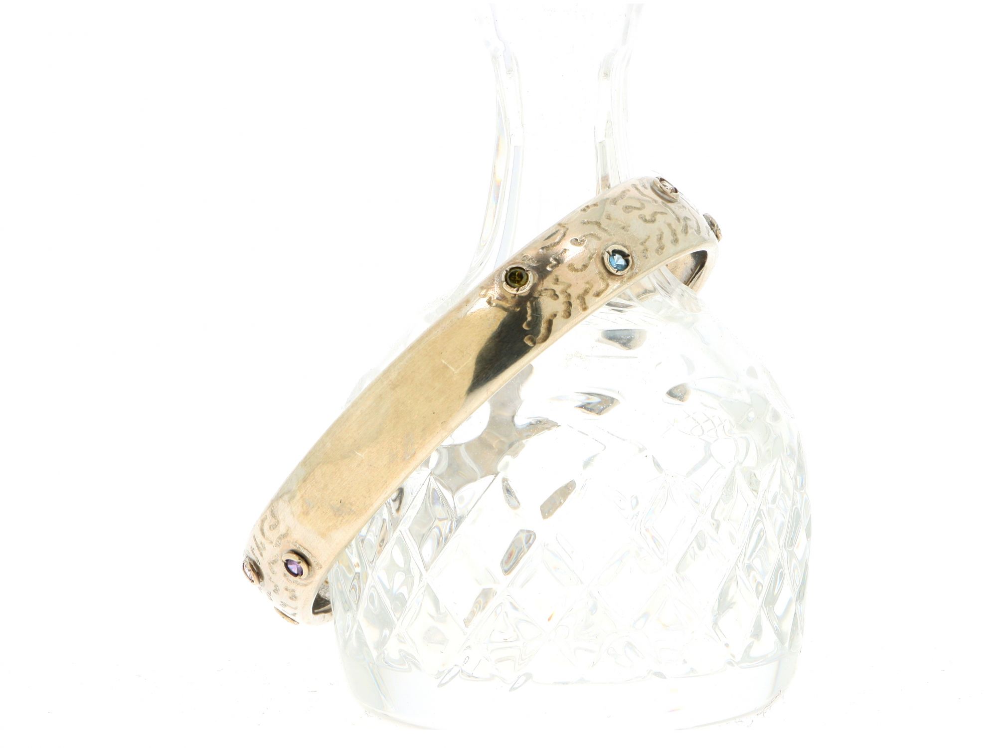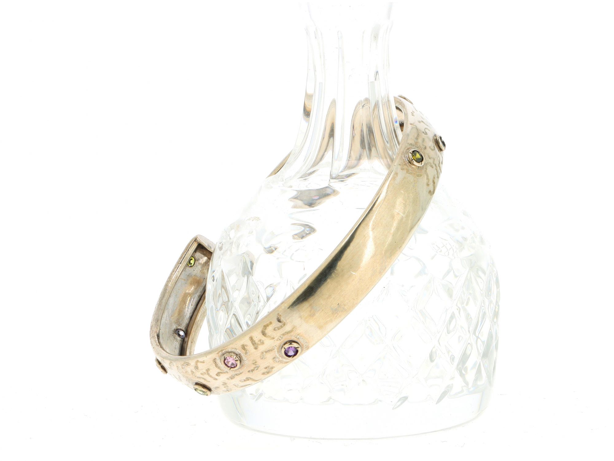 Lote 009 - Bracelete em Prata ajustável com laterais trabalhadas a cinzel e cravejadas com zicórnias multicolores, elaborado em PRATA 835. Estado de Conservação: Muito Bom. Contraste: Cabeça de Águia virada à direita 835 (1985-2020 - ao abrigo do Decreto Lei 120/2017, artigo 3.º, alínea y). Medidas (CxLxA): 6,6*1,1*5,2cm. Peso Total: 12,15g.