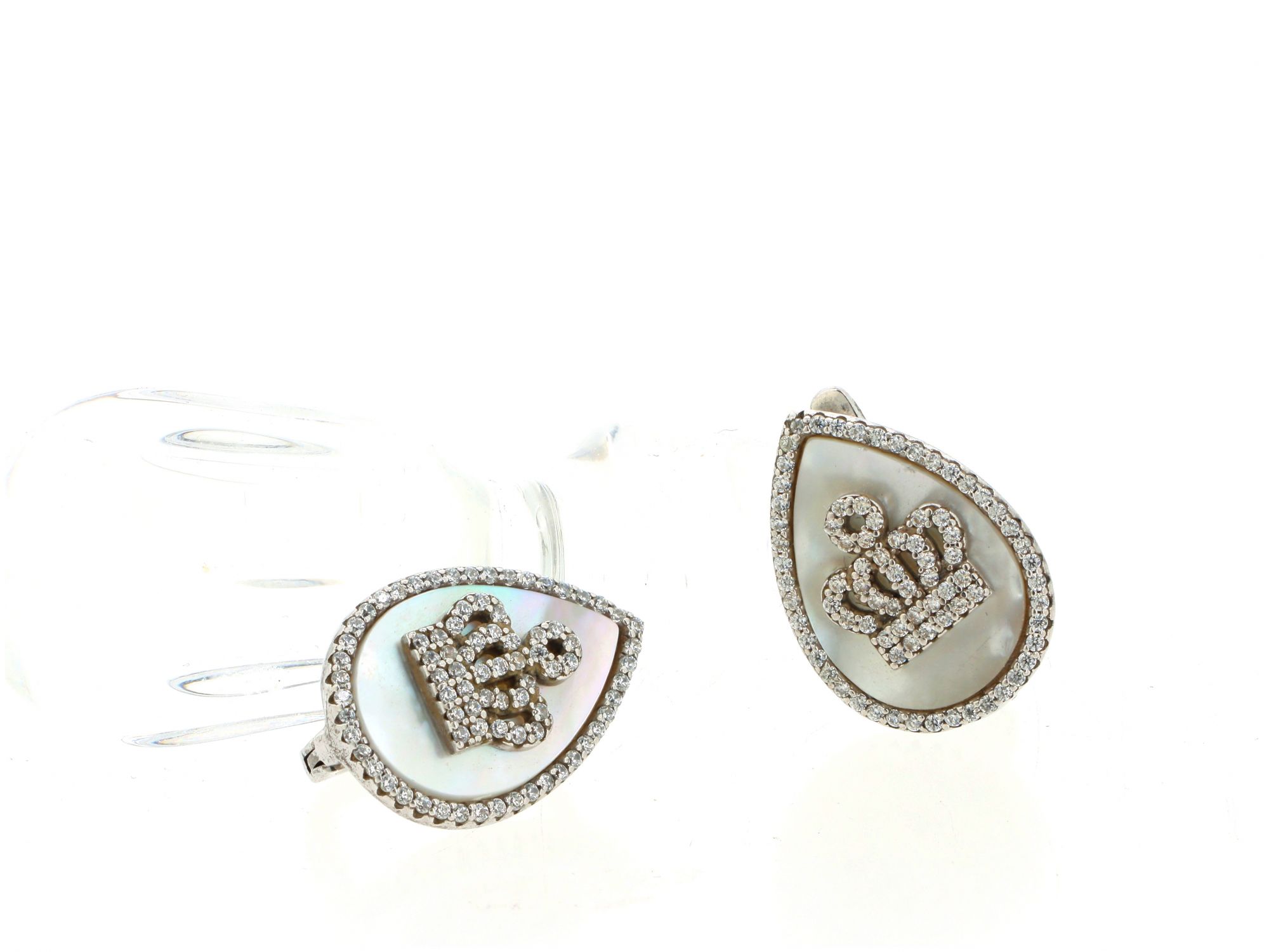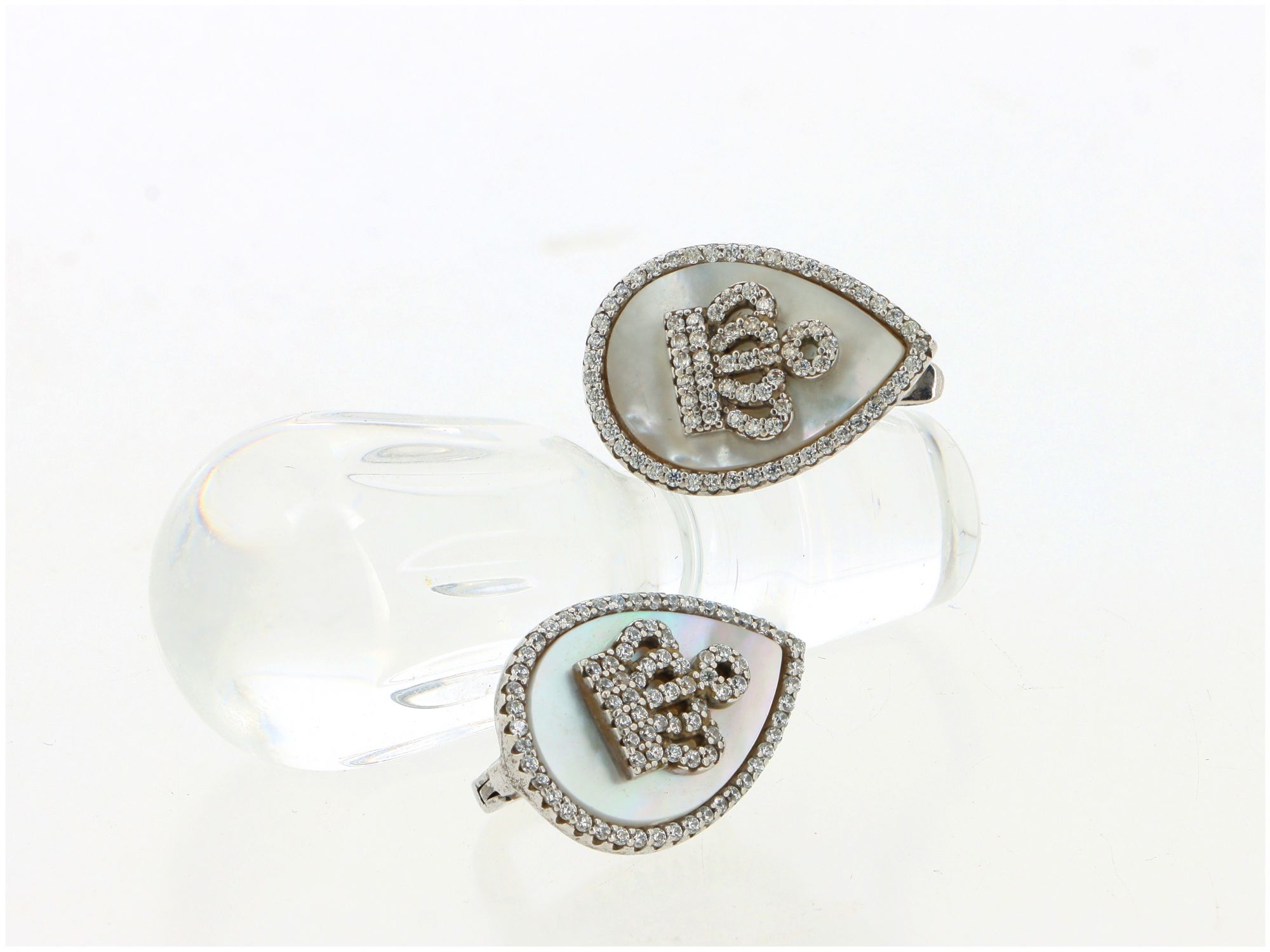 Lote 013 - Brincos em Prata de mola com formato de lágrima, com coroa cravejada de zicórnias cúbicas sobre base de madrepérola, rodeado por brilhantes, elaborado em PRATA 925. Estado de Conservação: Muito Bom, ligeiros sinais de uso. Contraste: Cabeça de Águia virada à esquerda 925 (1985-2020 - ao abrigo do Decreto Lei 120/2017, artigo 3.º, alínea y). Medidas (CxL): 2*1,5cm. Peso Total: 8,48g.