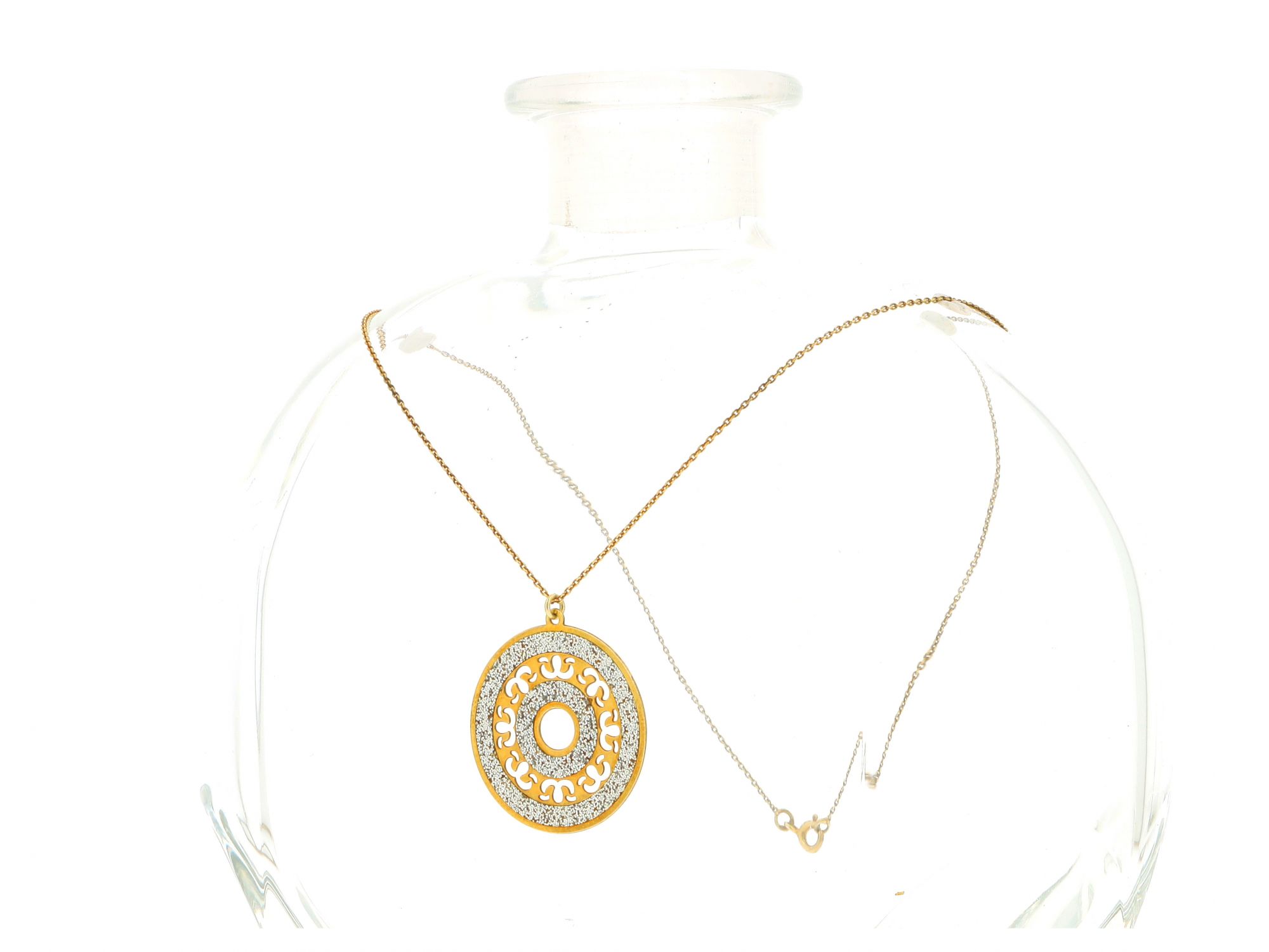 Lote 014 - Fio em Prata Dourada (banhada Ouro) de malha Cartier com medalha redonda decorativa que apresenta um padrão recortado e detalhes cintilantes no centro, elaborado em PRATA 925. Estado de Conservação: Bom. Contraste: Cabeça de Águia virada à esquerda 925 (1985-2020 - ao abrigo do Decreto Lei 120/2017, artigo 3.º, alínea y). Medidas (CxL): 40,5*3cm. Peso Total: 2,9g.