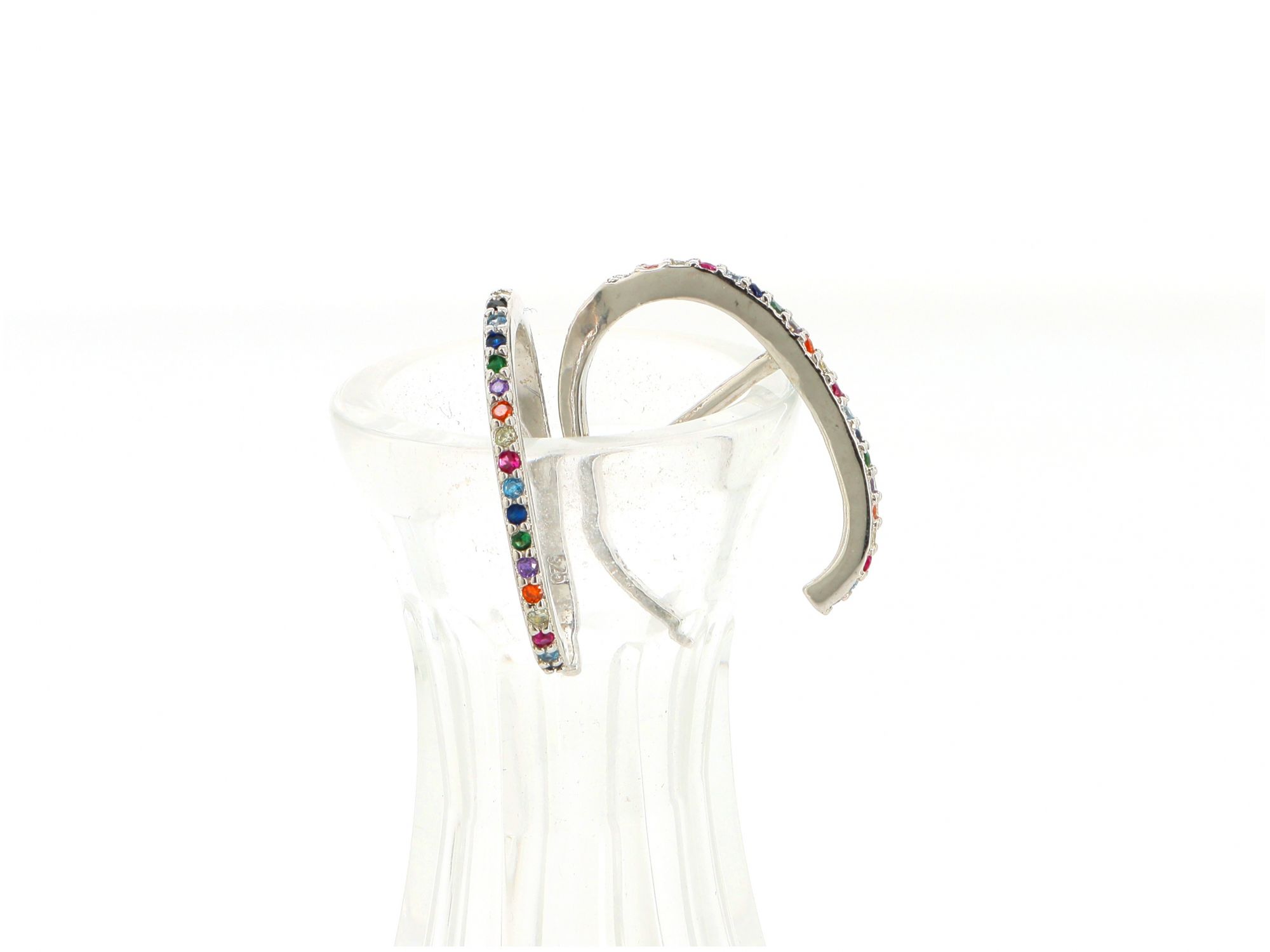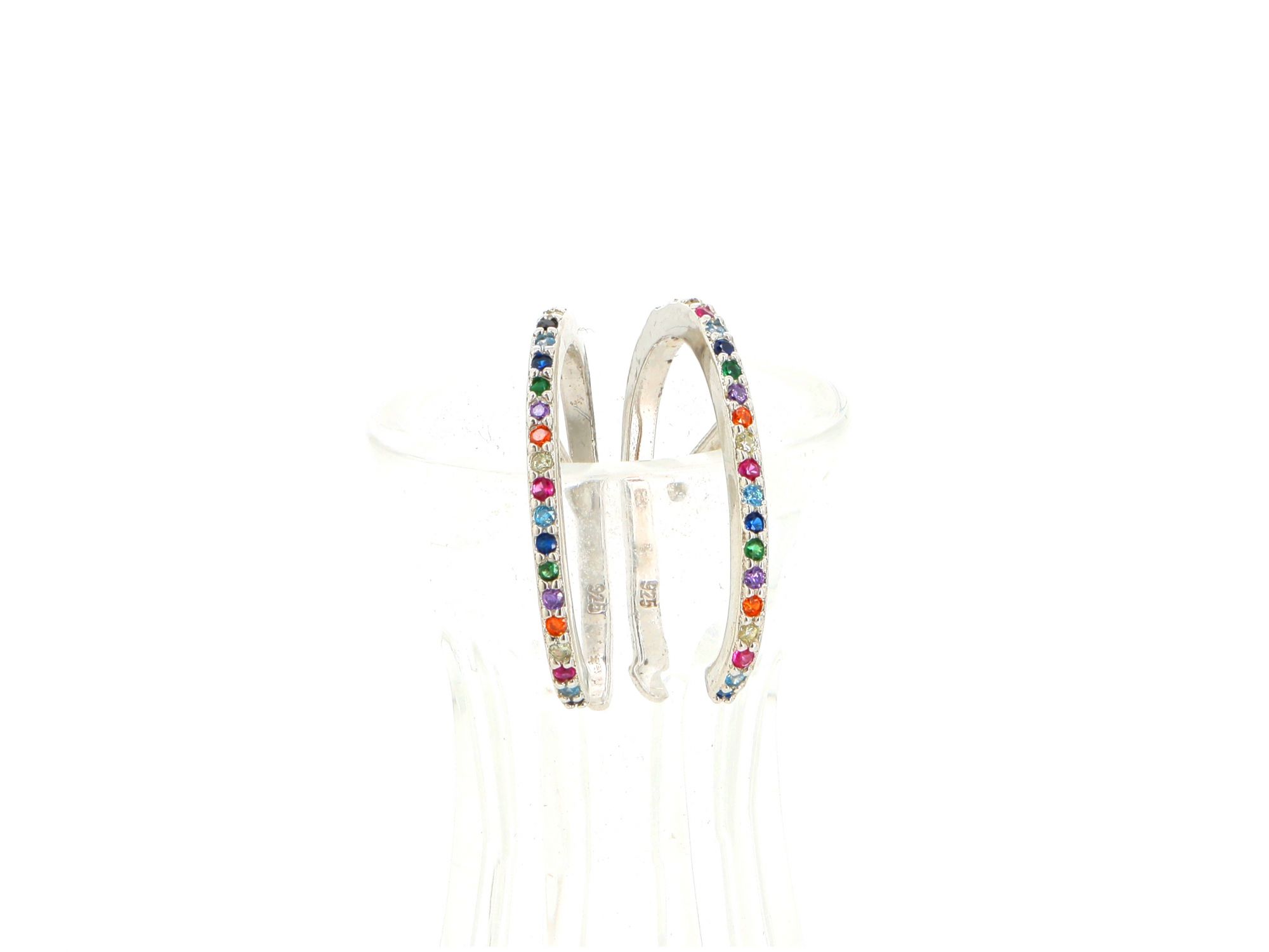 Lote 017 - Brincos em Prata de argolas abertas, cravejados com pedras multicolores, elaborado em PRATA 925. Estado de Conservação: Muito Bom. Contraste: Marca 925. (PRATA - ao abrigo do Decreto Lei 120/2017, artigo 3.º, alínea x). Medidas (Comp): 2cm. Peso Total: 1,86g.