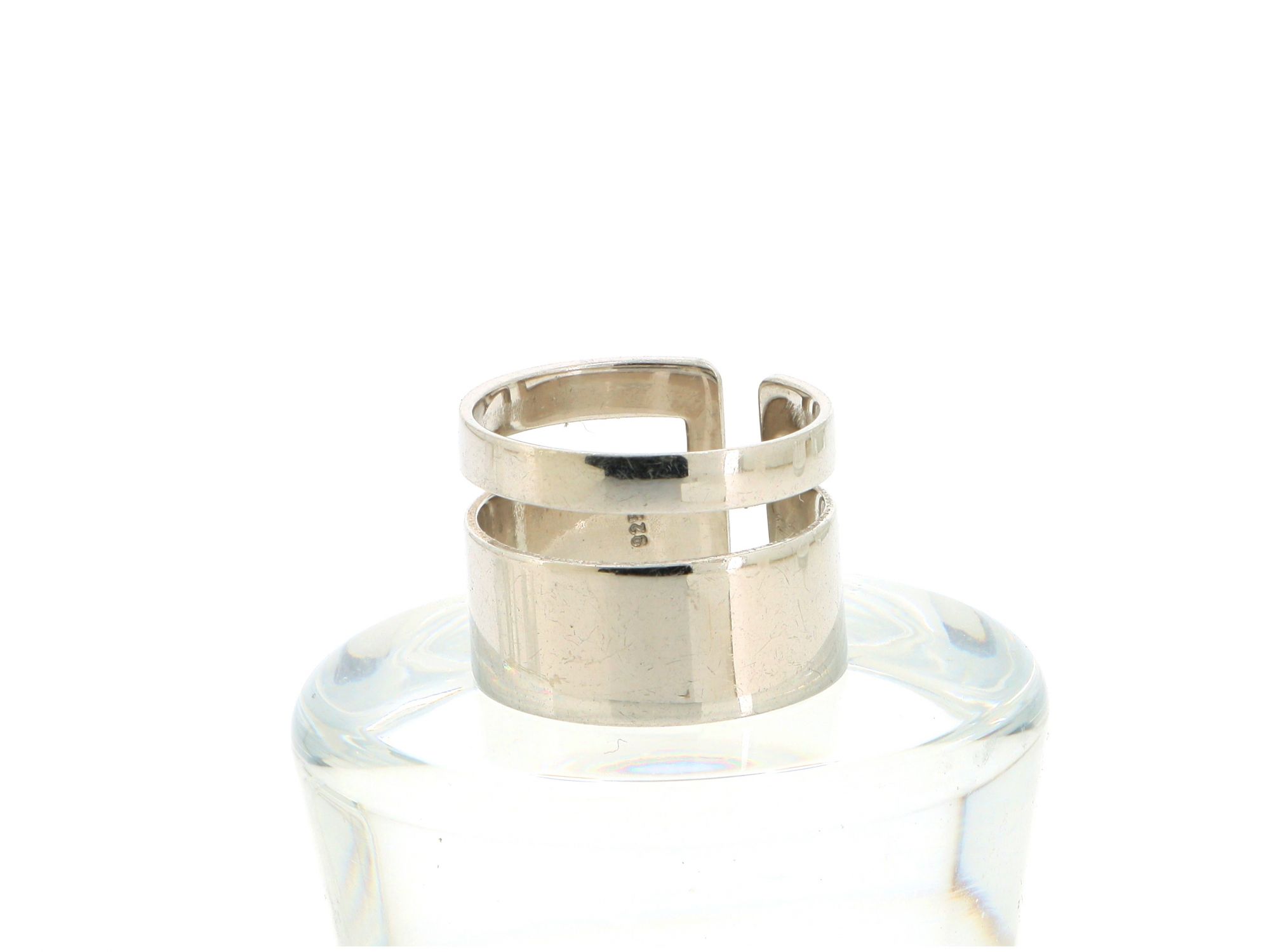 Lote 012 - Anel largo em Prata polida e ajustável com ranhura numa das laterais, elaborado em PRATA 925. Estado de Conservação: Bom, sinais de uso. Contraste: Cabeça de Águia virada à esquerda 925 (1985-2020 - ao abrigo do Decreto Lei 120/2017, artigo 3.º, alínea y). Tam.: 19. Medidas (CxLxA): 2,1*1,9*2cm. Peso Total: 6,74g.