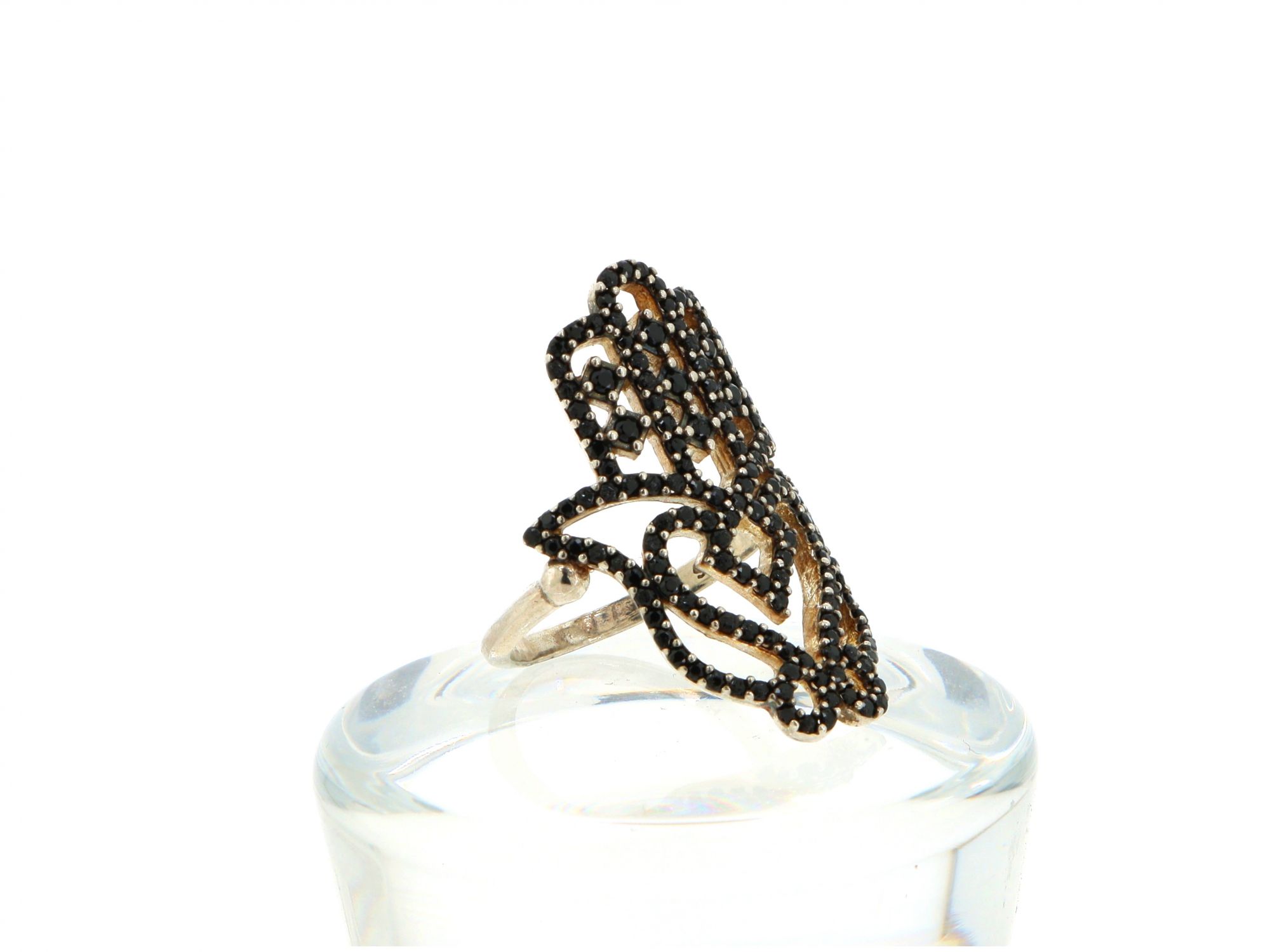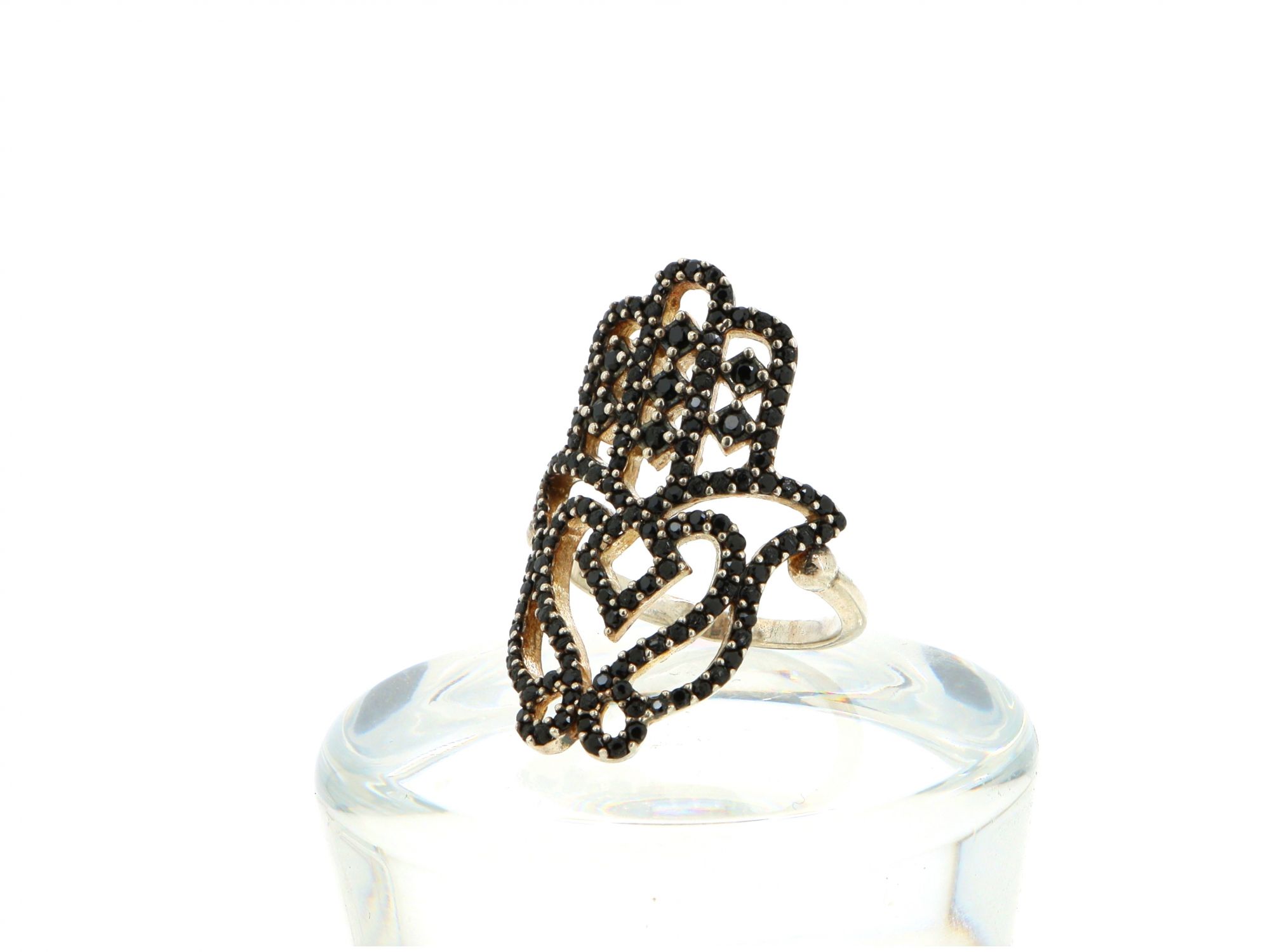Lote 019 - Anel de Prata Hamsa ou (Mão de Fátima) cravejados com zicórnias cúbicas pretas, elaborado em PRATA 925. Estado de Conservação: Excelente. Contraste: Cabeça de Águia virada à esquerda 925 (1985-2020 - ao abrigo do Decreto Lei 120/2017, artigo 3.º, alínea y). Tam.: 14,5. Medidas (CxLxA): 2*3,1*2,2cm. Peso Total: 4,36g.
