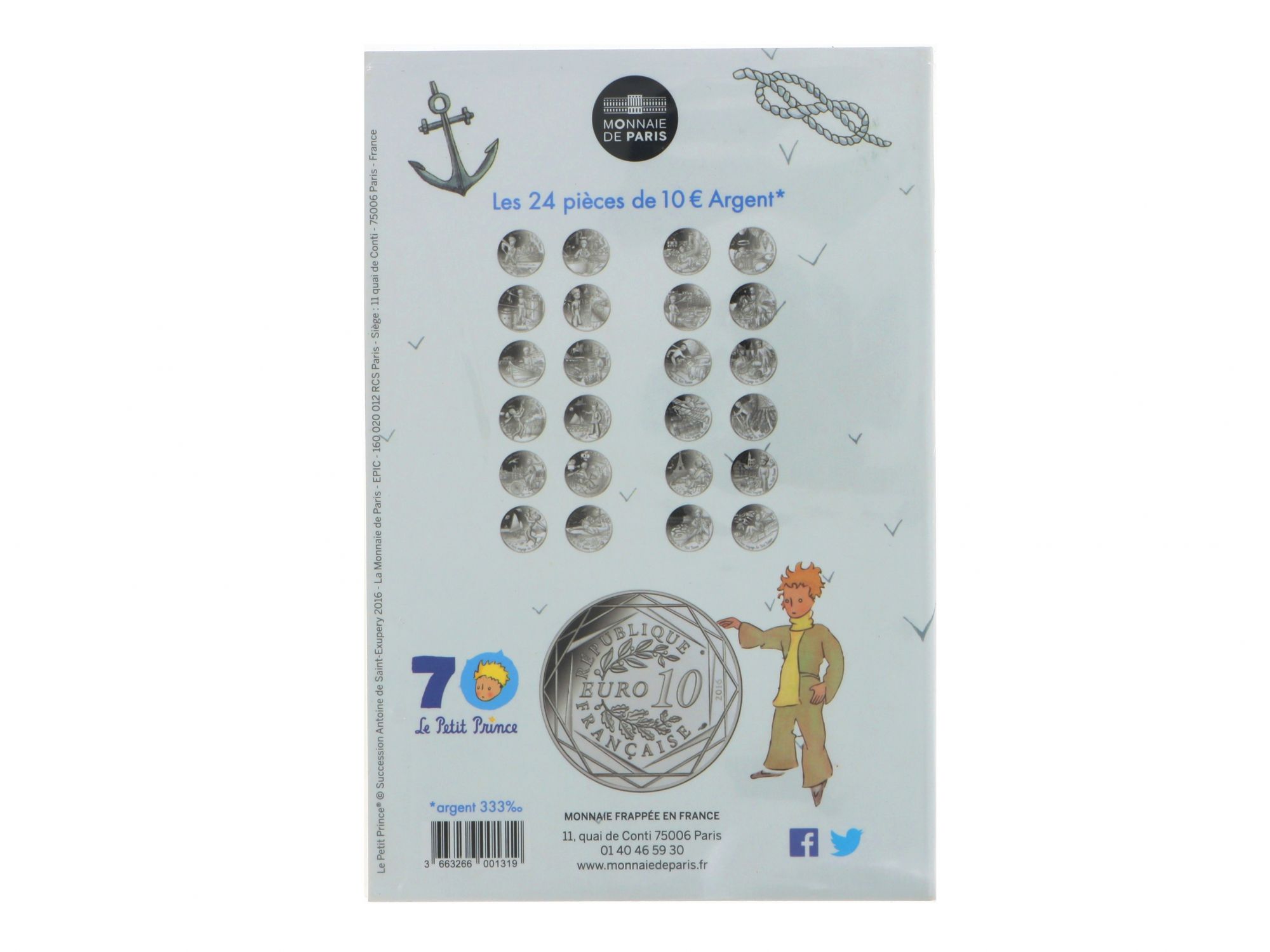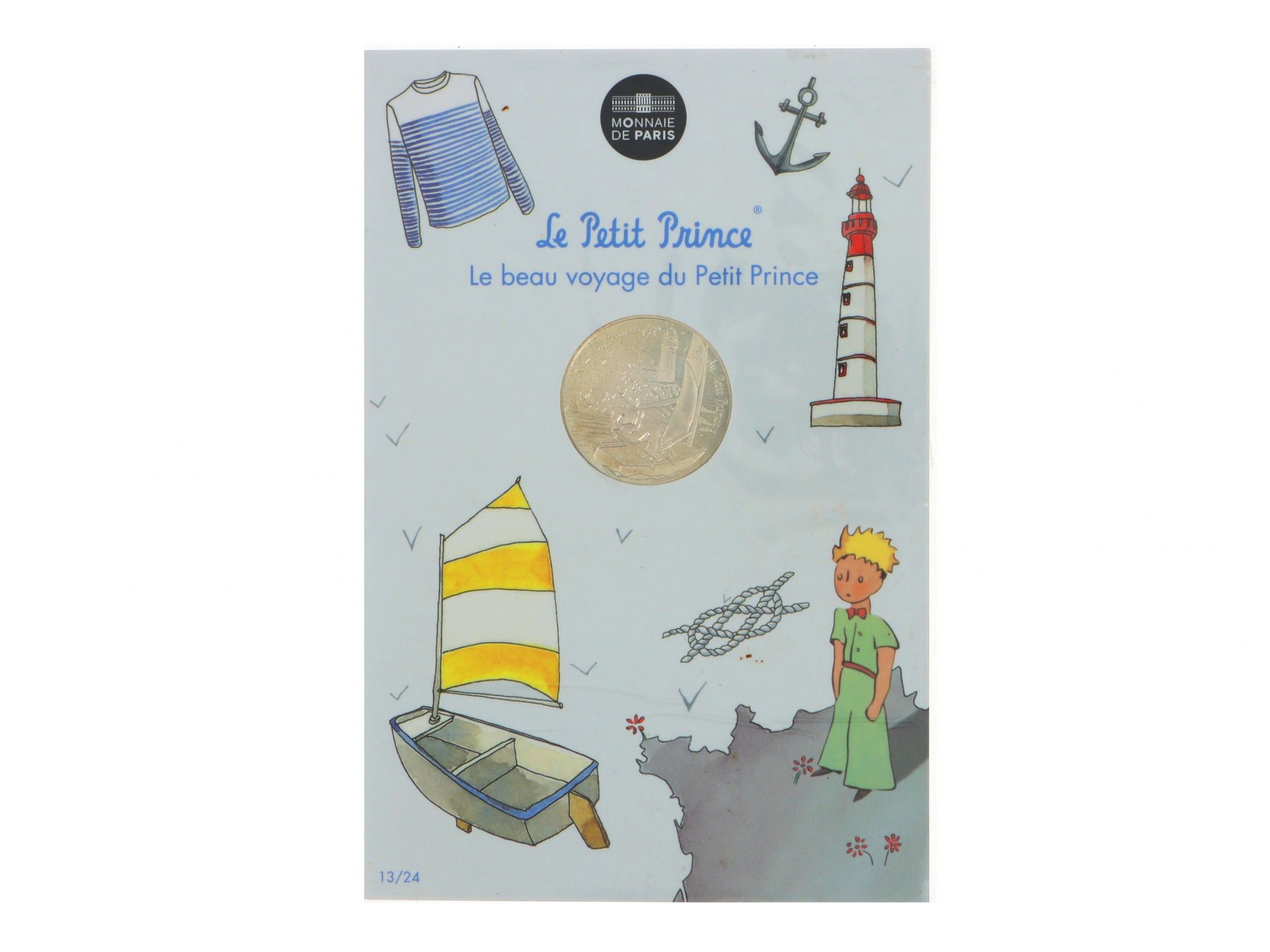 Lote 008 - Moeda Comemorativa de 10€ em Prata, da série "LE PETIT PRINCE", com tema “LE BEAU VOYAGE DU PETIT PRINCE”, nº 13/24, com cunhagem de 2016, elaborada em PRATA 333%. Estado de Conservação: Excelente. Contraste: Assinatura de artista. (ao abrigo do Decreto Lei 120/2017, artigo 3.º, alínea c). Medidas (Diâm): 3cm. Peso Total: 17g.