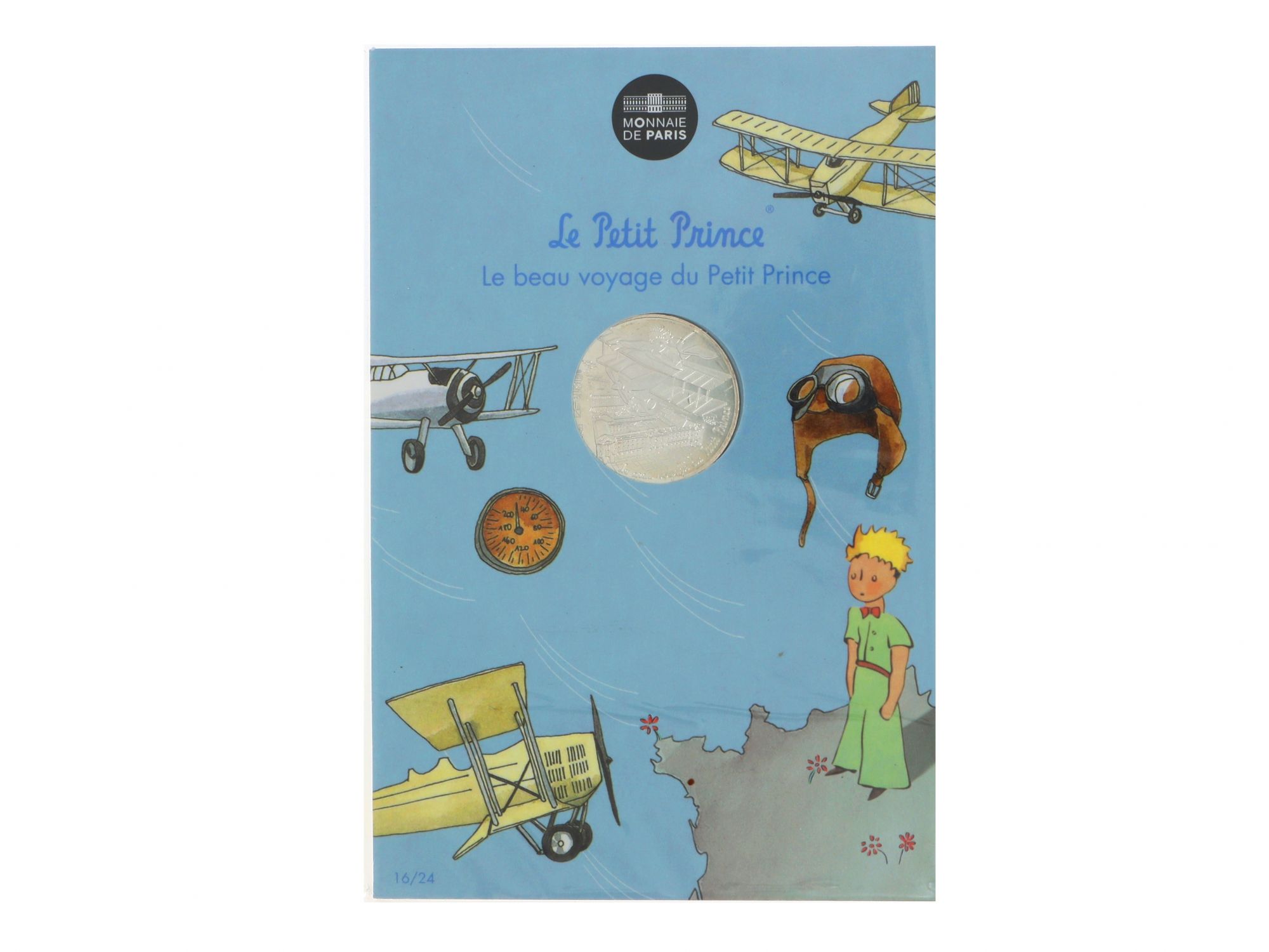 Lote 010 - Moeda Comemorativa de 10€ em Prata, da série "LE PETIT PRINCE", com tema “LE BEAU VOYAGE DU PETIT PRINCE”, nº 16/24, com cunhagem de 2016, elaborada em PRATA 333%. Estado de Conservação: Excelente. Contraste: Assinatura de artista. (ao abrigo do Decreto Lei 120/2017, artigo 3.º, alínea c). Medidas (Diâm): 3cm. Peso Total: 17g.