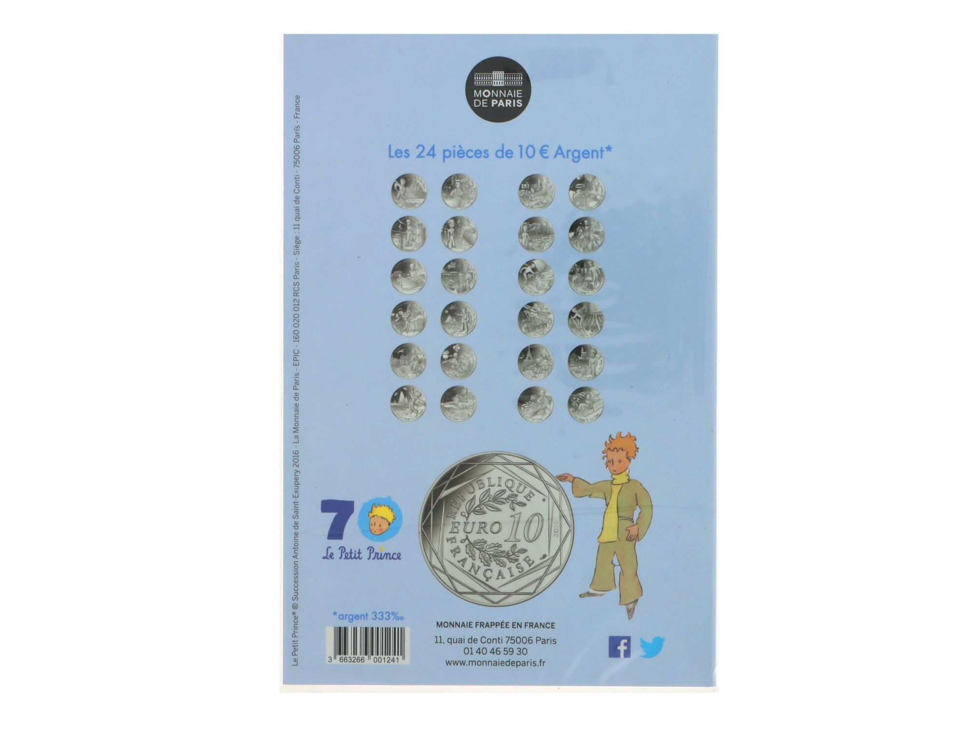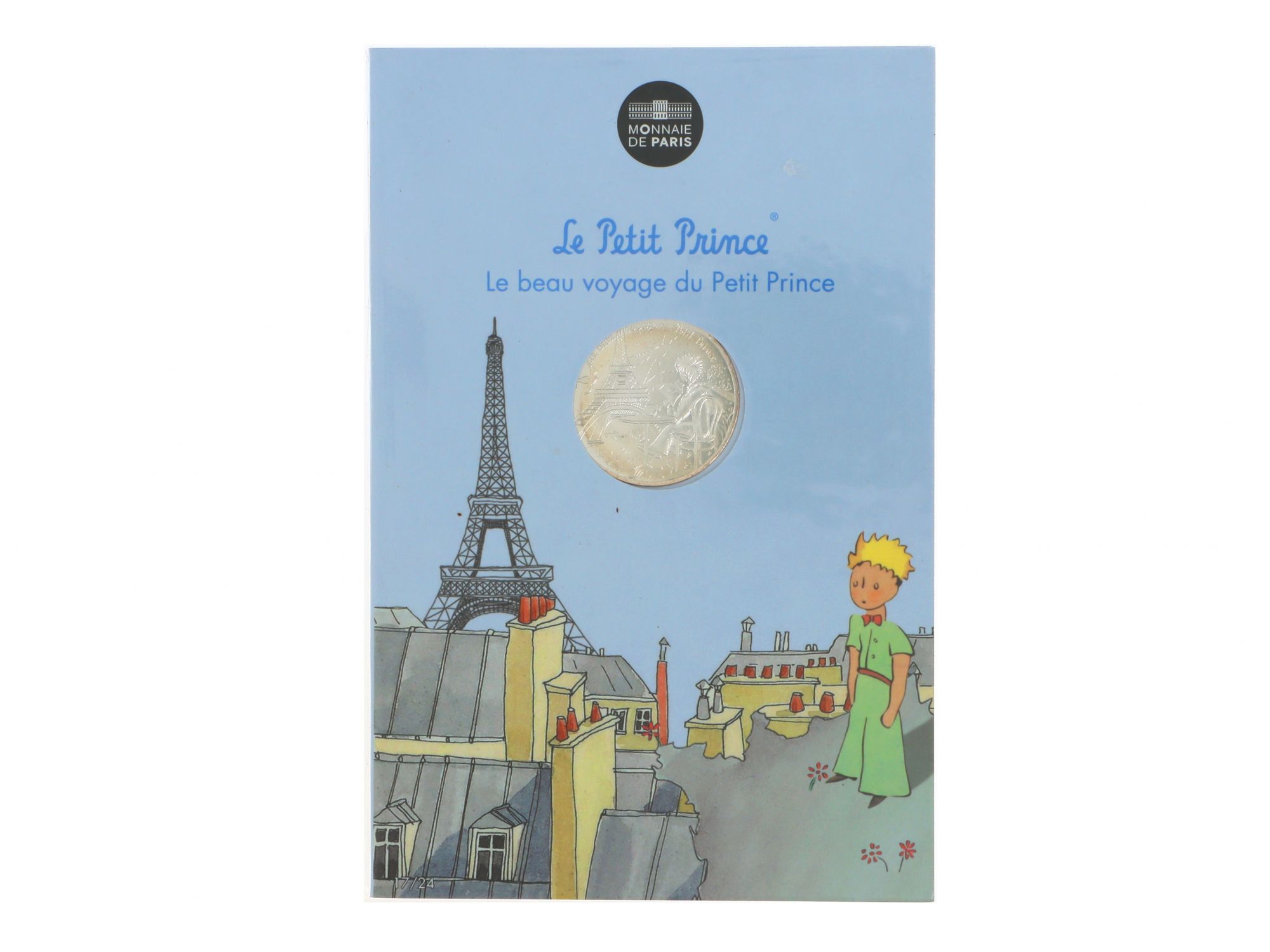 Lote 011 - Moeda Comemorativa de 10€ em Prata, da série "LE PETIT PRINCE", com tema “LE BEAU VOYAGE DU PETIT PRINCE”, nº 17/24, com cunhagem de 2016, elaborada em PRATA 333%. Estado de Conservação: Excelente. Contraste: Assinatura de artista. (ao abrigo do Decreto Lei 120/2017, artigo 3.º, alínea c). Medidas (Diâm): 3cm. Peso Total: 17g.