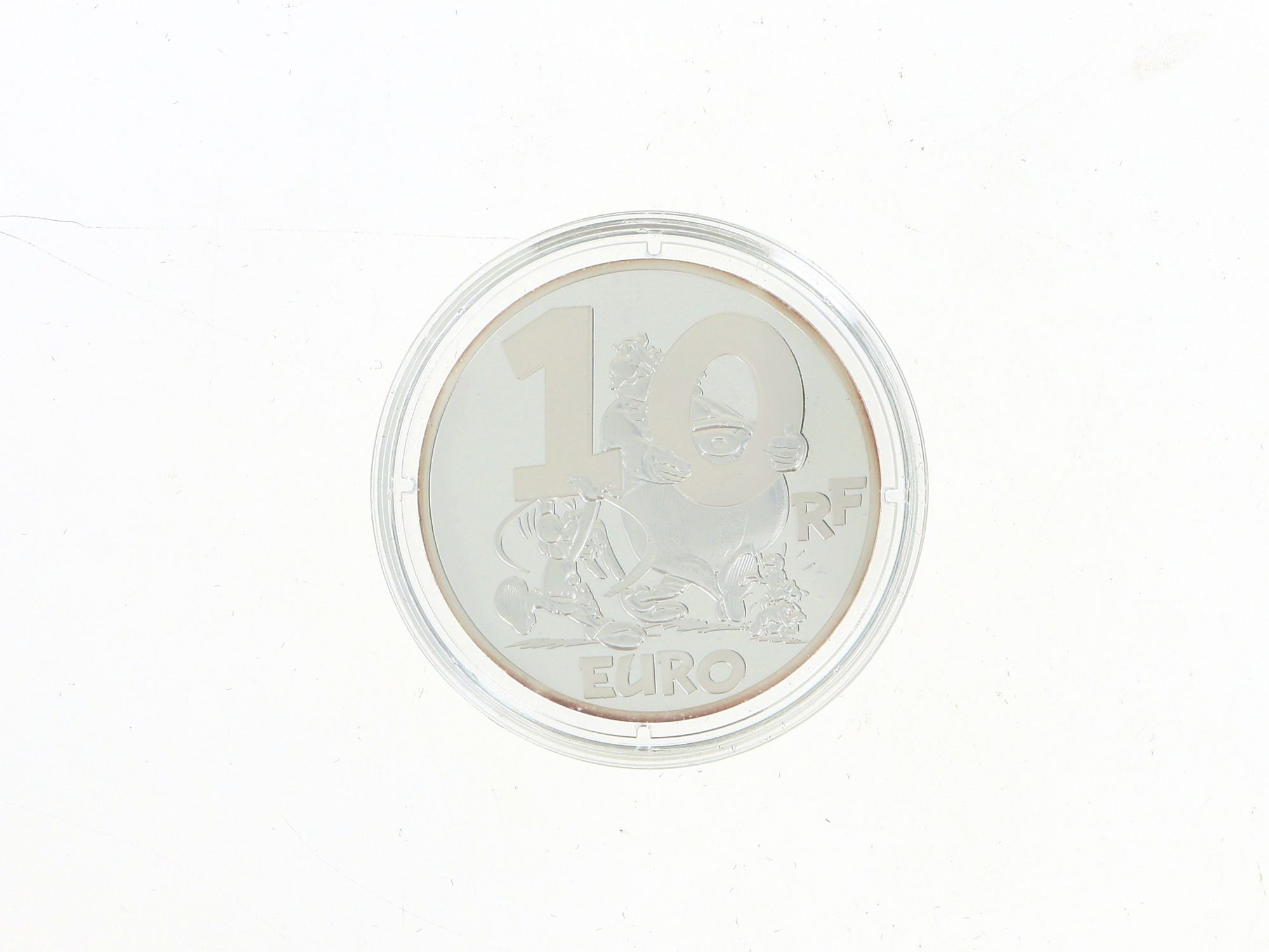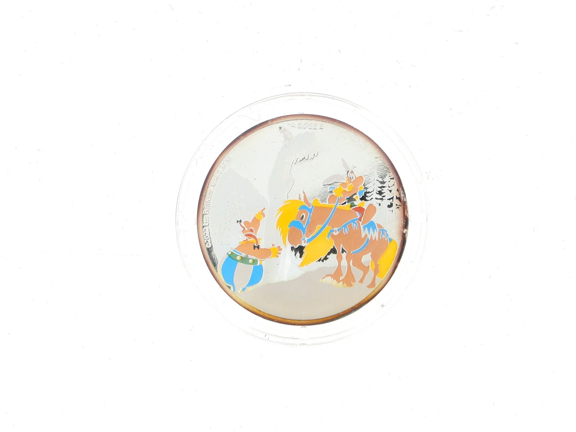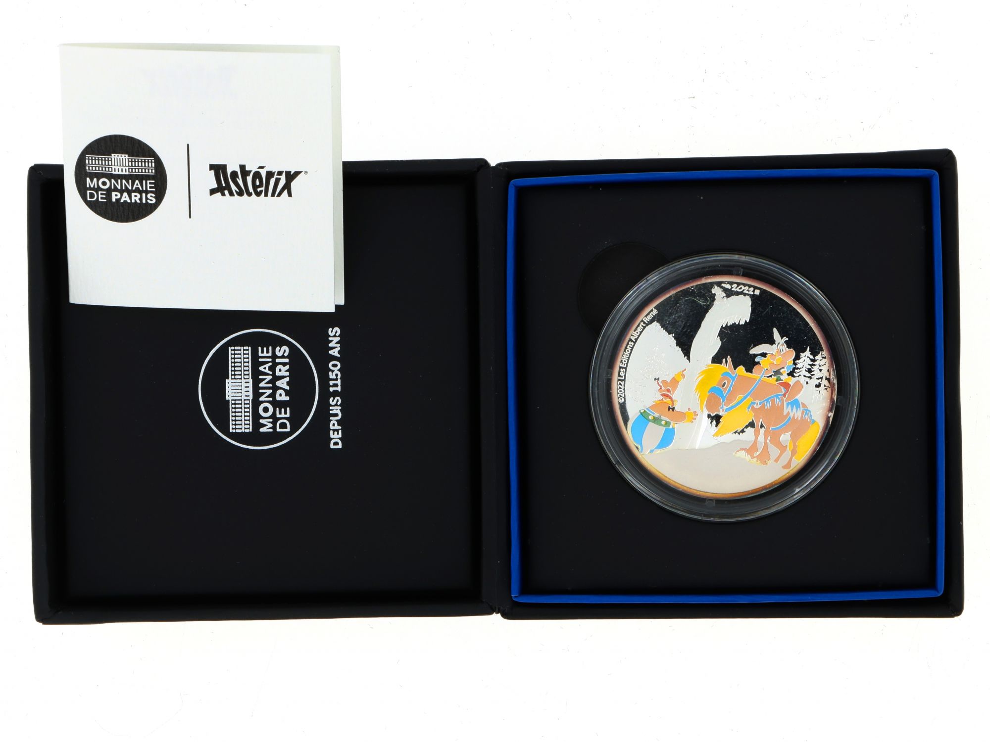 Lote 010 - Moeda em Prata de 10€, emitida em 2022 pela MONNAIE DE PARIS, com temática de ASTÉRIX, OBÉLIX e IDEIAFIX, elaborada em PRATA 999. Qualidade da moeda é “BELLE ÉPREUVE” que se refere a um acabamento de alta qualidade. Peso da Moeda é 22,2gr. Acompanhada com Certificado de Autenticidade, assinado por MARC SCHWARTZ. Estado de Conservação: Excelente. Contraste: Assinatura de artista. (ao abrigo do Decreto Lei 120/2017, artigo 3.º, alínea c). Medidas (Diâm): 37cm. Peso Total: 82,81g. Peso Prata : 22.14gr.