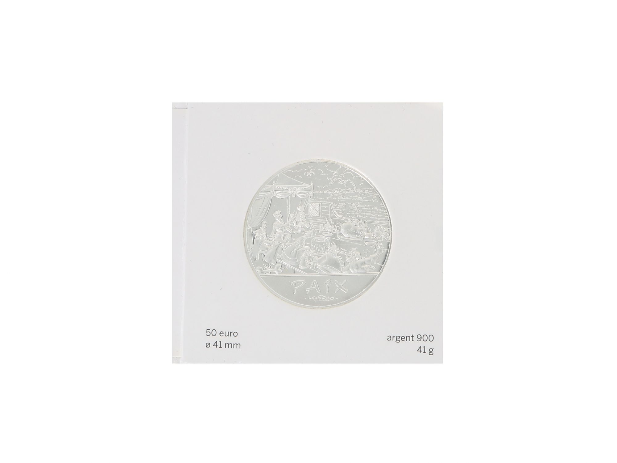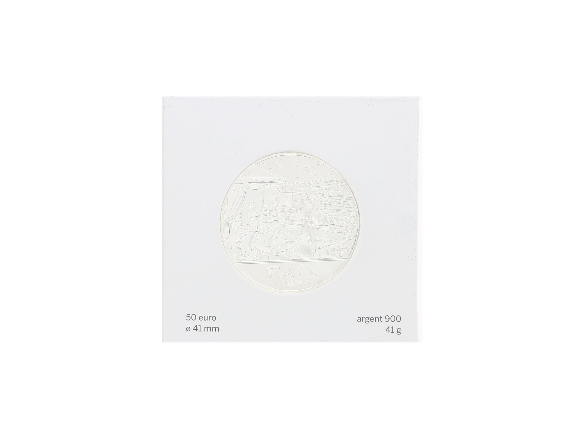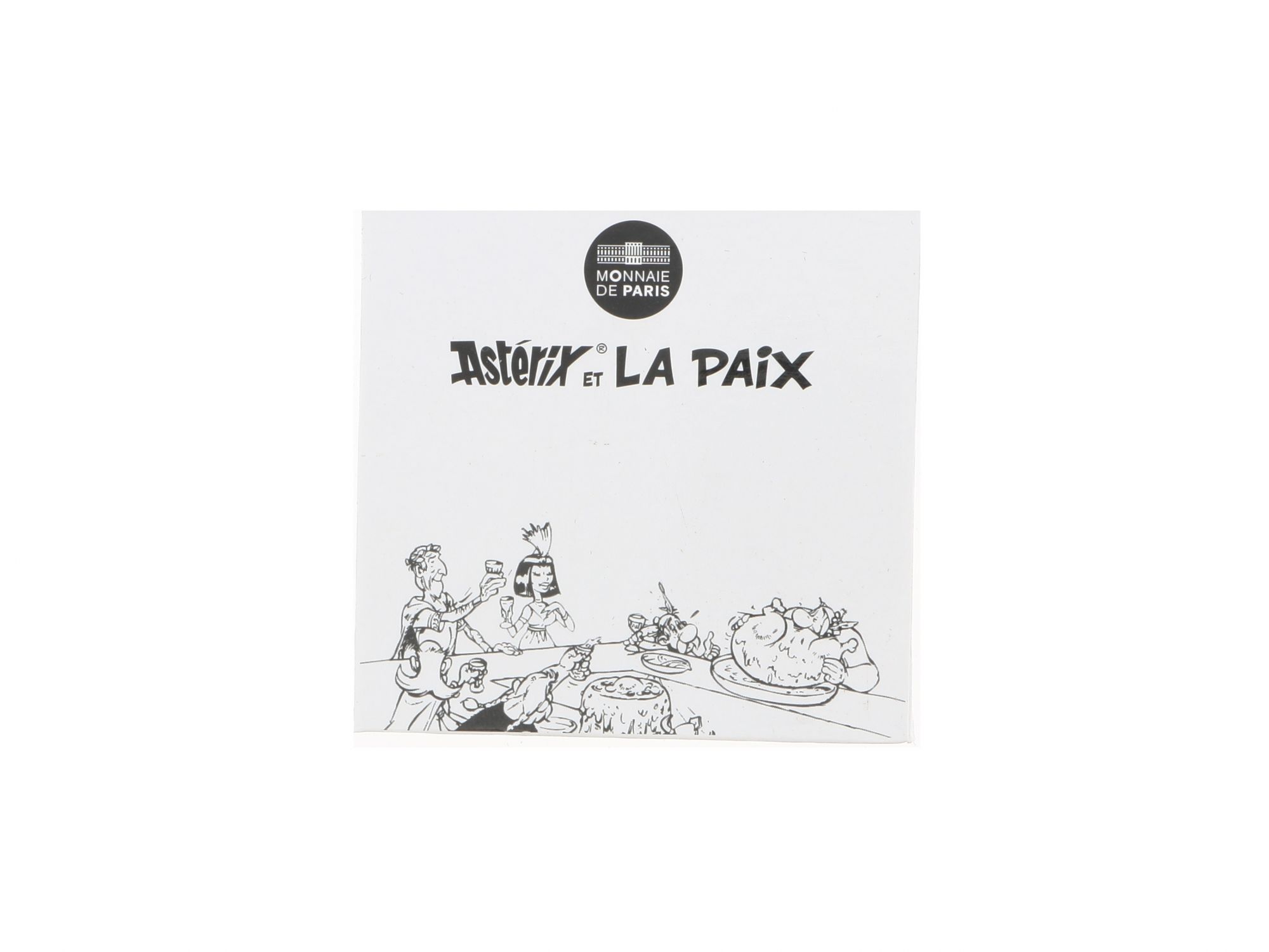 Lote 046 - Moeda Comemorativa de 50€ em Prata, da série ASTÉRIX, com tema “ASTÉRIX ET LA PAIX”, com cunhagem de 2015, elaborada em PRATA 900. Sua embalagem apresenta uma ilustração de banquete entre algumas personagens da banda desenhada. Peso da moeda 41gr. Estado de Conservação: Excelente, como novo. Contraste: Marca 900. (PRATA - ao abrigo do Decreto Lei 120/2017, artigo 3.º, alínea x). Medidas (CxLxA): 7,3*7,2*0,8cm. Peso Total: 69,88g.