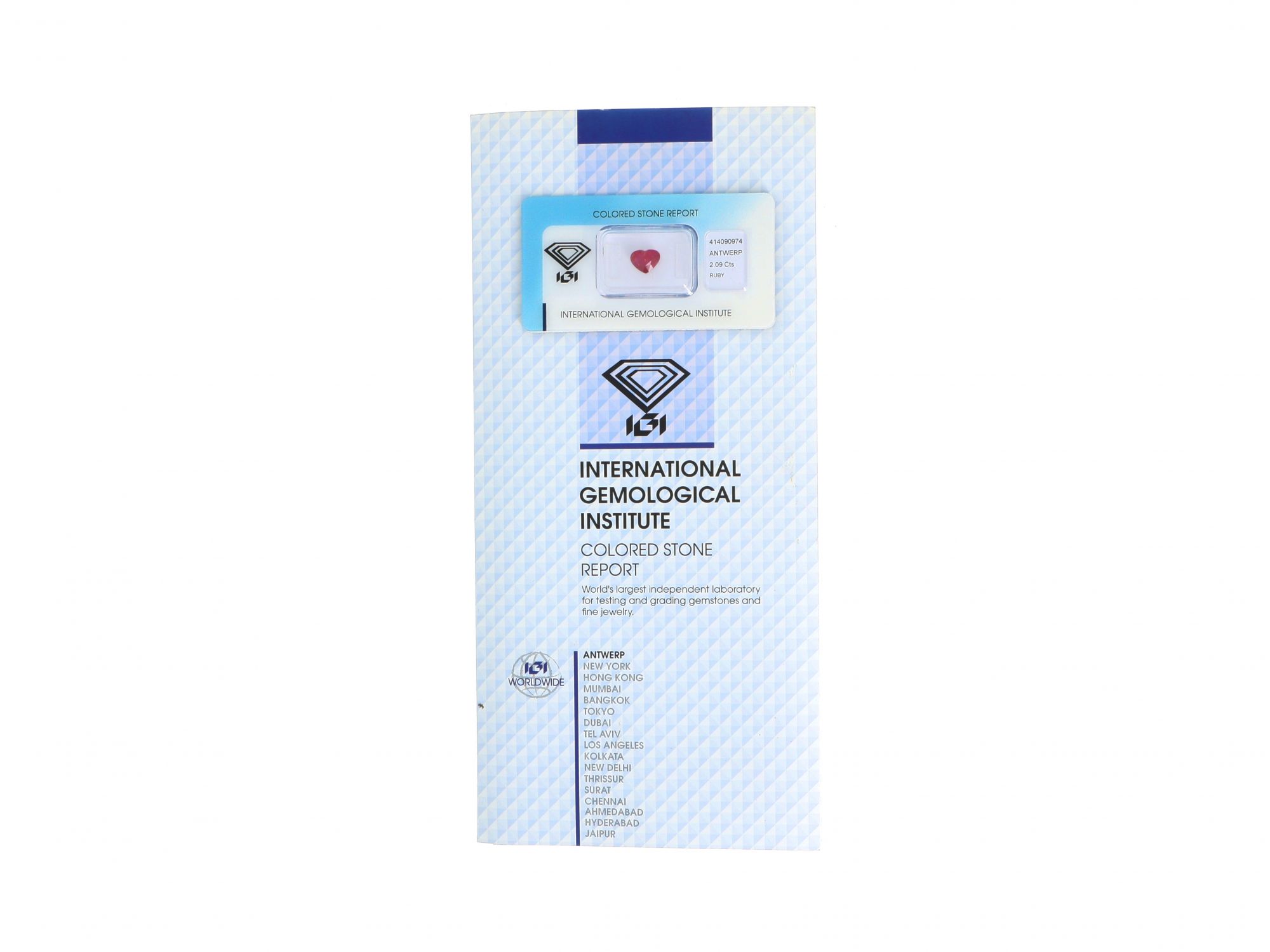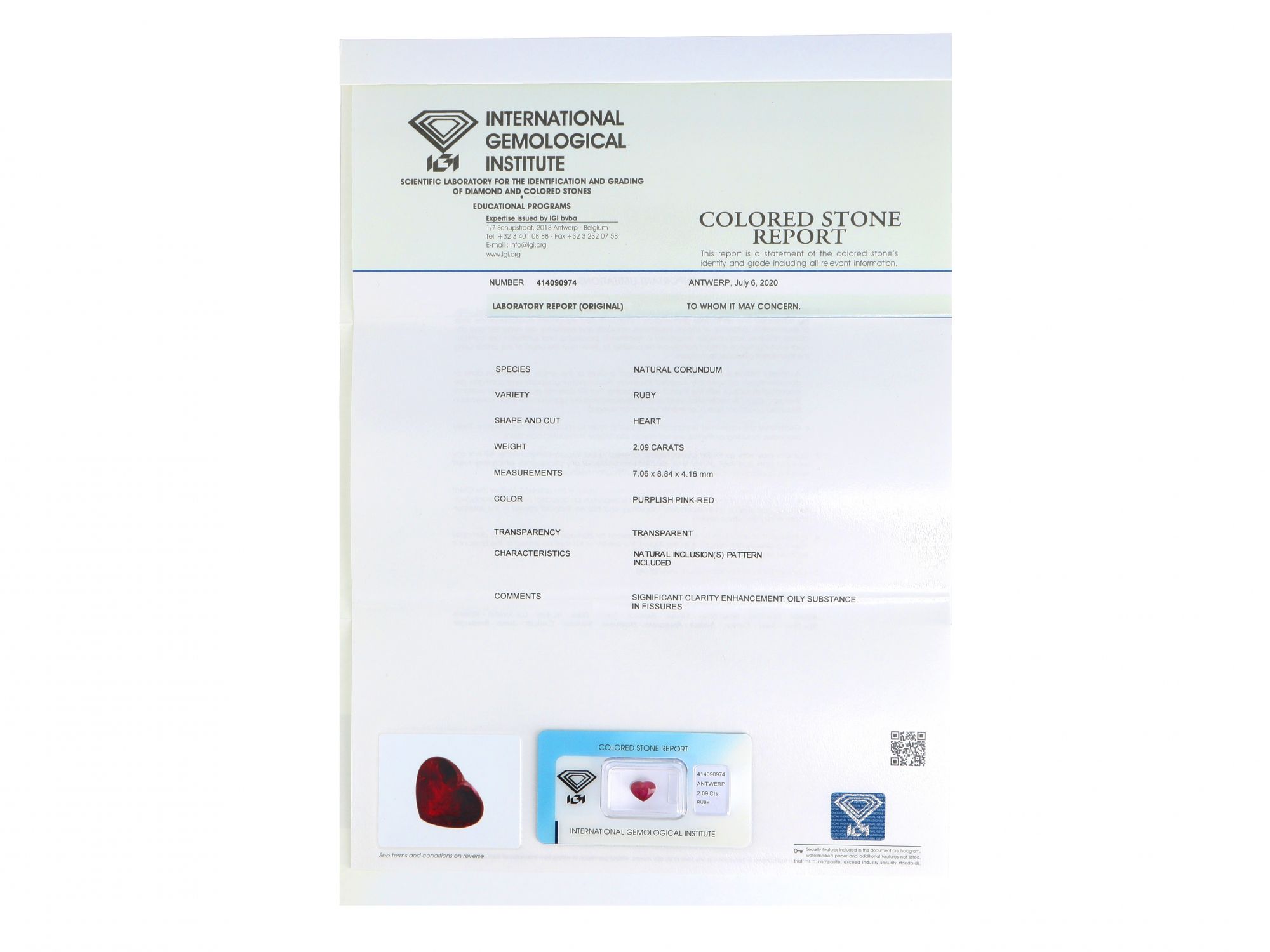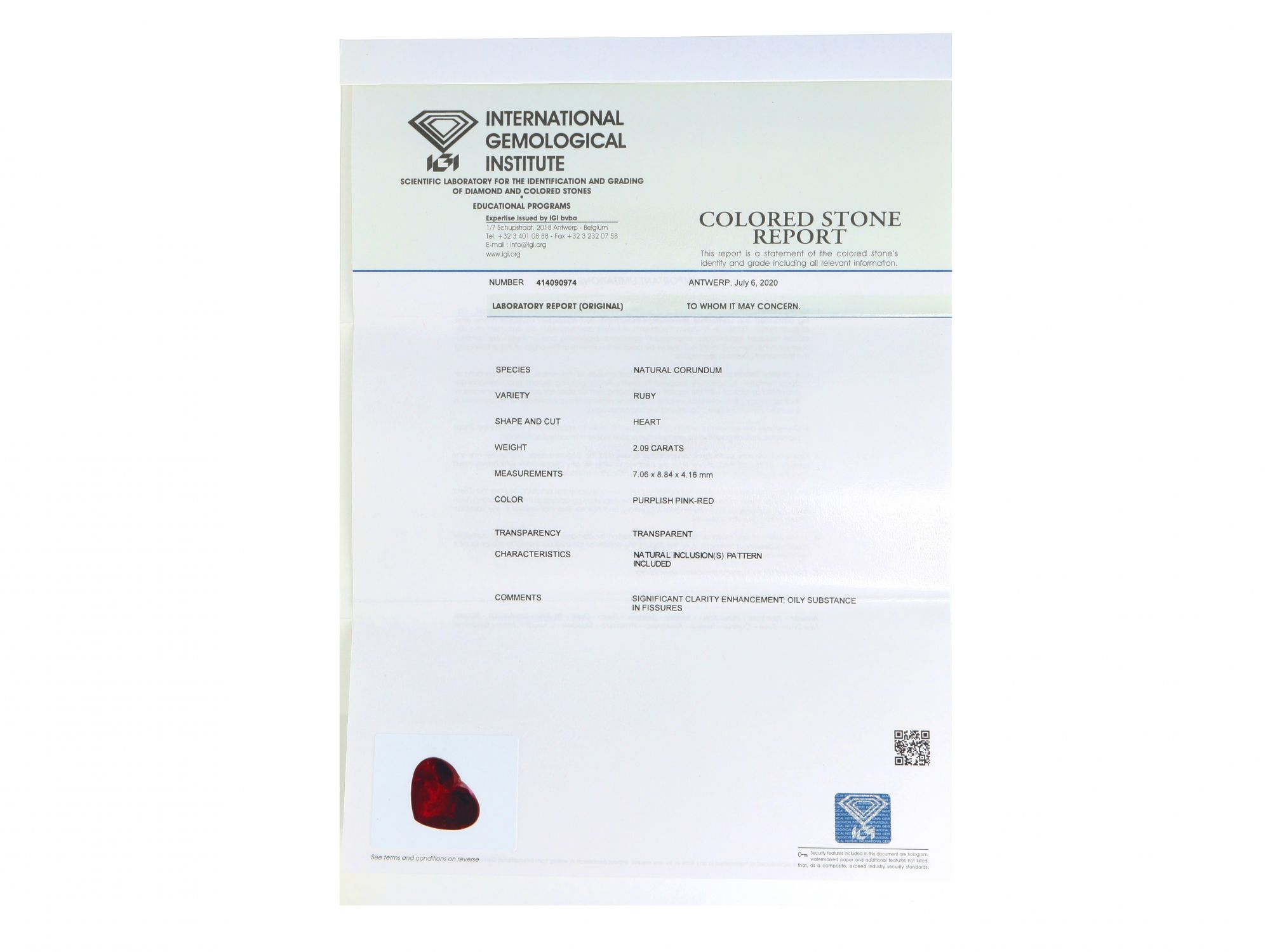 Lote 027 - Rubi Natural, em talhe coração, cor "Purplish Pink-Red", transparente. Com tratamento de claridade. Para mais informações, consultar certificado. Com Certificado IGI Antwerpia Nº 414090974. Gema em invólucro selado. Estado de Conservação: Excelente.Medidas (CxLxA): 7.06 x 8.84 x 4.16mm. Peso Total: 2,09ct.