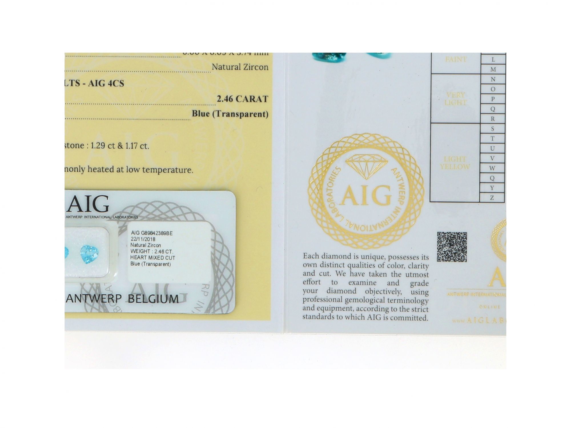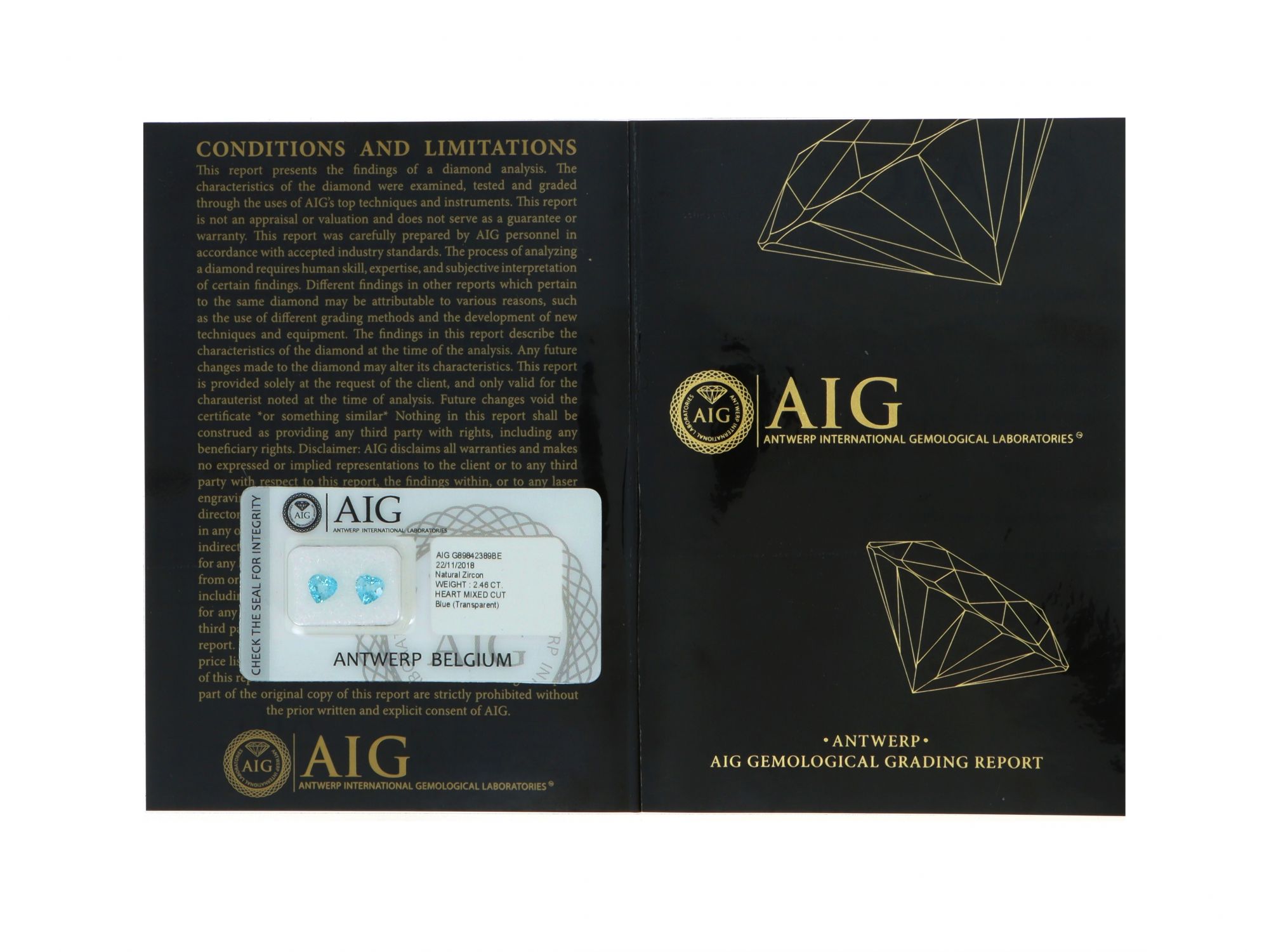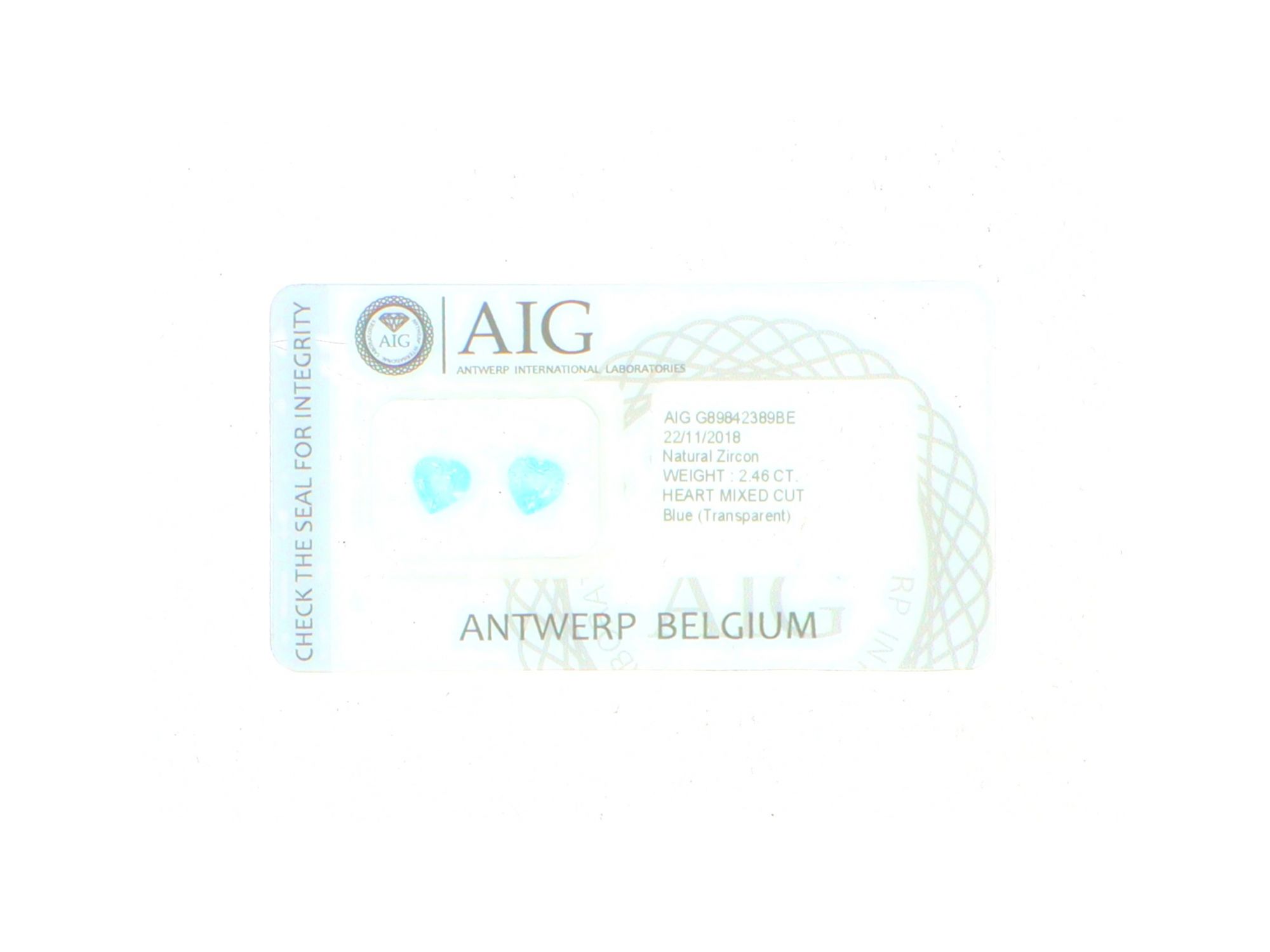 Lote 051 - Pedras Zircónia Natural, em talhe Coração, com o peso de 1.29 ct e 1,17 ct, cor azul, transparente, Com certificado AIG (Antwerp International Gemological Laboratories) Nº G89842389BE. Gema em invólucro selado. Estado de Conservação: Excelente. Medidas (CxLxA): 5.96 x 6.04 x 3.56 mm e 6.00 x 6.09 x 3.74mm. Peso Total (ct): 2,46.