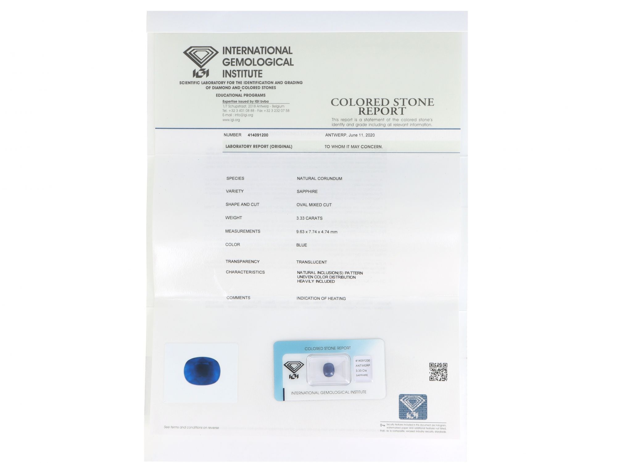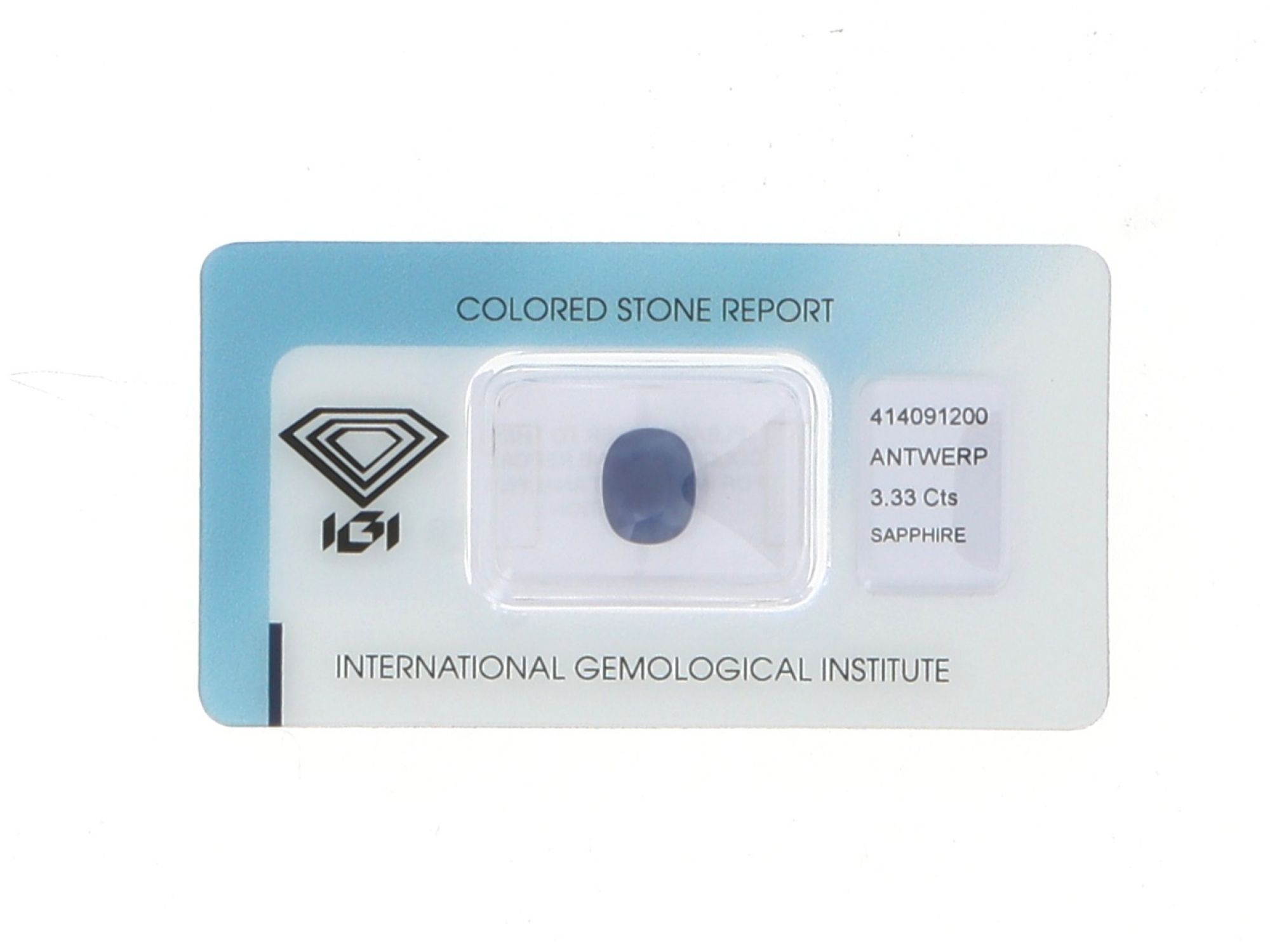 Lote 027 - Pedra Safira Natural, em talhe Oval, cor azul, translucente. Com tratamento por alta temperatura. Com Certificado IGI Antwerpia Nº 414091200. Gema em invólucro selado. Estado de Conservação: Excelente. Medidas (CxLxA): 9.63*7.74*4.74 mm. Peso Total (ct): 3,33.