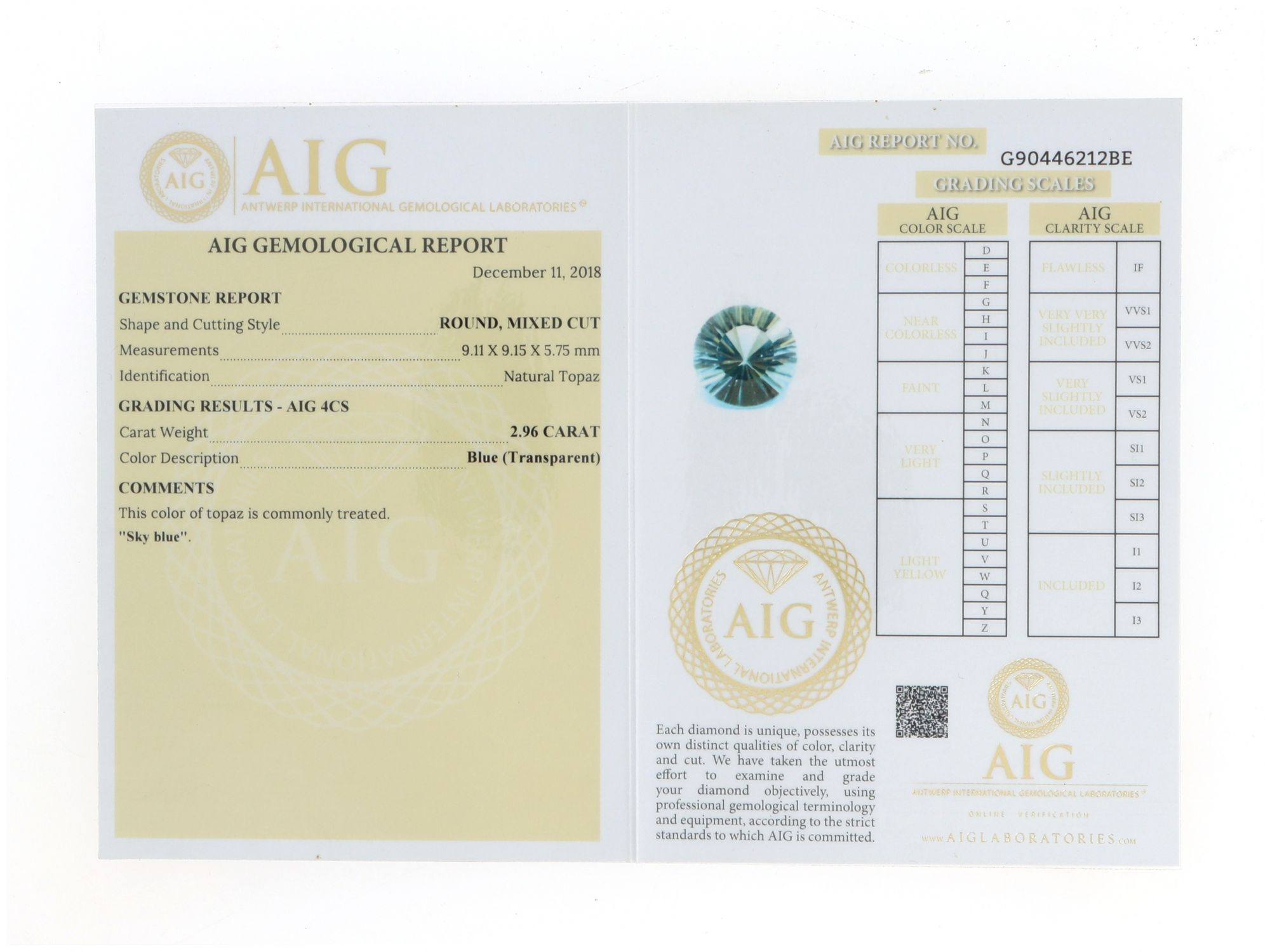Lote 012 - Topázio Natural, em talhe Redondo, cor "Sky Blue", transparente. Qualidade Exepcional de Talhe. Para mais informações, consultar certificado. Com certificado AIG (Antwerp International Gemological Laboratories) Nº G90446212BE. Gema em invólucro selado. Estado de Conservação: Excelente.Medidas (CxLxA): 9.11 x 9.15 x 5.75mm. Peso Total: 2,96ct.