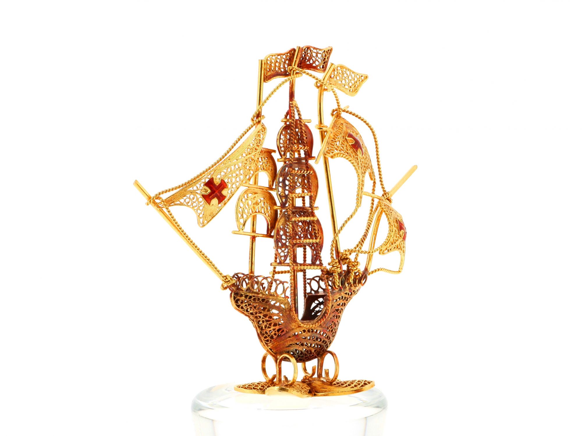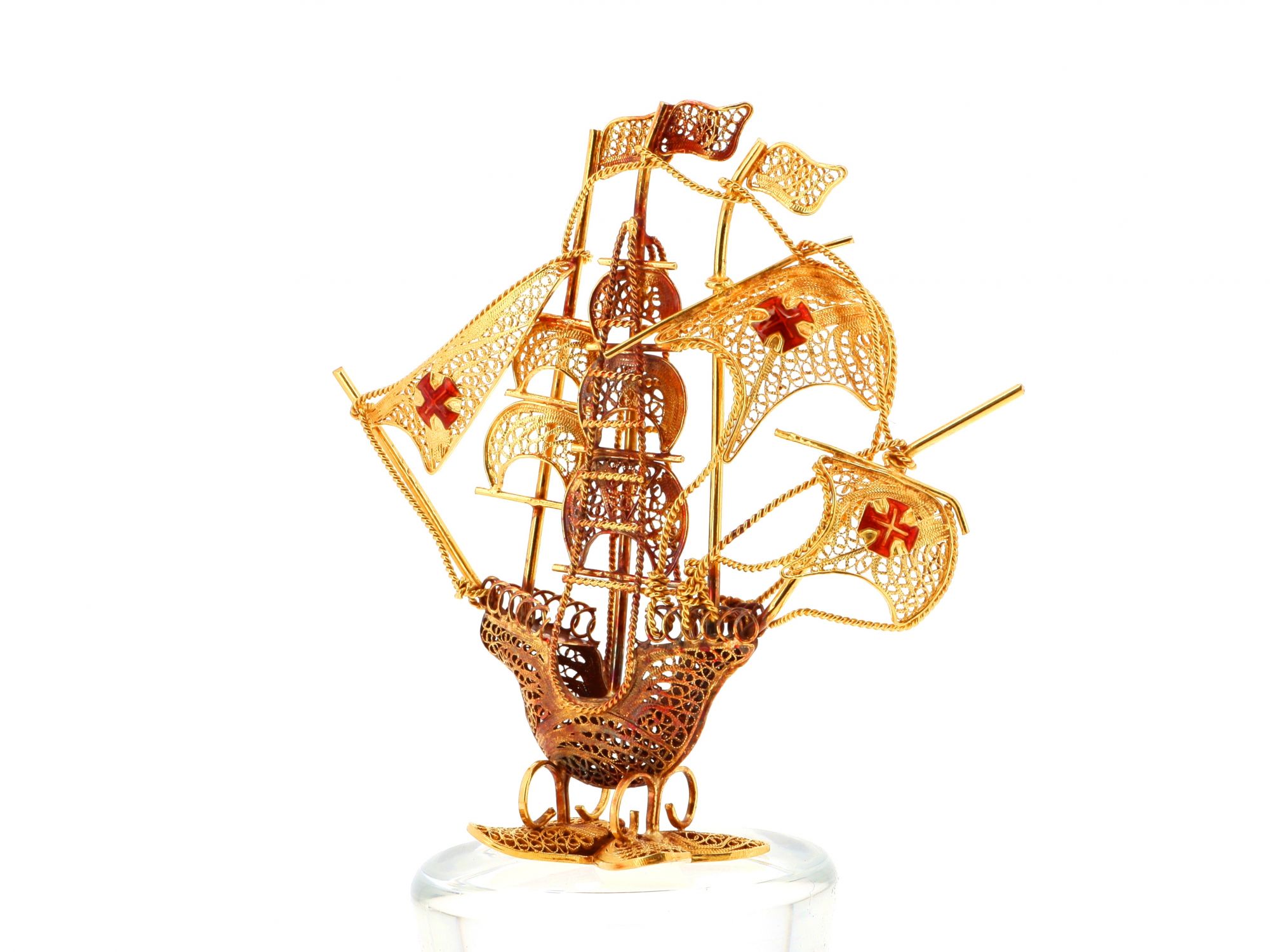 Lote 005 - Caravela em Ouro, trabalhado à mão em FILIGRANA Portuguesa com velas esmaltadas com a Cruz de Cristo, elaborado em OURO 19,2 QUILATES. Estado de Conservação: Bom, sinais de uso. Contraste: Cabeça de Veado 800 (OURO - 1985-2020, ao abrigo do Decreto Lei 120/2017, artigo 3.º, alínea y). Medidas (LxA): 7,8*7,5cm. Peso Total: 25,24g.