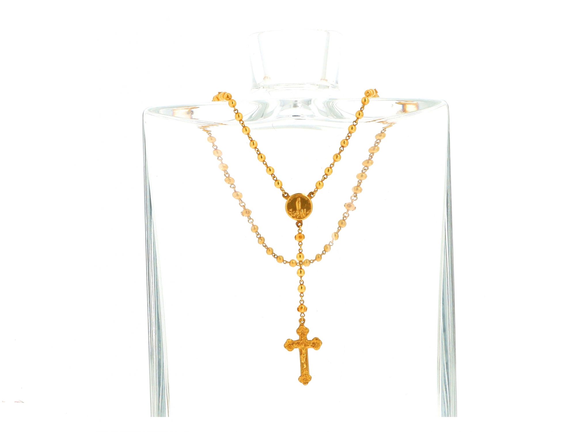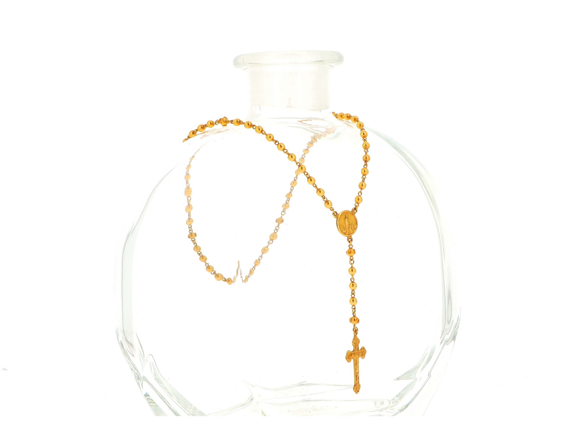 Lote 049 - Terço em Ouro de contas lisas intercaladas com contas de Viana, elaborado em OURO 19,2 QUILATES. Estado de Conservação: Bom, sinais de uso. Contraste: Cabeça de Veado 800 (OURO - 1985-2020, ao abrigo do Decreto Lei 120/2017, artigo 3.º, alínea y). Medidas (Comp): 23,5cm. Peso Total: 7,87g.
