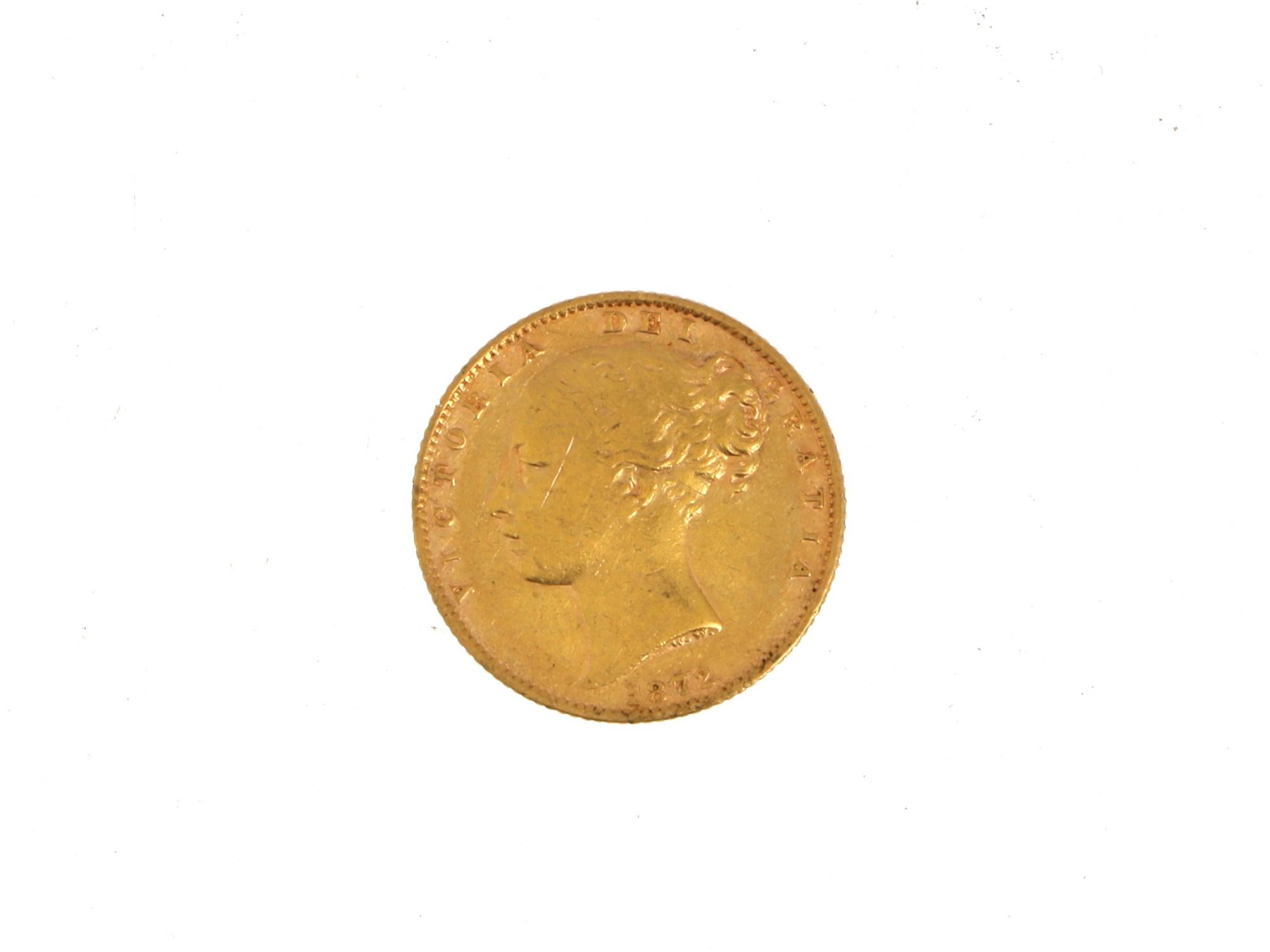 Lote 050 - Moeda Libra em Ouro, datada em 1872, com anverso de retrato da Rainha VICTORIA DEI GRATIA e reservo com BRASÃO, elaborado em OURO 22 QUILATES. Estado de Conservação: Bom, sinais de uso. Contraste: Marca 916. (OURO - ao abrigo do Decreto Lei 120/2017, artigo 3.º, alínea x). Medidas (Diâm): 2,2cm. Peso Total: 7,93g.