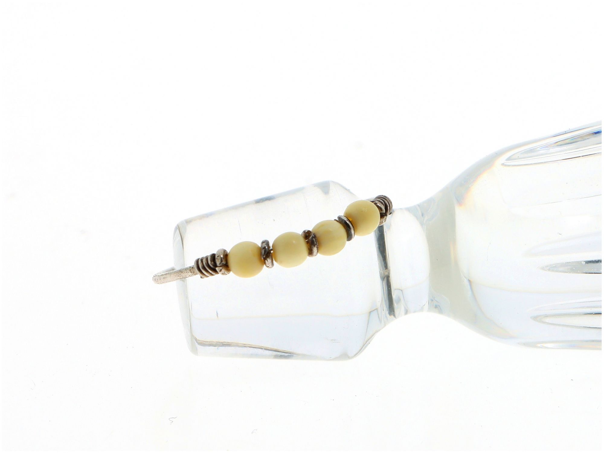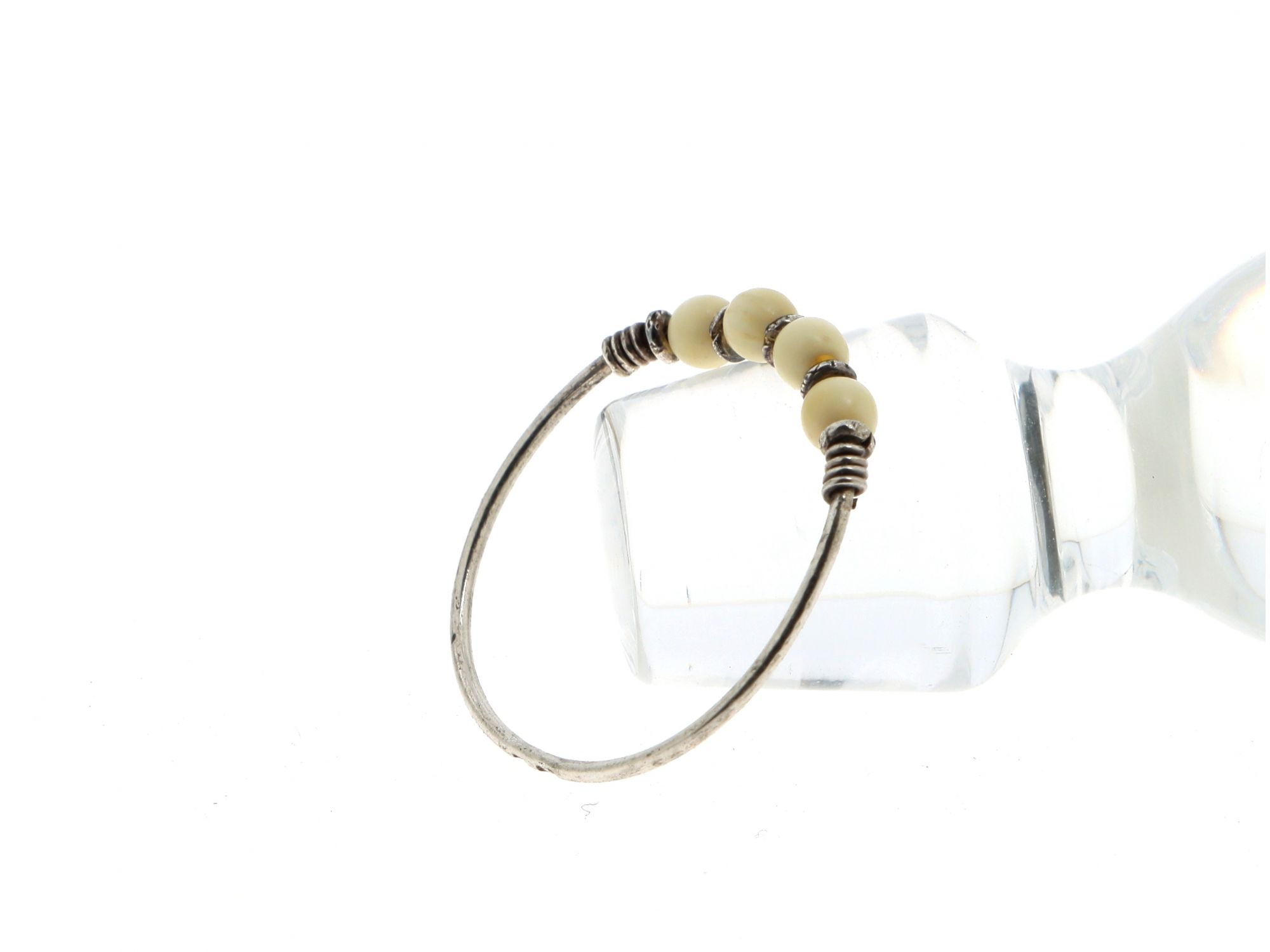 Lote 069 - Anel em Prata fino com parte superior com pequenas contas bege intercalado por argolas, elaborado em PRATA 835. Estado de Conservação: Bom, sinais de uso. Contraste: Cabeça de Águia virada à direita 835 (1985-2020 - ao abrigo do Decreto Lei 120/2017, artigo 3.º, alínea y). Tam.: 19. Medidas (CxLxA): 2*0,3*2,1cm. Peso Total: 0,5g.