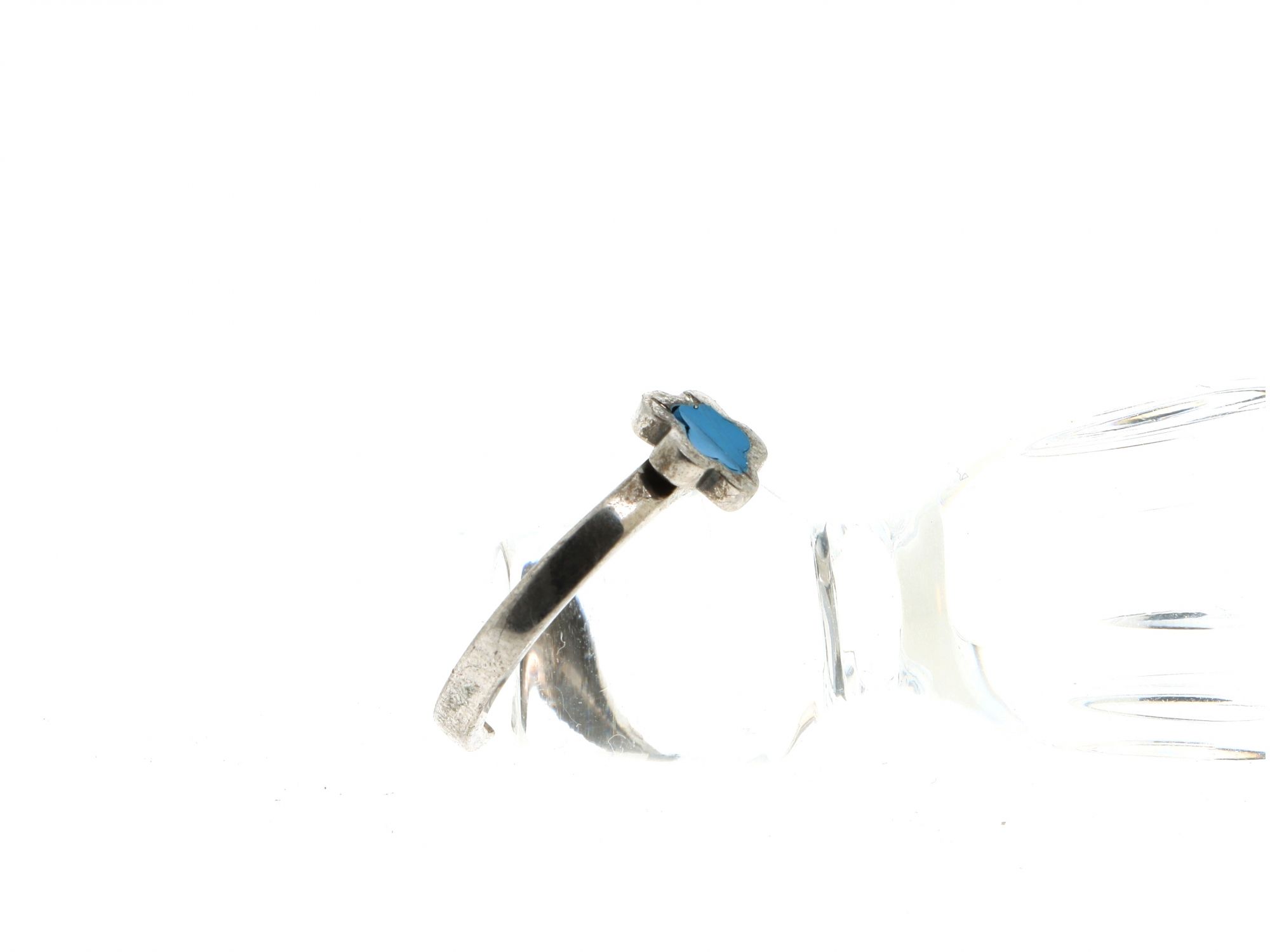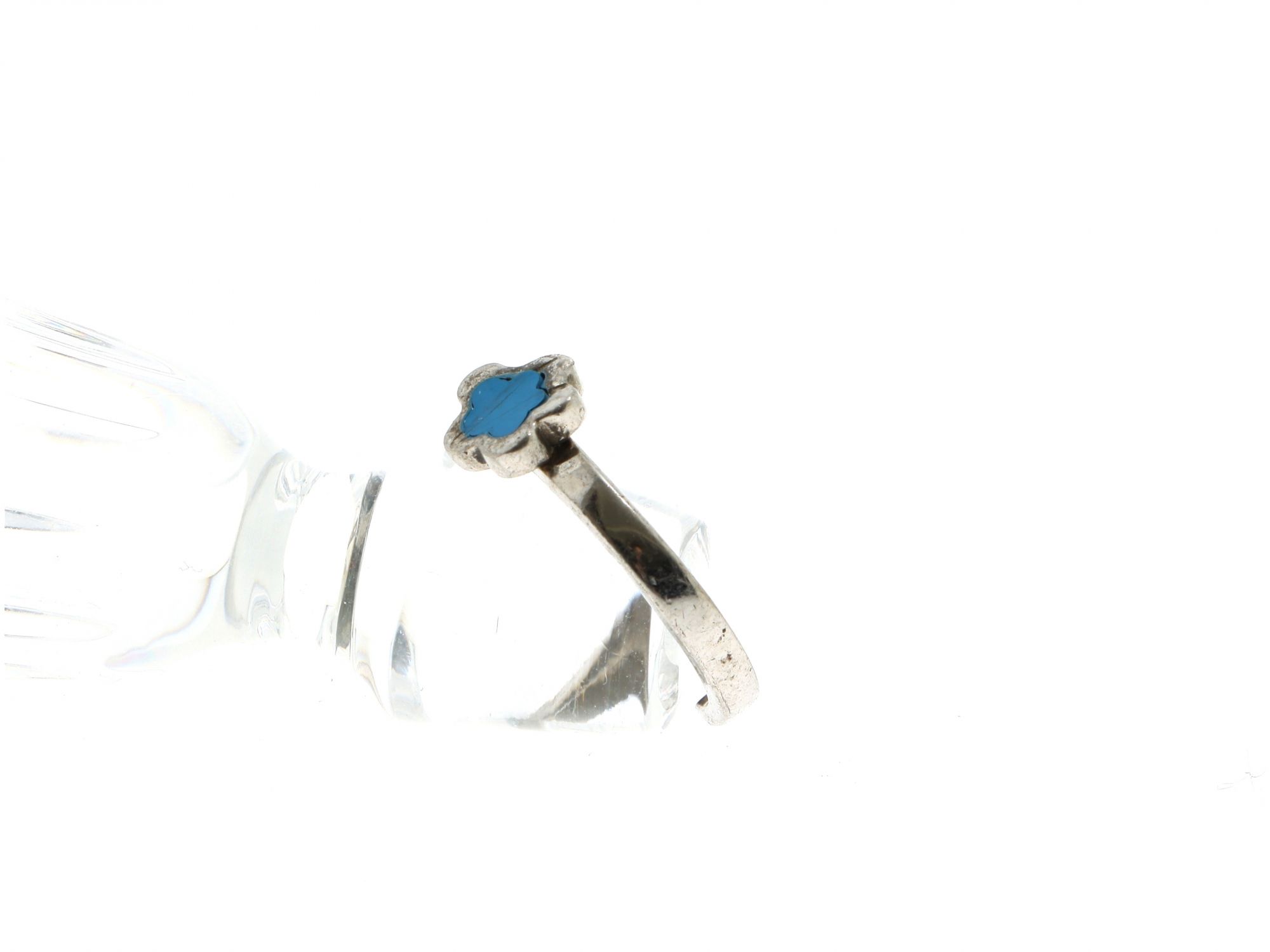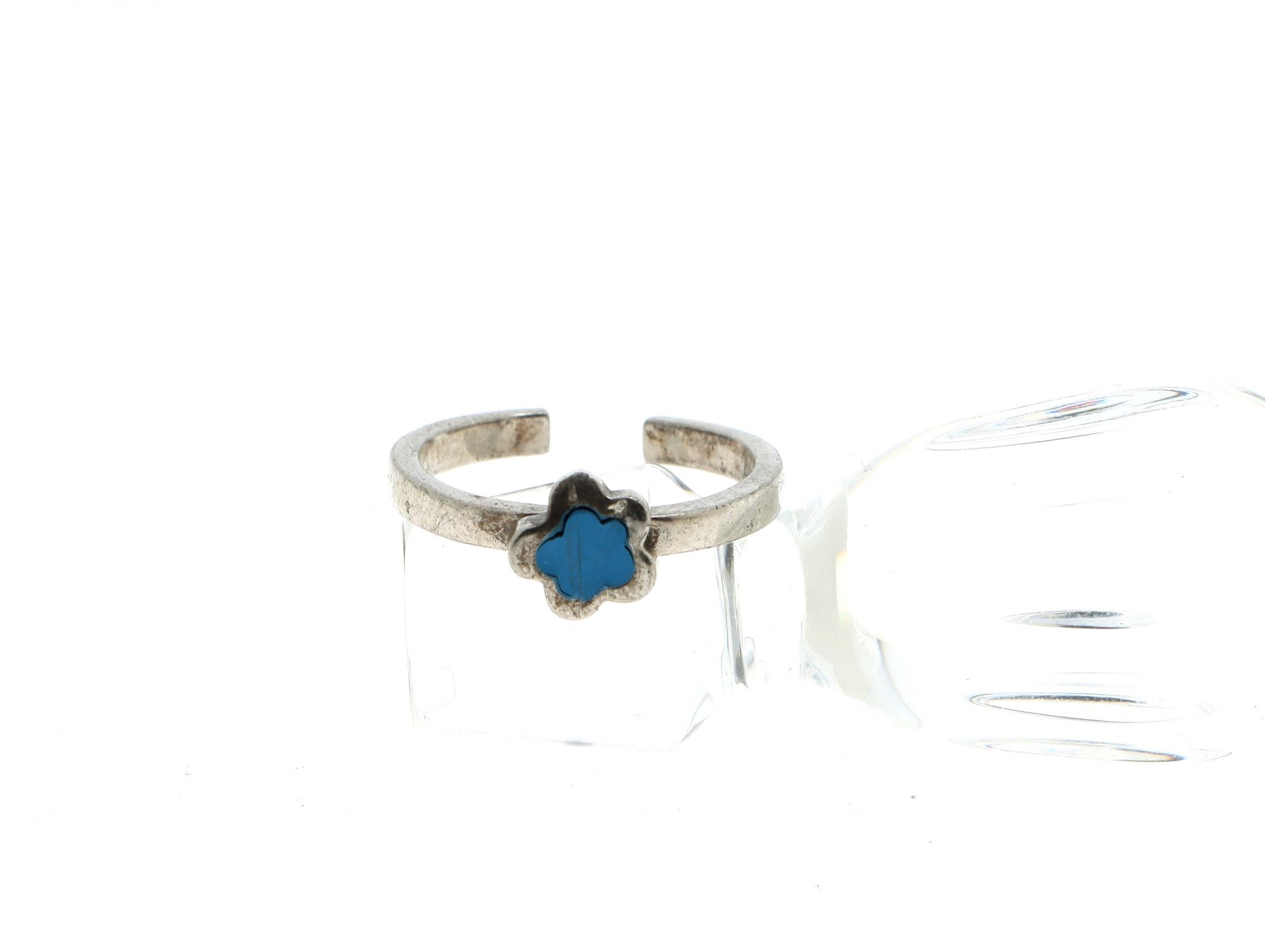 Lote 091 - Anel em Prata ajustável com topo em flor pintada com esmalte azul, elaborado em PRATA 925. Estado de Conservação: Bom, sinais de uso. Contraste: Marca 925. (PRATA - ao abrigo do Decreto Lei 120/2017, artigo 3.º, alínea x). Tam.: 14. Medidas (CxLxA): 2*0,8*2,2cm. Peso Total: 2,65g.