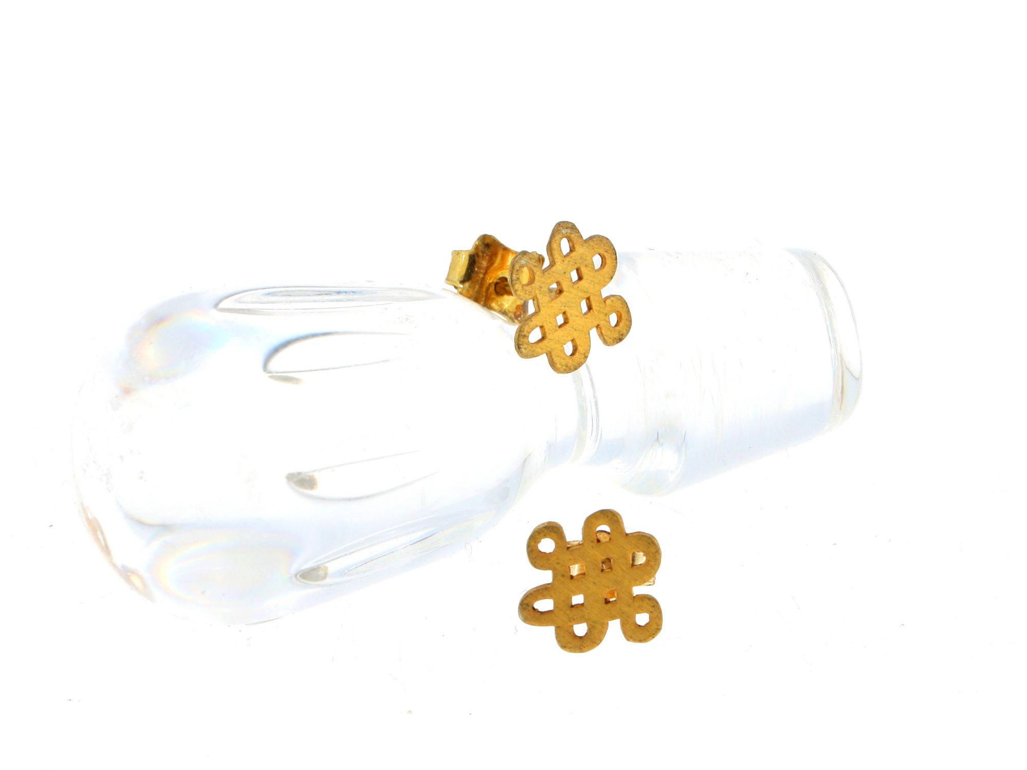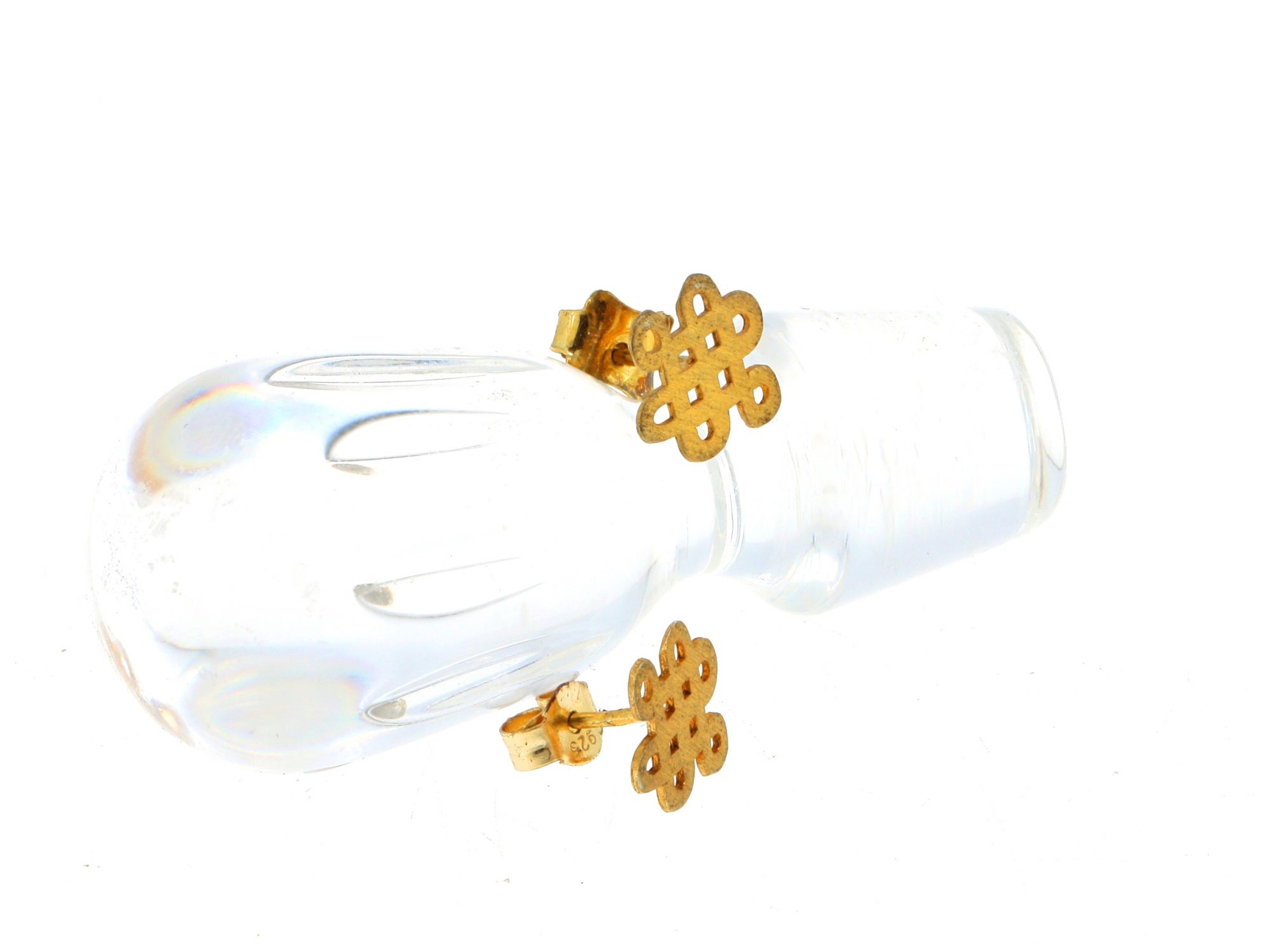 Lote 036 - Brincos em Prata Dourada de nó chinês, elaborado em PRATA 925. Estado de Conservação: Bom. Contraste: Marca 925. (PRATA - ao abrigo do Decreto Lei 120/2017, artigo 3.º, alínea x). Medidas (Larg): 0,8cm. Peso Total: 0,7g.