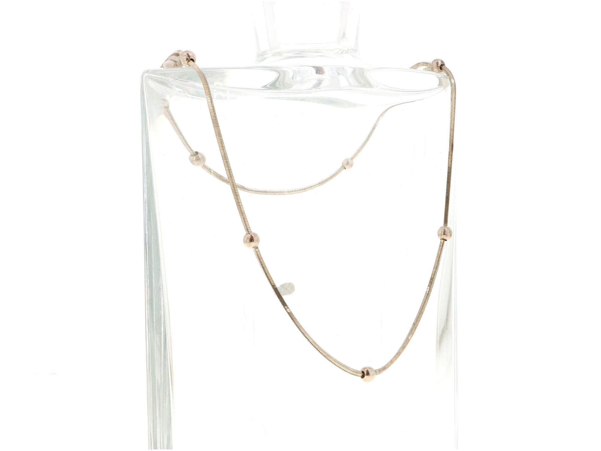 Lote 028 - Gargantilha em Prata de malha Rabo de rato, intercalada com bolas polidas, elaborado em PRATA 925. Estado de Conservação: Muito Bom. Contraste: Cabeça de Águia virada à esquerda 925 (1985-2020 - ao abrigo do Decreto Lei 120/2017, artigo 3.º, alínea y). Medidas (Comp): 41,8cm. Peso Total: 8,38gr.