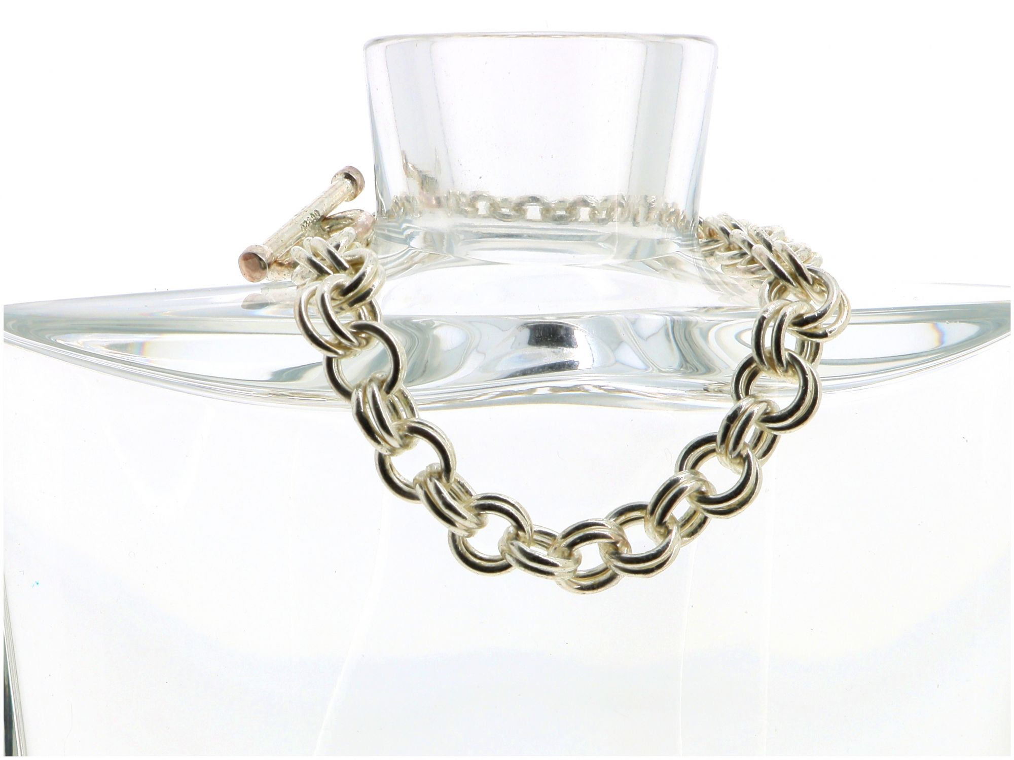 Lote 033 - Pulseira em Prata de malha elos duplos com fecho tipo “T”, elaborado em PRATA 925. Estado de Conservação: Bom, sinais de uso. Contraste: Marca 925. (PRATA - ao abrigo do Decreto Lei 120/2017, artigo 3.º, alínea x). Medidas (Comp): 20cm. Peso Total: 19,39g.