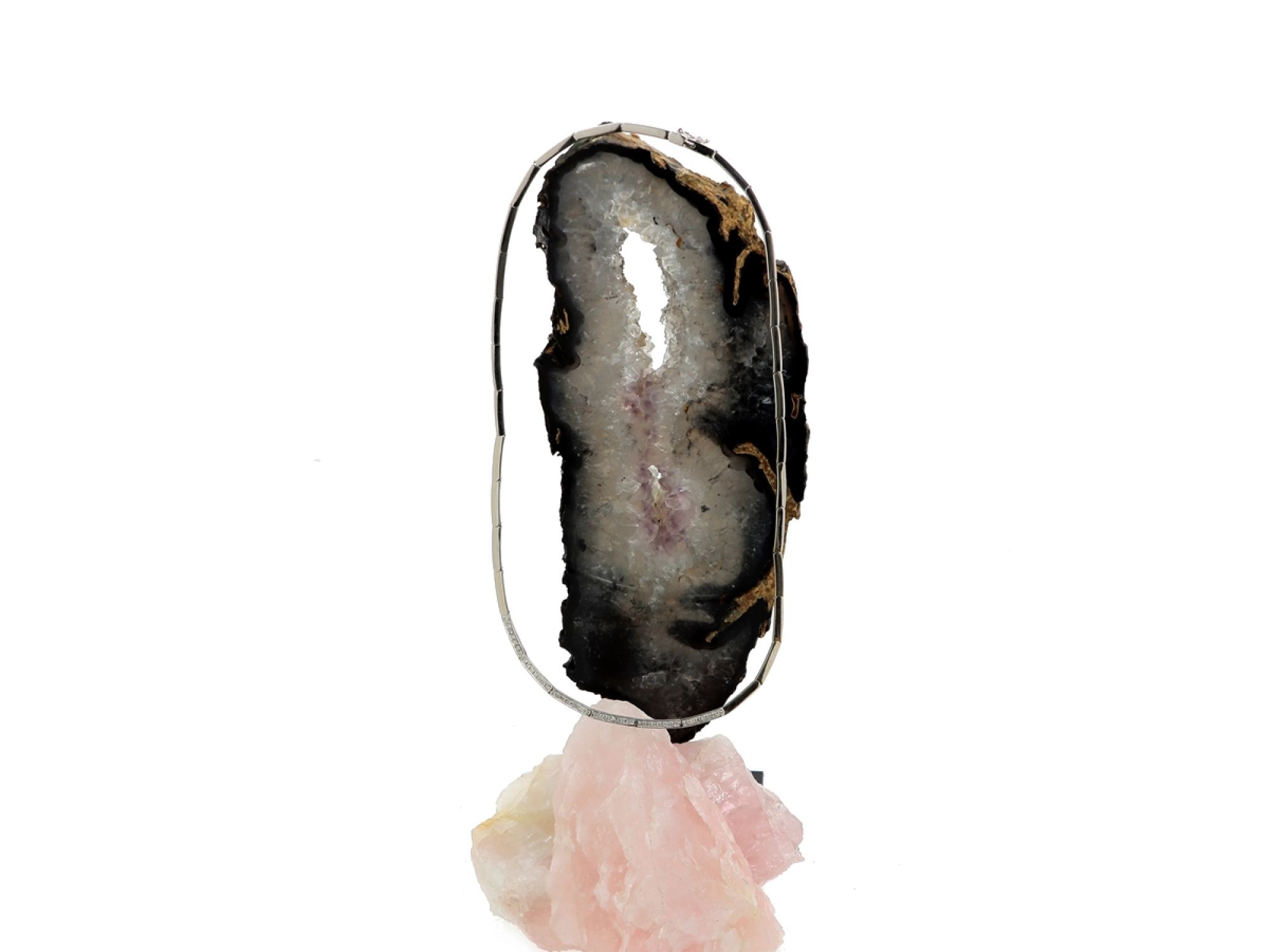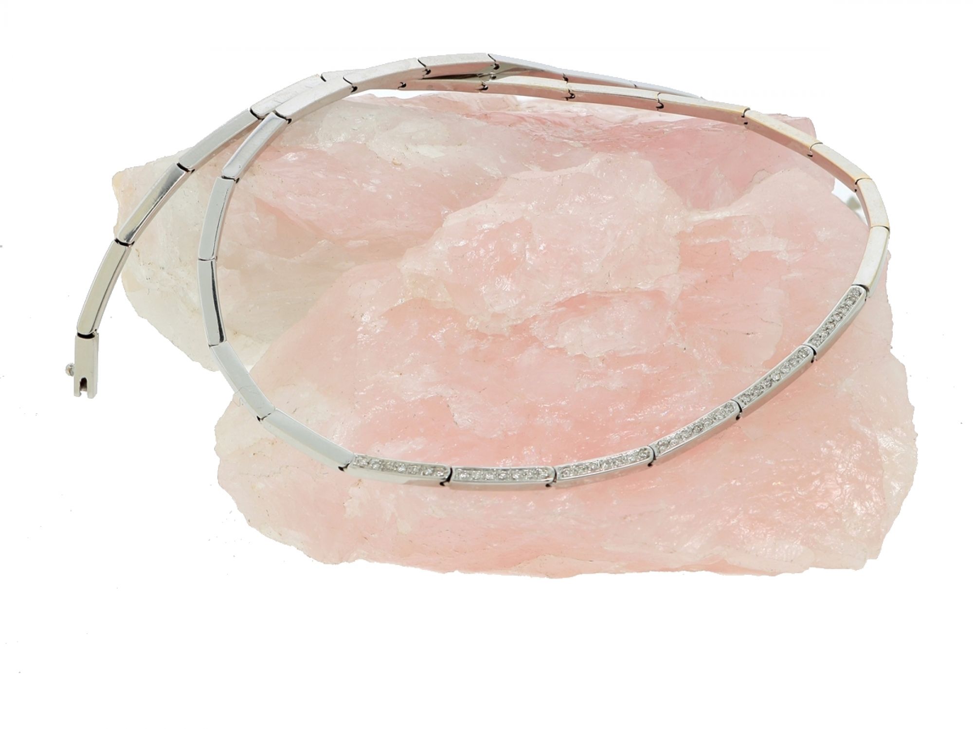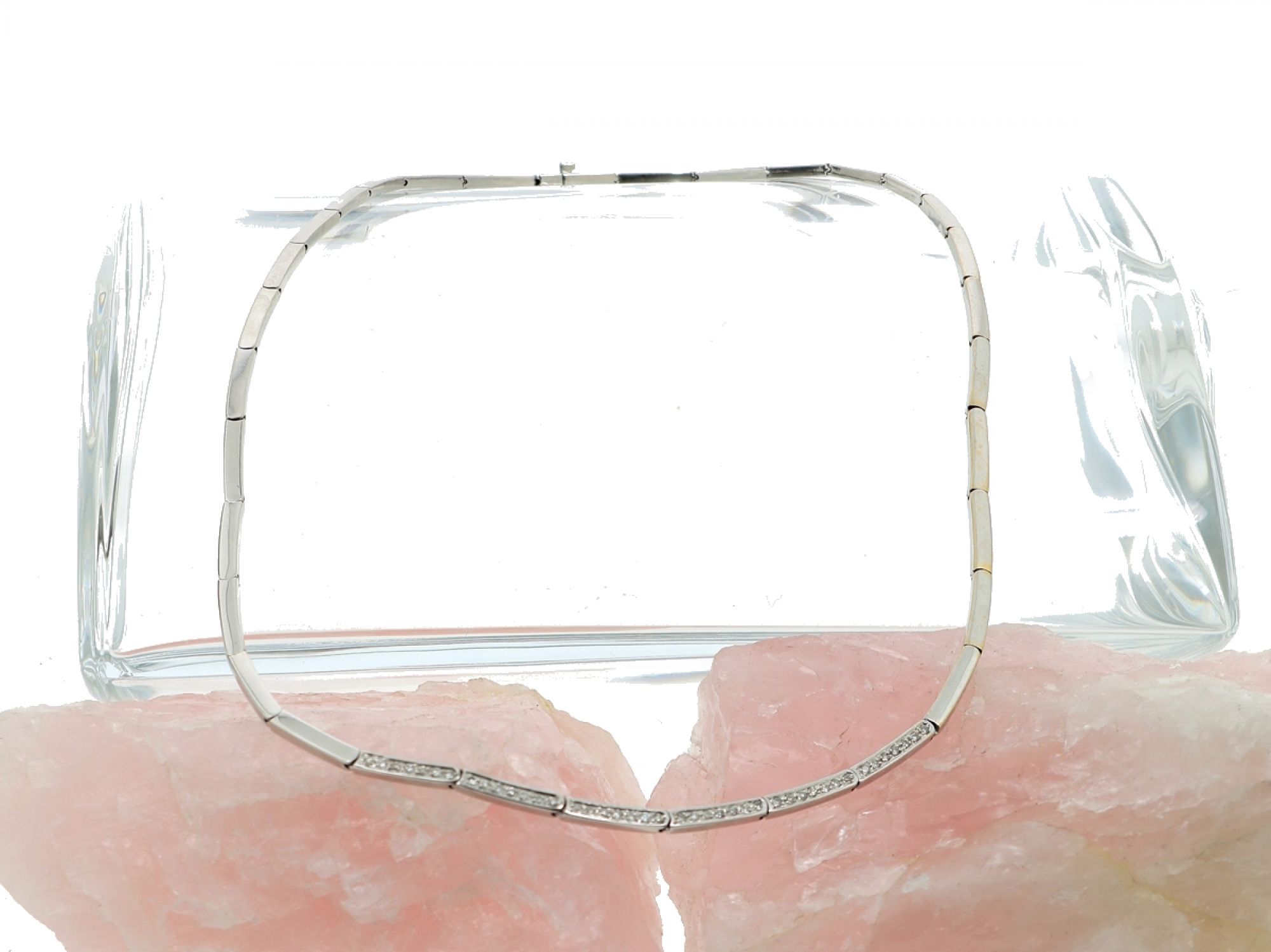 Lote 015 - Gargantilha em Ouro Branco em elos retangulares com parte central cravejada com 42 DIAMANTES, elaborado em OURO 19,2 QUILATES. Estado de Conservação: Muito Bom, ligeiros sinais de uso. Contraste: Cabeça de Veado 800 (OURO - 1985-2020, ao abrigo do Decreto Lei 120/2017, artigo 3.º, alínea y). Medidas (Comp): 42,5cm. Peso Total: 22,05g.