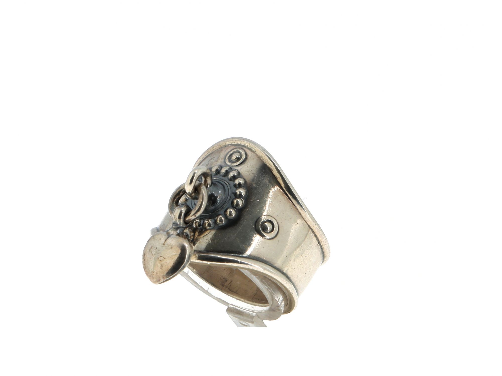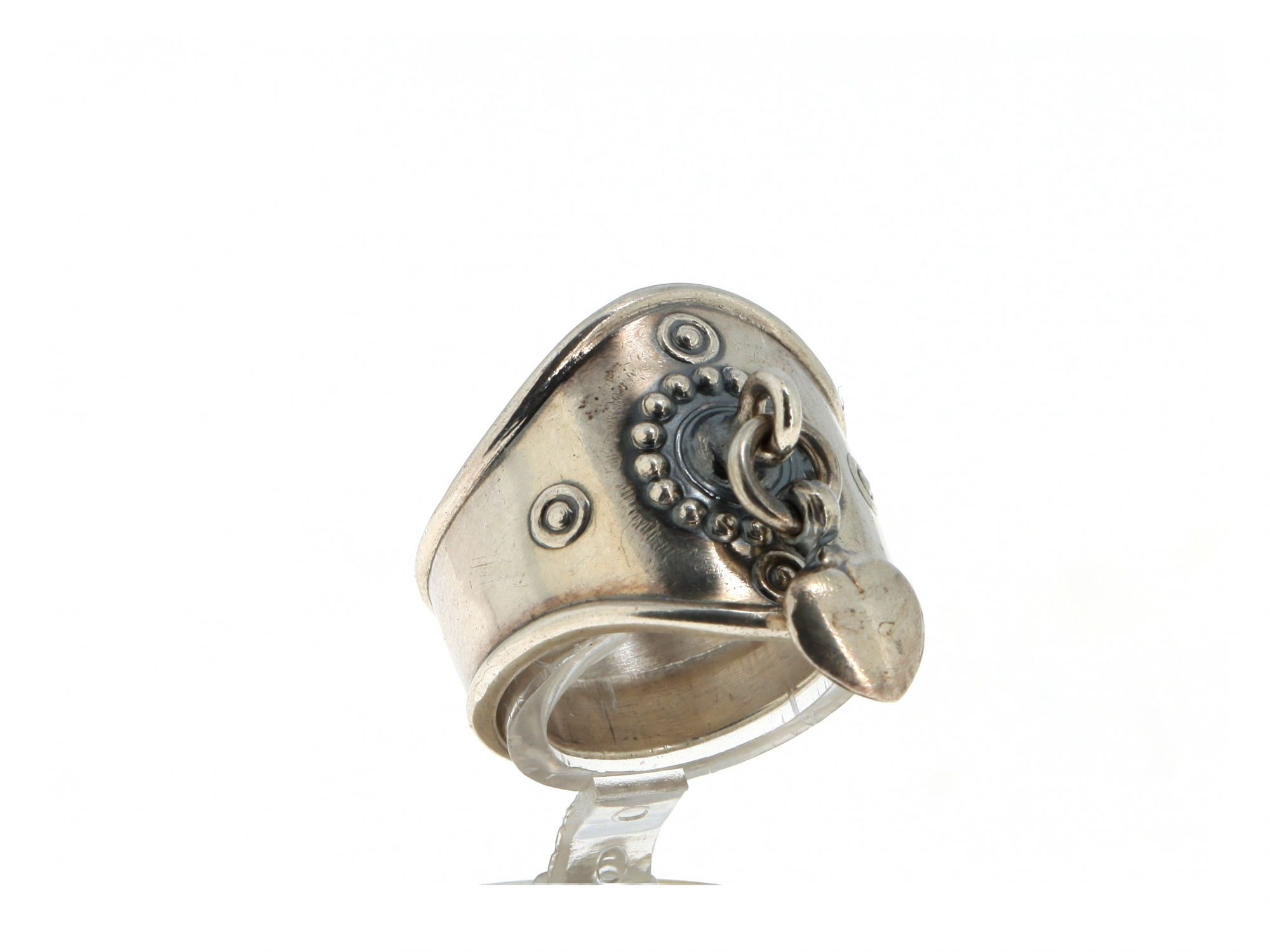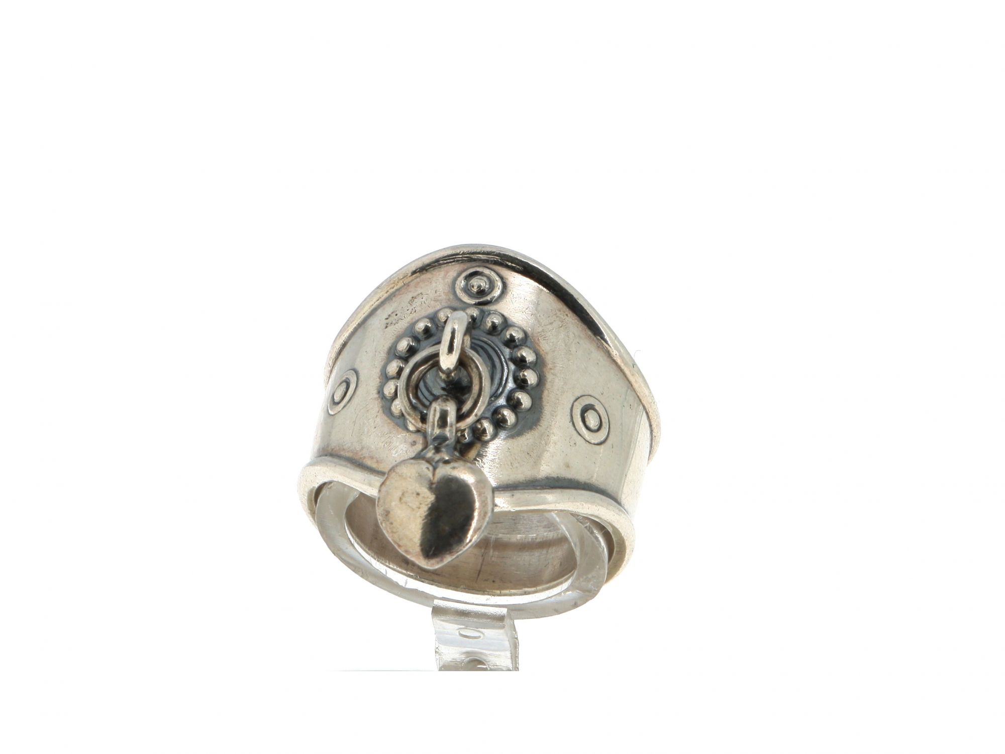 Lote 020 - Anel em Prata polido largo com pendente em coração no topo e trabalhado a cinzel, elaborado em PRATA 925. Estado de Conservação: Bom, sinais de uso. Contraste: Marca 925. (PRATA - ao abrigo do Decreto Lei 120/2017, artigo 3.º, alínea x). Tam.: 12,5. Medidas (CxLxA): 1,9*1,8*2,5cm. Peso Total: 6,91g.