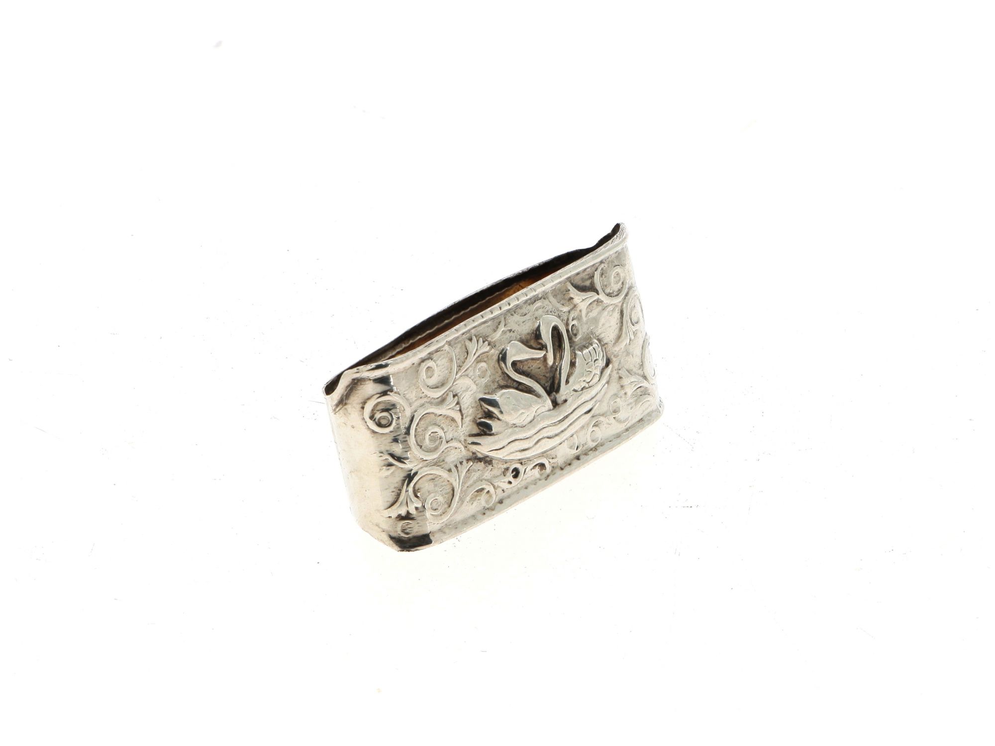 Lote 060 - Argola de Guardanapo em Prata polida com frente com 2 cisnes e trabalhada com motivos florais, elaborado em PRATA 835. Estado de Conservação: Bom, sinais de uso. Contraste: Cabeça de Águia virada à direita 835 (1985-2020 - ao abrigo do Decreto Lei 120/2017, artigo 3.º, alínea y). Medidas (CxL): 4,5*2cm. Peso Total: 3,78g.