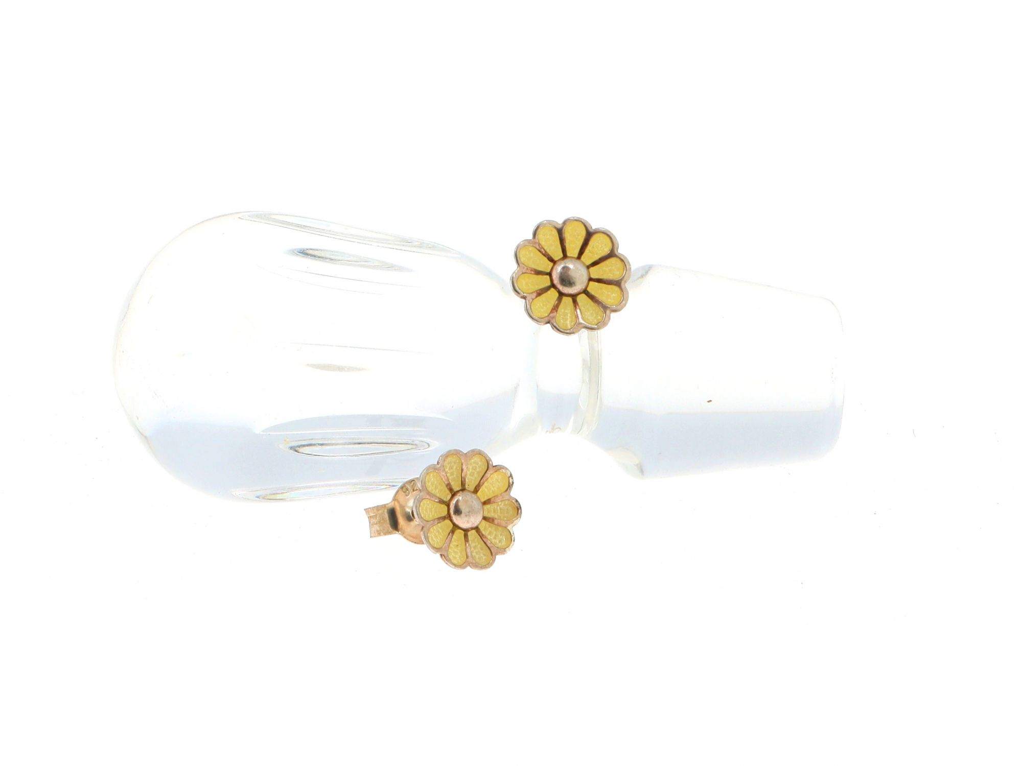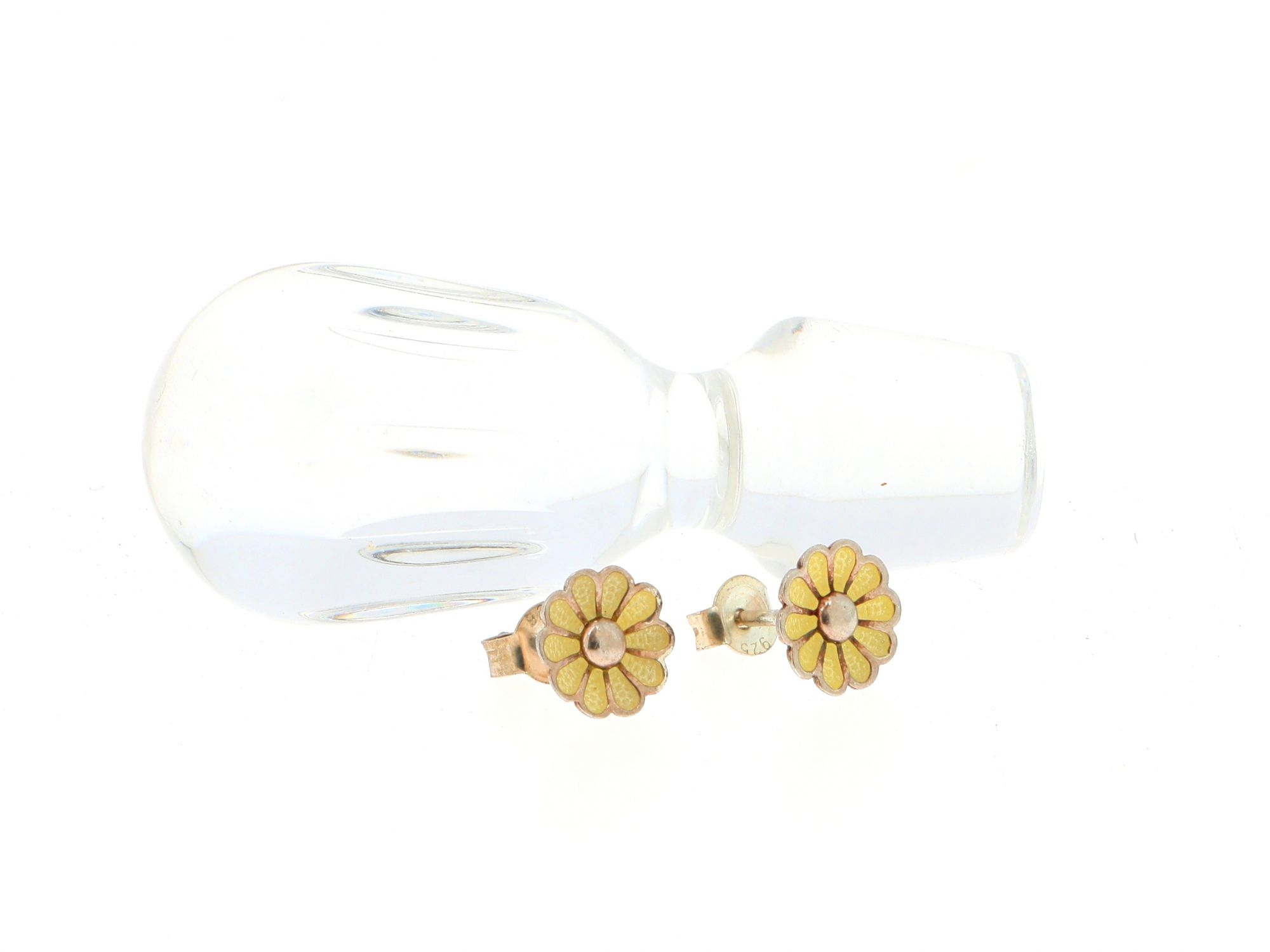 Lote 075 - Brincos em Prata com forma de Flor margarida com pétalas de esmalte amarelo, elaborado em PRATA 925. Estado de Conservação:Muito Bom. Contraste: Marca 925. (PRATA - ao abrigo do Decreto Lei 120/2017, artigo 3.º, alínea x). Medidas (Larg): 0,8cm. Peso Total: 1,26g.