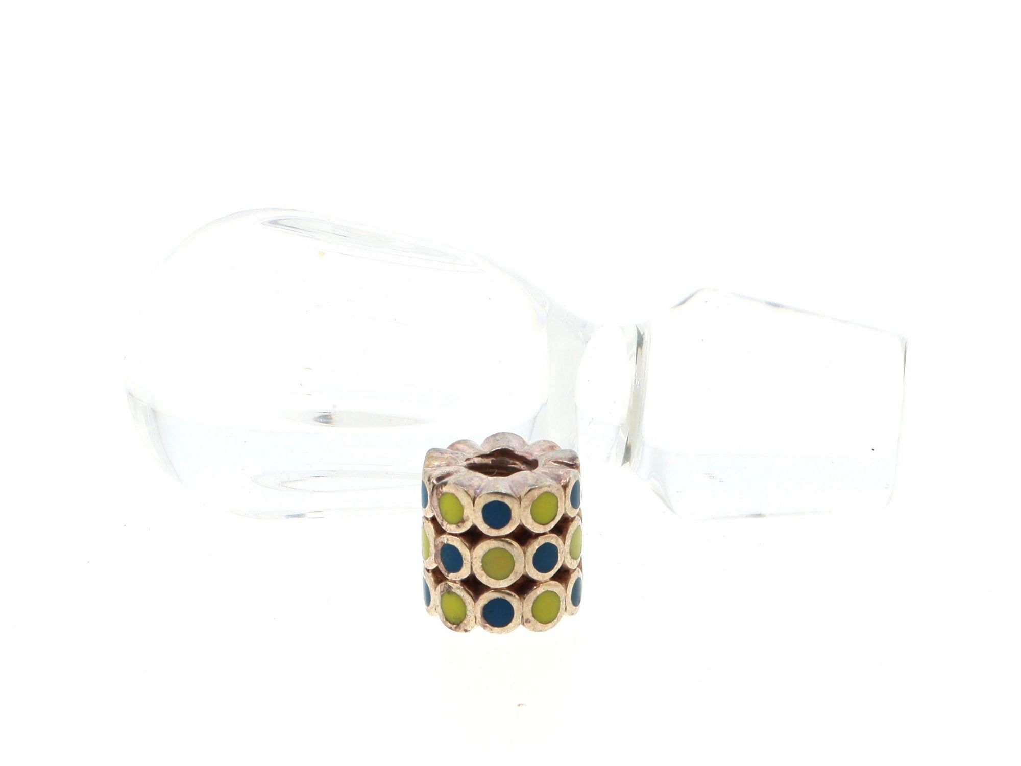 Lote 024 - Conta CHAM em Prata de forma de cilindro com círculos pintados em azul e outros amarelos, elaborado em PRATA 925. Estado de Conservação: Bom, sinais de uso. Contraste: Marca 925. (PRATA - ao abrigo do Decreto Lei 120/2017, artigo 3.º, alínea x). Medidas (Diâm): 1cm. Peso Total: 4,35g.