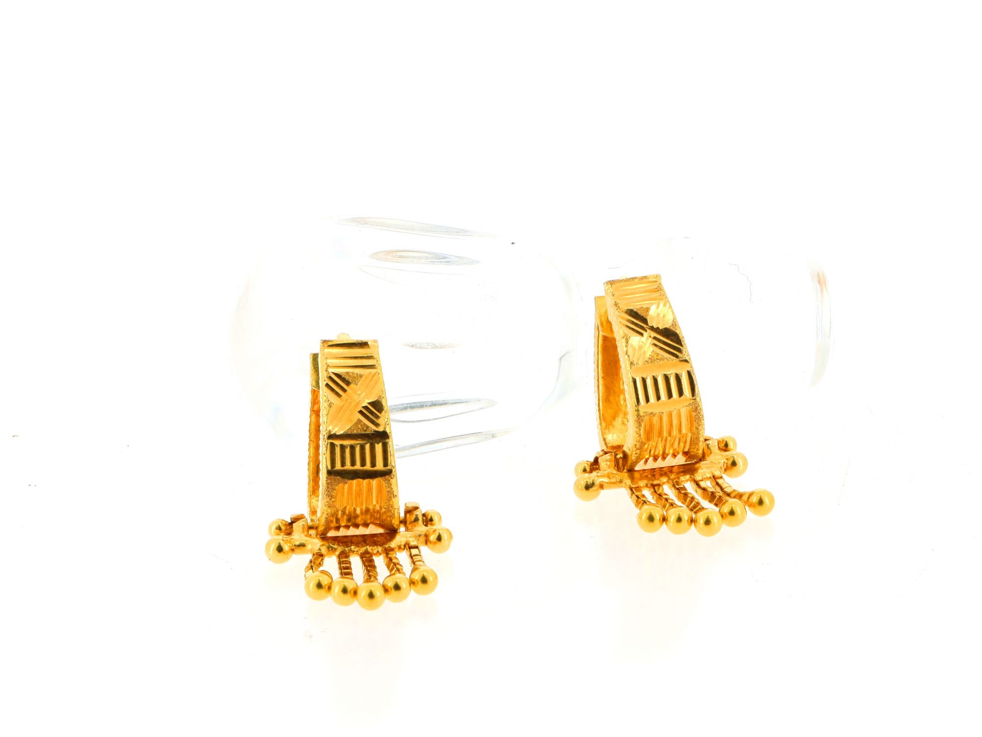 Lote 005 - Brincos em Ouro “GOLD BALI”, tradicionais Indianos de design de argola com ornamentação intrincada e pequenos pendentes em borla, elaborado em OURO 22 QUILATES. Estado de Conservação: Excelente. Contraste: Artefacto de artista. (ao abrigo do Decreto Lei 120/2017, artigo 2.º, alínea a). Medidas (CxL): 2,8*1,3cm. Peso Total: 5,47g.