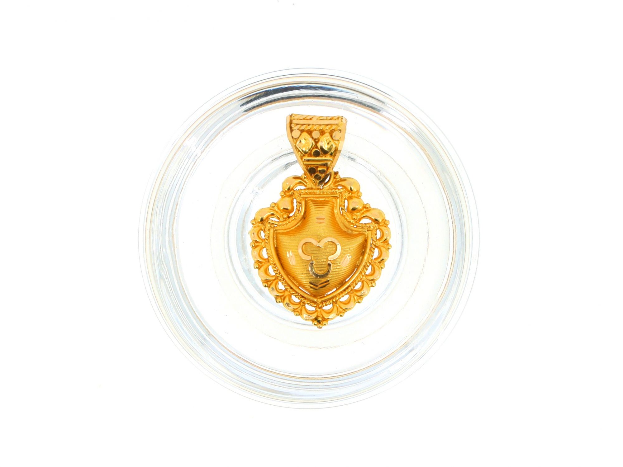 Lote 006 - Medalha em Ouro com semelhança de Escudo, trabalhada toda ela a cinzel, com centro estilo trevo de três folhas, elaborado em OURO 22 QUILATES. Estado de Conservação: Excelente. Contraste: Artefacto de artista. (ao abrigo do Decreto Lei 120/2017, artigo 2.º, alínea a). Medidas (CxL): 2,7*1,7cm. Peso Total: 2,15g.