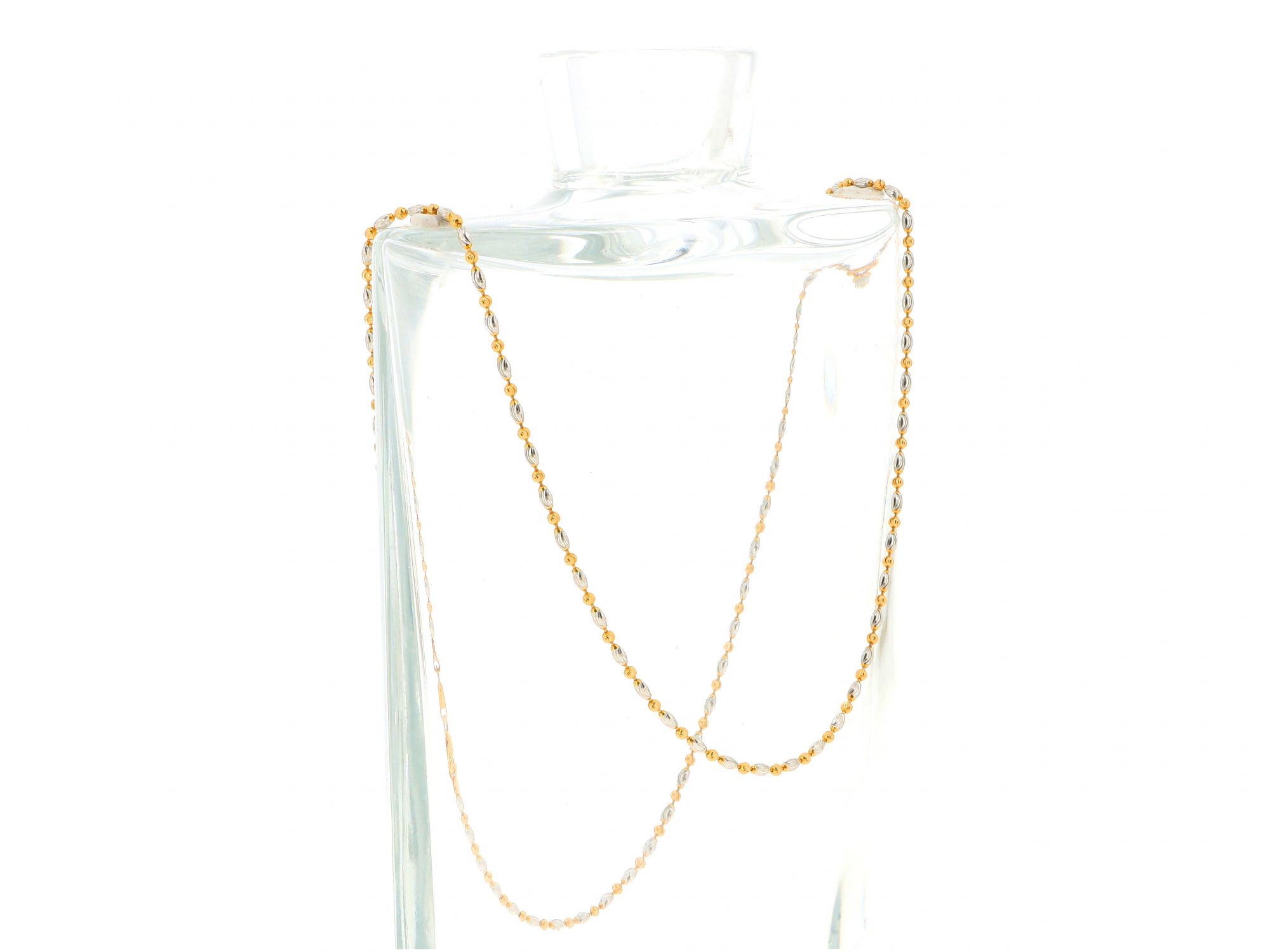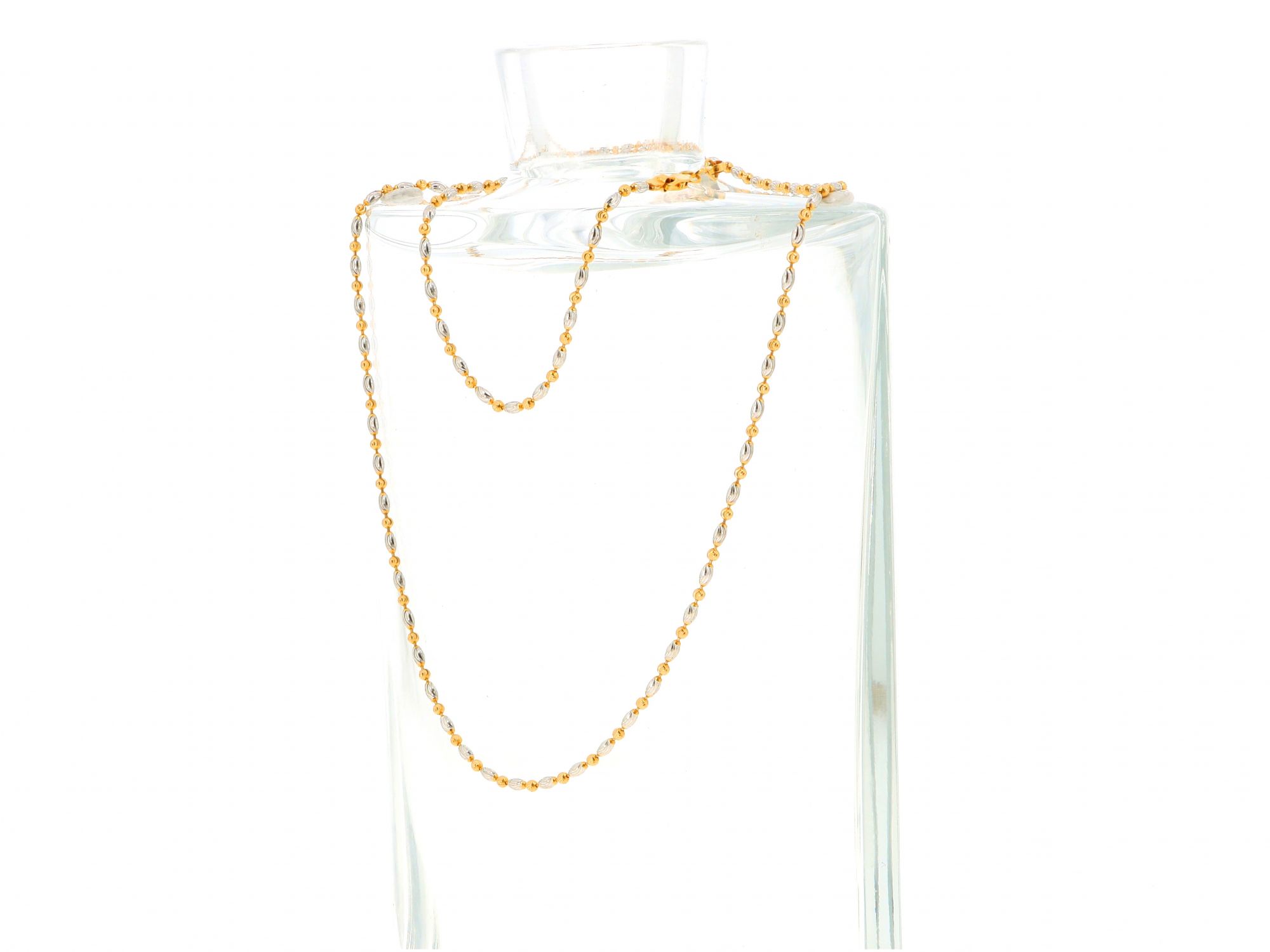Lote 015 - Fio em Ouro Bicolor de malha grão de arroz intercalada com esferas trabalhadas a cinzel, com fecho bico de papagaio, elaborado em OURO 22 QUILATES. Estado de Conservação: Excelente. Contraste: Marca 916. (OURO - ao abrigo do Decreto Lei 120/2017, artigo 3.º, alínea x). Medidas (Comp): 56,3cm. Peso Total: 9g.