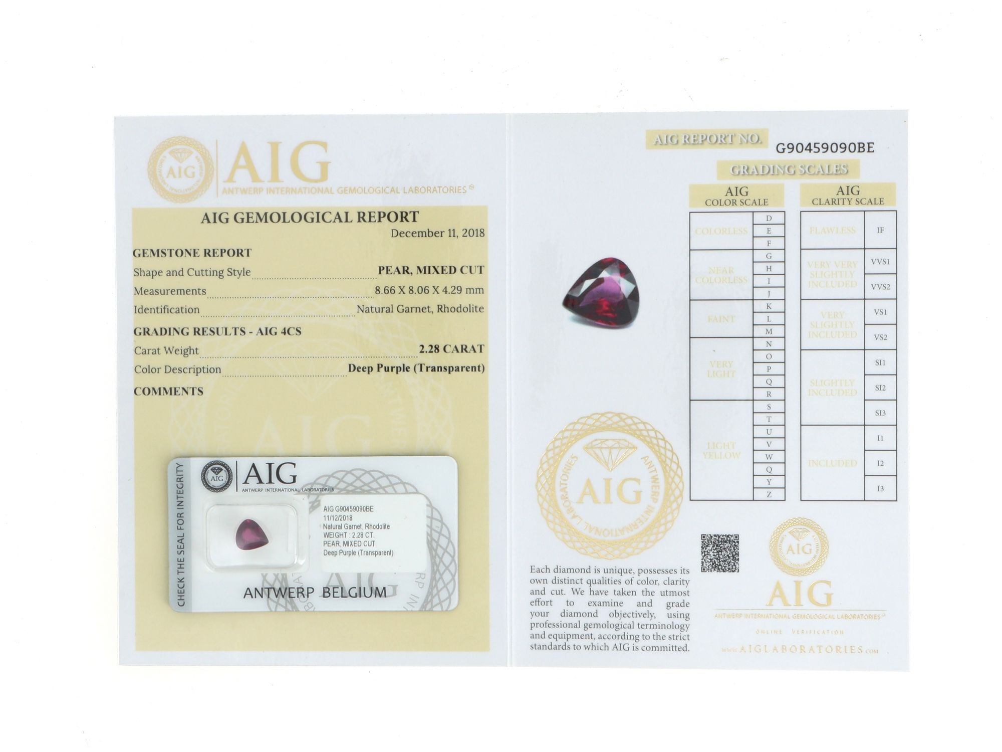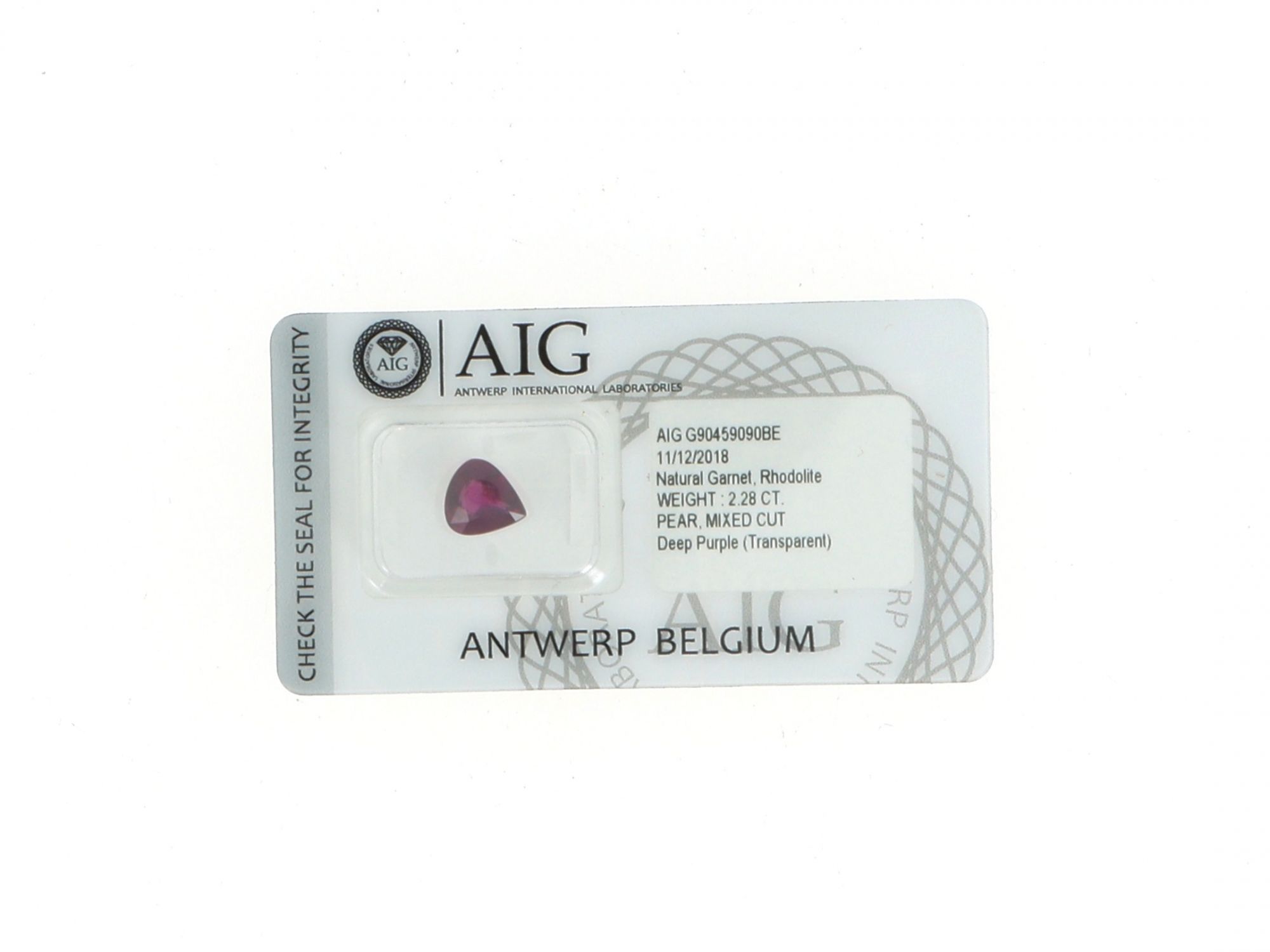 Lote 061 - Rhodolite Garnet Natural, em talhe Pera, cor "Deep Purple", transparente. Sem tratamento. Para mais informações, consultar certificado. Com certificado AIG (Antwerp International Gemological Laboratories) Nº G90459090BE. Gema em invólucro selado. Estado de Conservação: Excelente.Medidas (CxLxA): 8.66 x 8.06 x 4.29mm. Peso Total: 2,28ct.