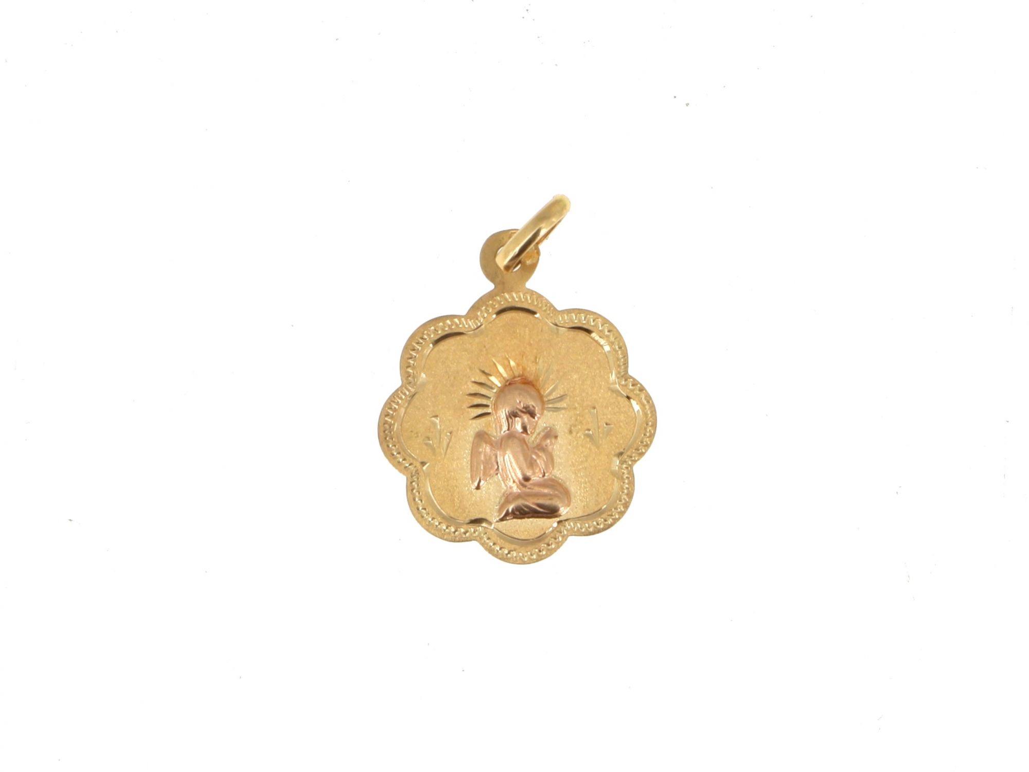 Lote 003 - Medalha em Ouro com forma de Flor trabalhada a cinzel e com imagem de Anjo da Guarda no centro, elaborado em OURO 19,2 QUILATES. Estado de Conservação: Muito Bom. Contraste: Cabeça de Veado 800 (OURO - 1985-2020, ao abrigo do Decreto Lei 120/2017, artigo 3.º, alínea y). Medidas (CxL): 2,3*1,7cm. Peso Total: 1,03g.