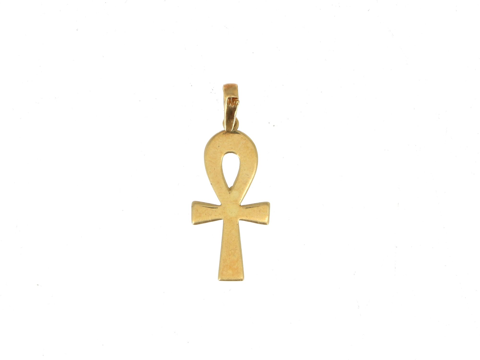 Lote 009 - Pingente ANKH em Ouro conhecido como Chaves da Vida, símbolo do Antigo Egito e representa a vida eterna, elaborado em OURO 18 QUILATES. Estado de Conservação: Bom, sinais de uso. Contraste: Marca 750. (OURO - ao abrigo do Decreto Lei 120/2017, artigo 3.º, alínea x). Medidas (CxL): 3,1*1,2cm. Peso Total: 1,48g.