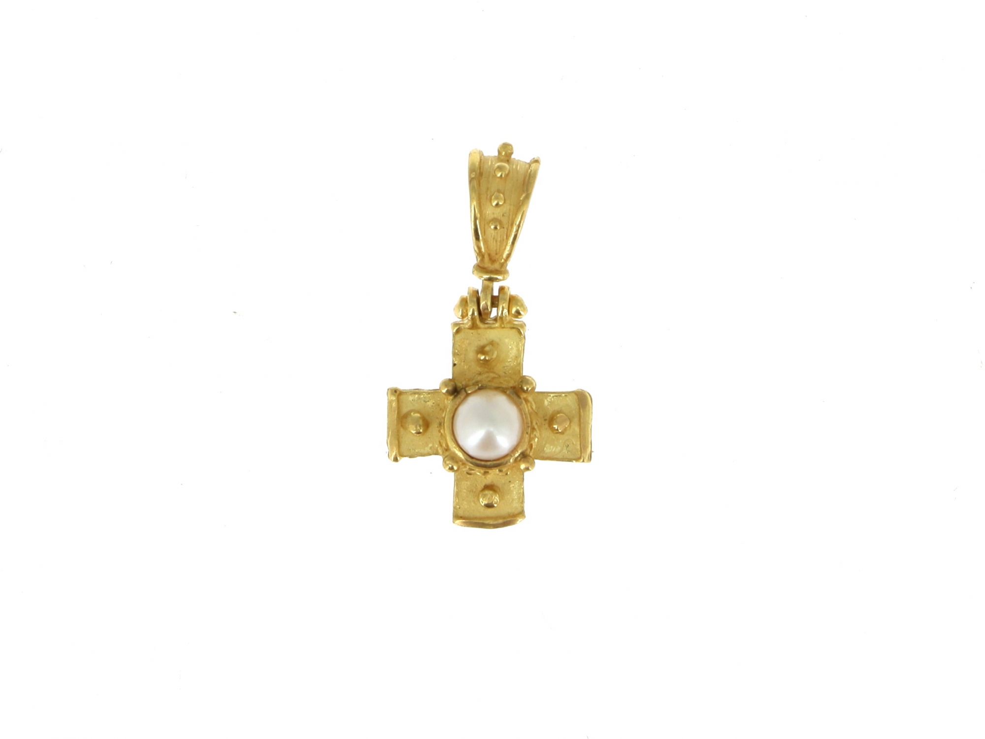Lote 012 - Pendente em Ouro escovado de forma de Cruz com pérola no centro, elaborado em OURO 19,2 QUILATES. Estado de Conservação: Muito Bom, ligeiros sinais de uso. Contraste: Cabeça de Veado 800 (OURO - 1985-2020, ao abrigo do Decreto Lei 120/2017, artigo 3.º, alínea y). Medidas (CxL): 2,6*1,4cm. Peso Total: 2,73g.