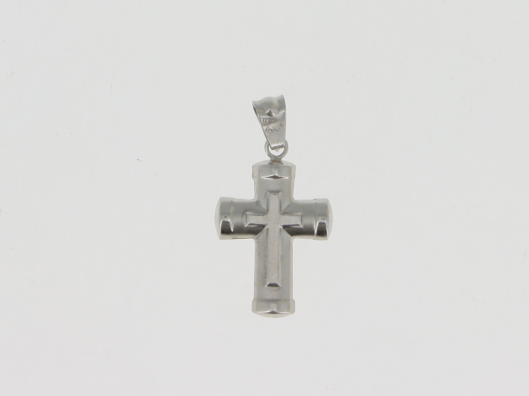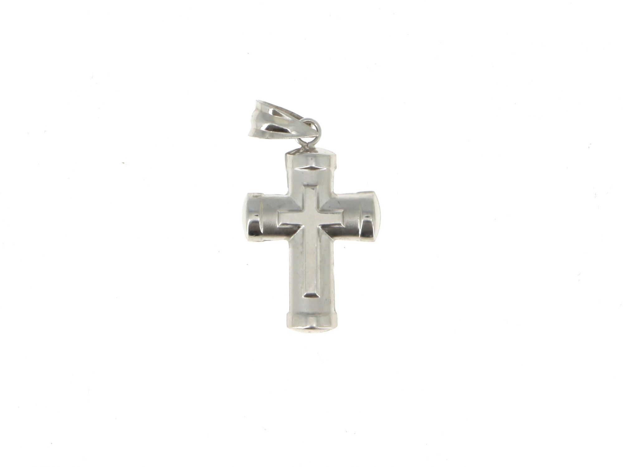 Lote 013 - Pendente em Ouro Branco com forma de Cruz escovada com uma sobreposta polida, elaborado em OURO 18 QUILATES. Estado de Conservação: Bom, sinais de uso. Contraste: Marca 750. (OURO - ao abrigo do Decreto Lei 120/2017, artigo 3.º, alínea x). Medidas (CxL): 2,6*1,4cm. Peso Total: 1,13g.