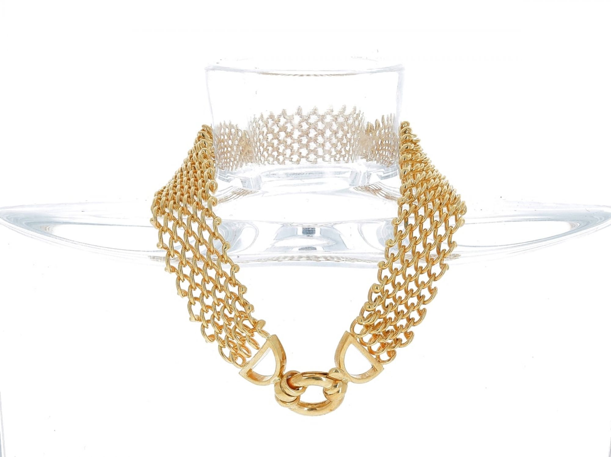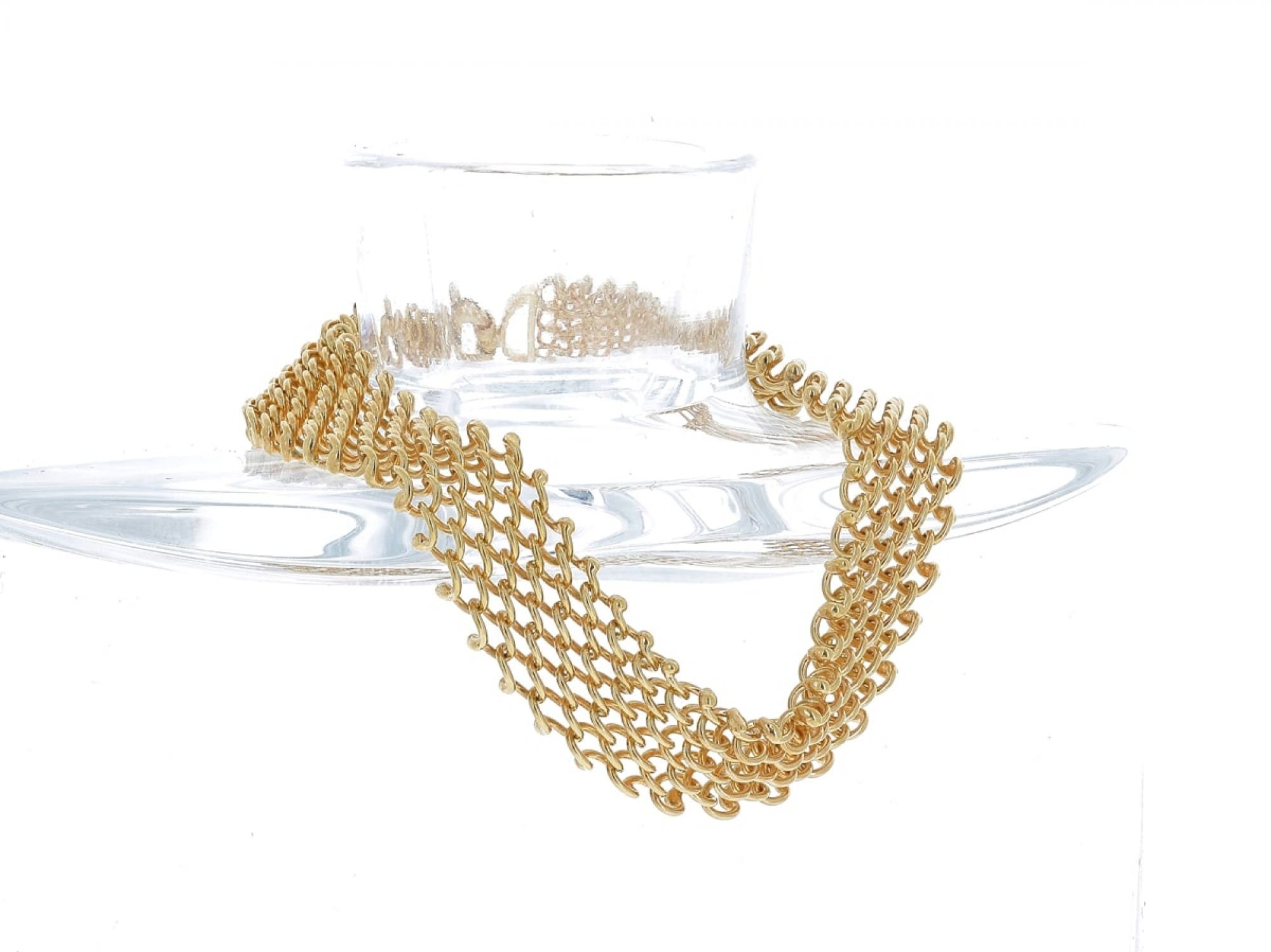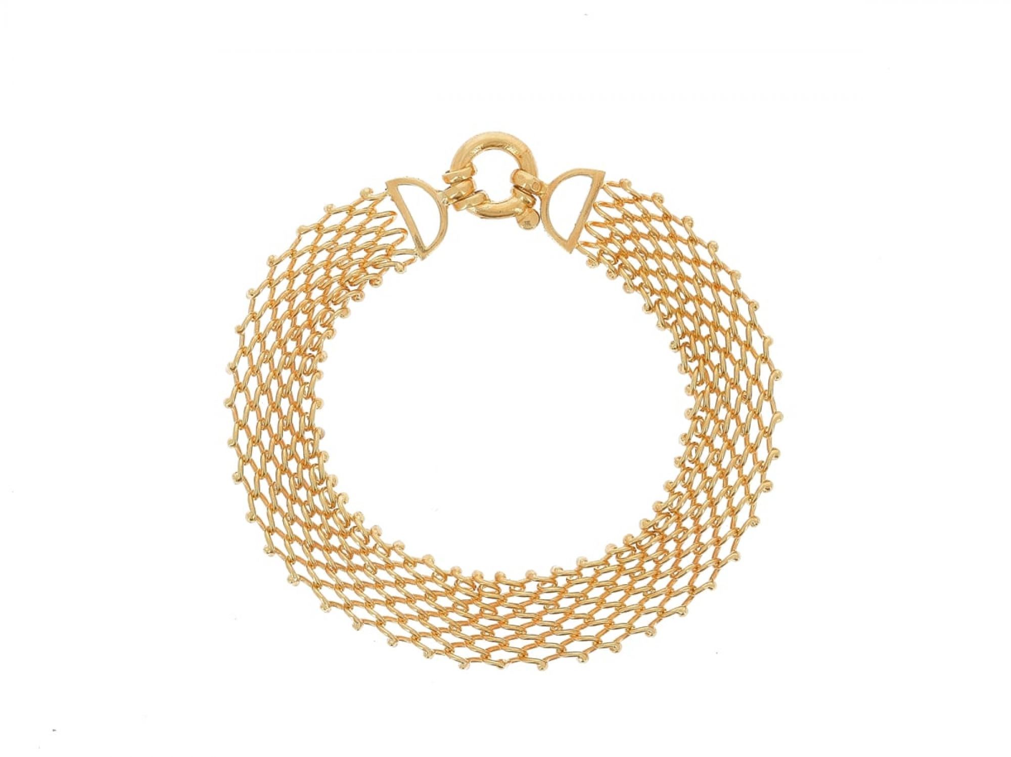 Lote 011 - Bracelete em ouro de 19,2kt, trabalhada em malha entrelaçada de múltiplos elos, formando um delicado efeito de rede. A sua estrutura cria um equilíbrio perfeito entre leveza e presença, envolvendo o pulso com brilho e sofisticação. Estado de Conservação: Muito Bom. Contraste: Cabeça de Veado 800 (OURO - 1985-2020, ao abrigo do Decreto Lei 120/2017, artigo 3.º, alínea y). Medidas (CxL): 120x1,2 cm. Peso Total: 24,7g.