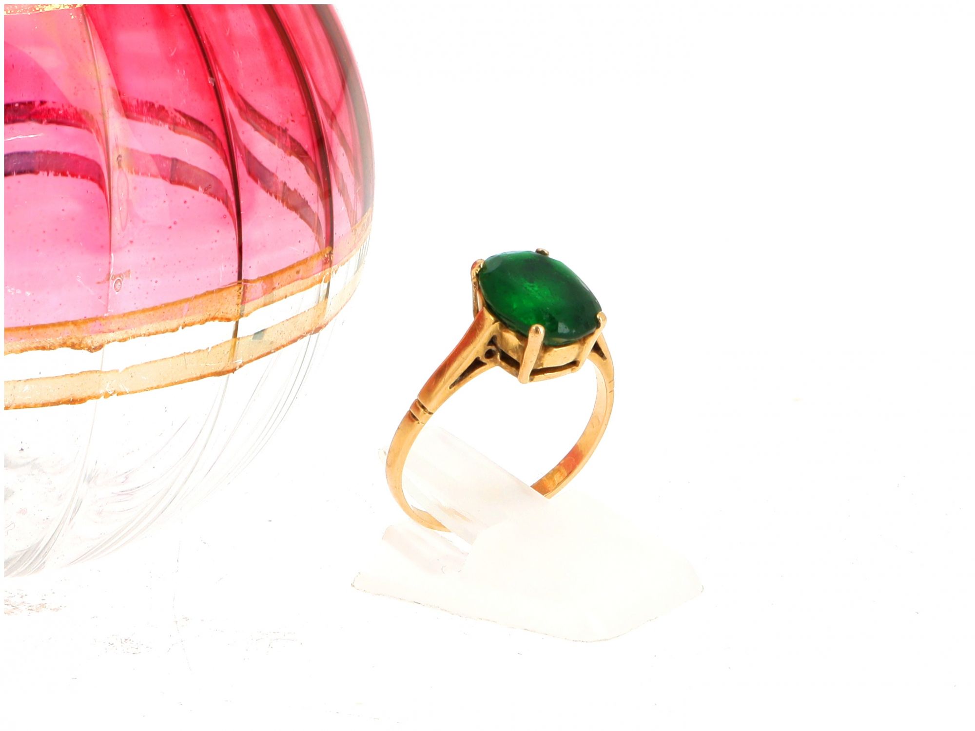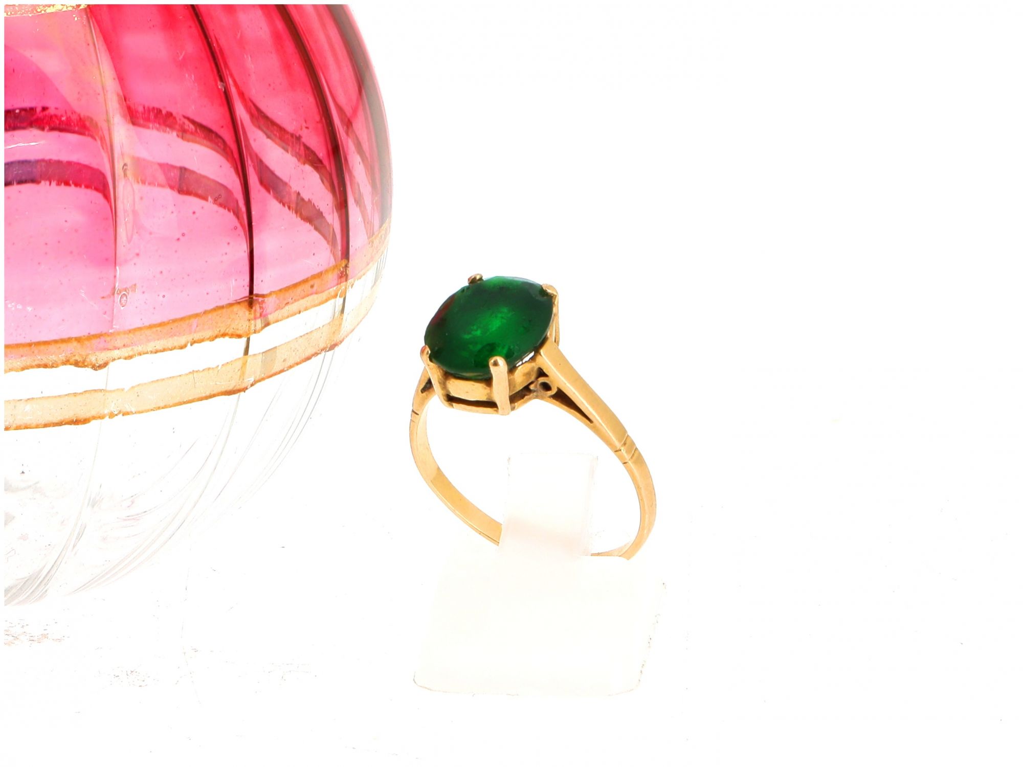 Lote 018 - Anel de OURO de 19,2 quilates, cravejado com pedra verde. Estado de Conservação: Muito Bom, ligeiros sinais de uso. Contraste: Cabeça de Veado 800 (OURO - 1985-2020, ao abrigo do Decreto Lei 120/2017, artigo 3.º, alínea y). Tam.: 17 cm. Peso Total: 3,39g.