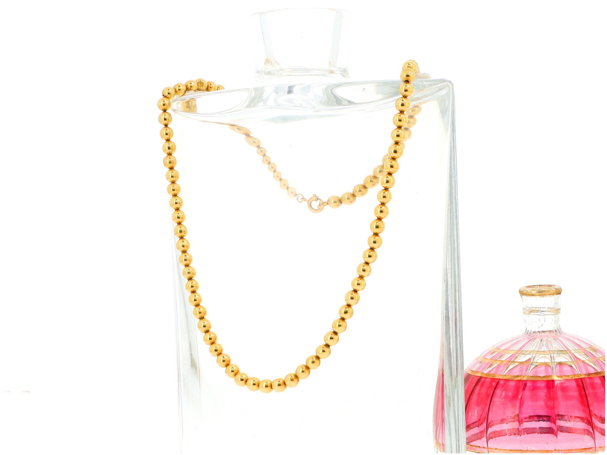 Lote 019 - Colar em OURO de 19,2 quilates elaborado em bolas de OURO Polidas. Estado de Conservação: Muito Bom. Contraste: Cabeça de Veado 800 (OURO - 1985-2020, ao abrigo do Decreto Lei 120/2017, artigo 3.º, alínea y). Medidas (CxL): 40x0,5cm. Peso Total: 13,76g.