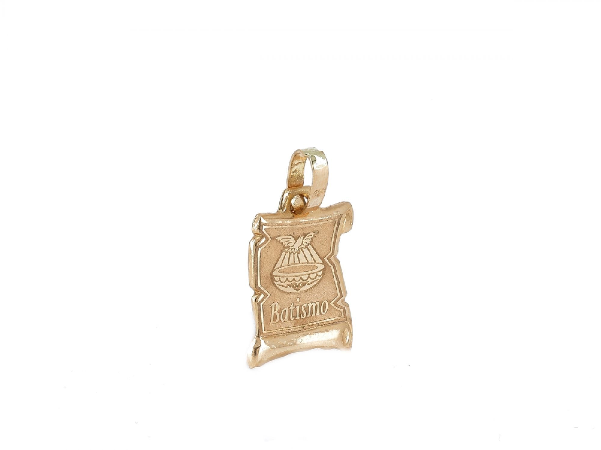 Lote 024 - Pendente elaborado em OURO 19,2 Quilates, gravado "Batismo" Estado de Conservação: Muito Bom. Contraste: Marca 800. (OURO - ao abrigo do Decreto Lei 120/2017, artigo 3.º, alínea x). Medidas (CxL): 1,3x0,9cm. Peso Total: 0,46g.