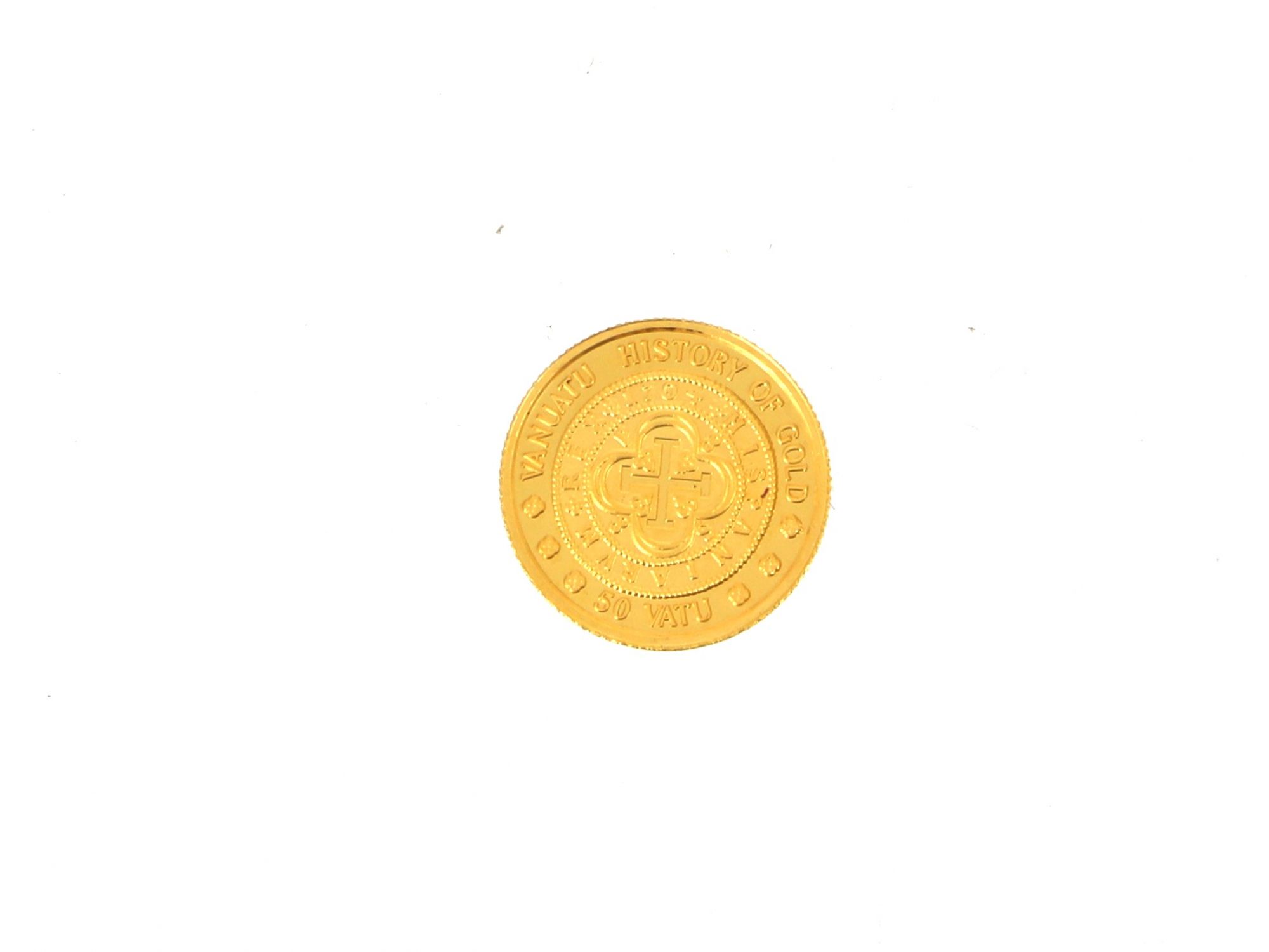 Lote 007 - Moeda 50 VATU em Ouro do Vanuatu de 1998, anverso com texto “RIPABLIK BLONG VANUATU” e reverso com Brasão de Armas de Vanuatu que incluí um guerreiro melanésio em pé atrás de uma presa de javali, elaborado em OURO 24 QUILATES. Estado de Conservação: Bom. Contraste: Marca 999,9. (OURO - ao abrigo do Decreto Lei 120/2017, artigo 3.º, alínea x). Medidas (Diâm): 1,4cm. Peso Total: 1,22g.
