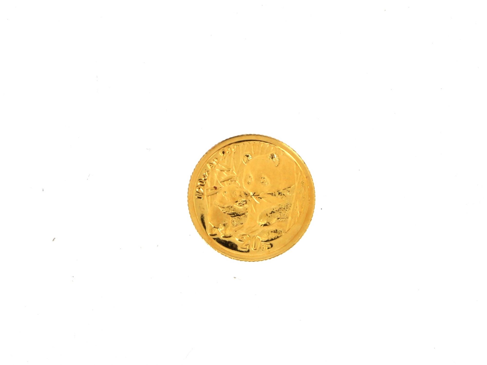 Lote 015 - Moeda 20 Yuan em Ouro, PANDA Chinesa de 2005, anverso apresenta o Templo do Céu em Pequim, com o nome do país e reverso mostra Pandas a comer Bambu, elaborado em OURO 24 QUILATES. Estado de Conservação: Muito Bom. Contraste: Marca 999,9. (OURO - ao abrigo do Decreto Lei 120/2017, artigo 3.º, alínea x). Medidas (Diâm): 1,4cm. Peso Total: 1,55g.