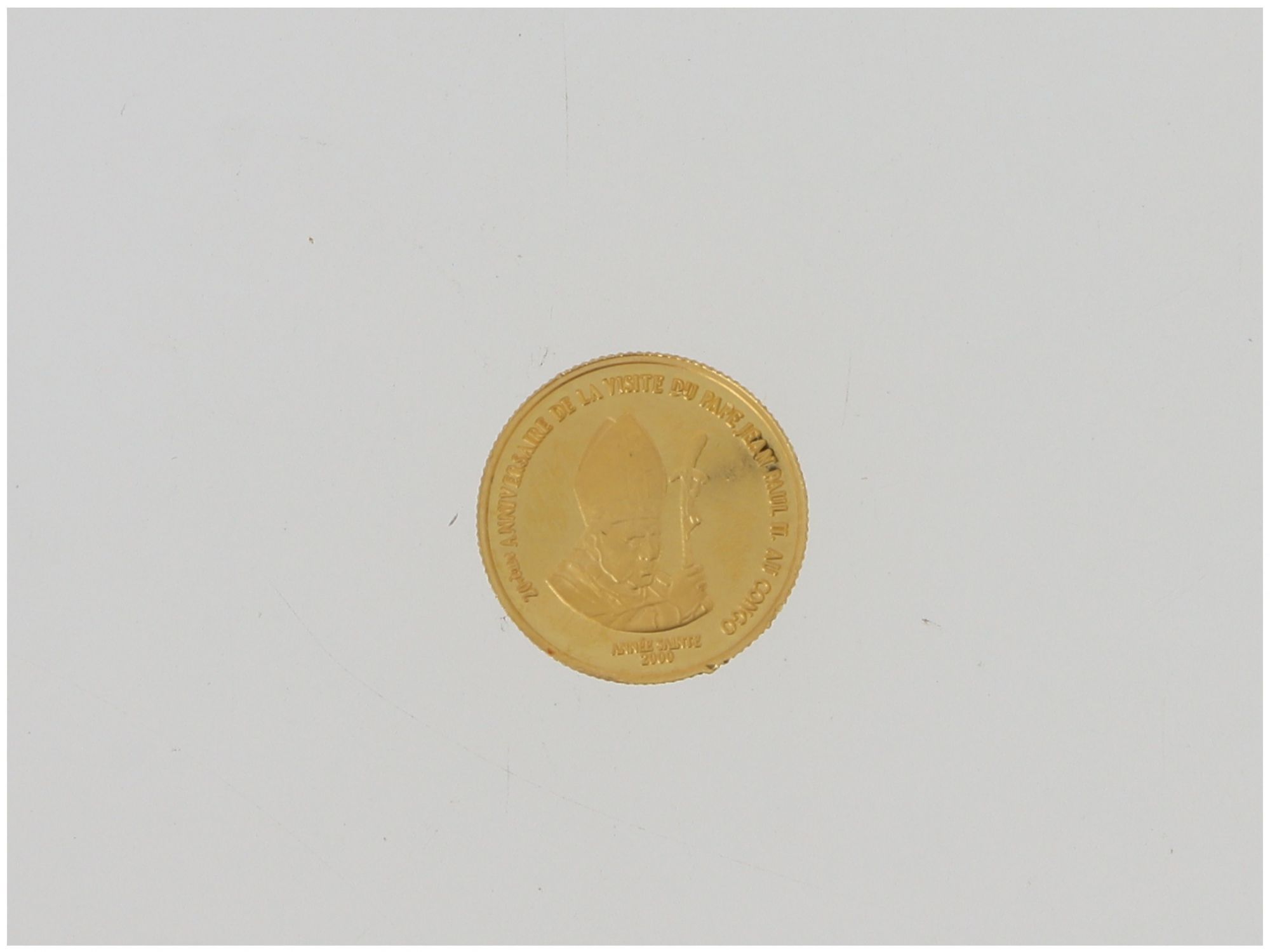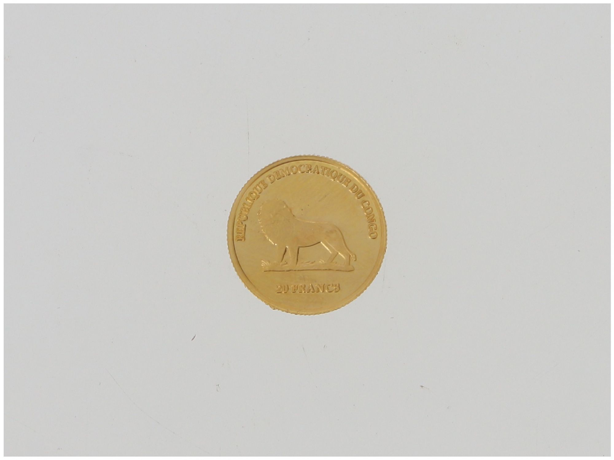 Lote 037 - Moeda 20 FRANCOS em Ouro da República Democrática do Congo de 2000, celebração do 20º aniversário da visita do Papa João Paulo II ao país, anverso tem busto do Papa João Paulo II voltado para esquerda e reverso mostra um leão, elaborado em OURO 24 QUILATES. Estado de Conservação: Bom. Contraste: Marca 999,9. (OURO - ao abrigo do Decreto Lei 120/2017, artigo 3.º, alínea x). Medidas (Diâm): 1,4cm. Peso Total: 1,23g.