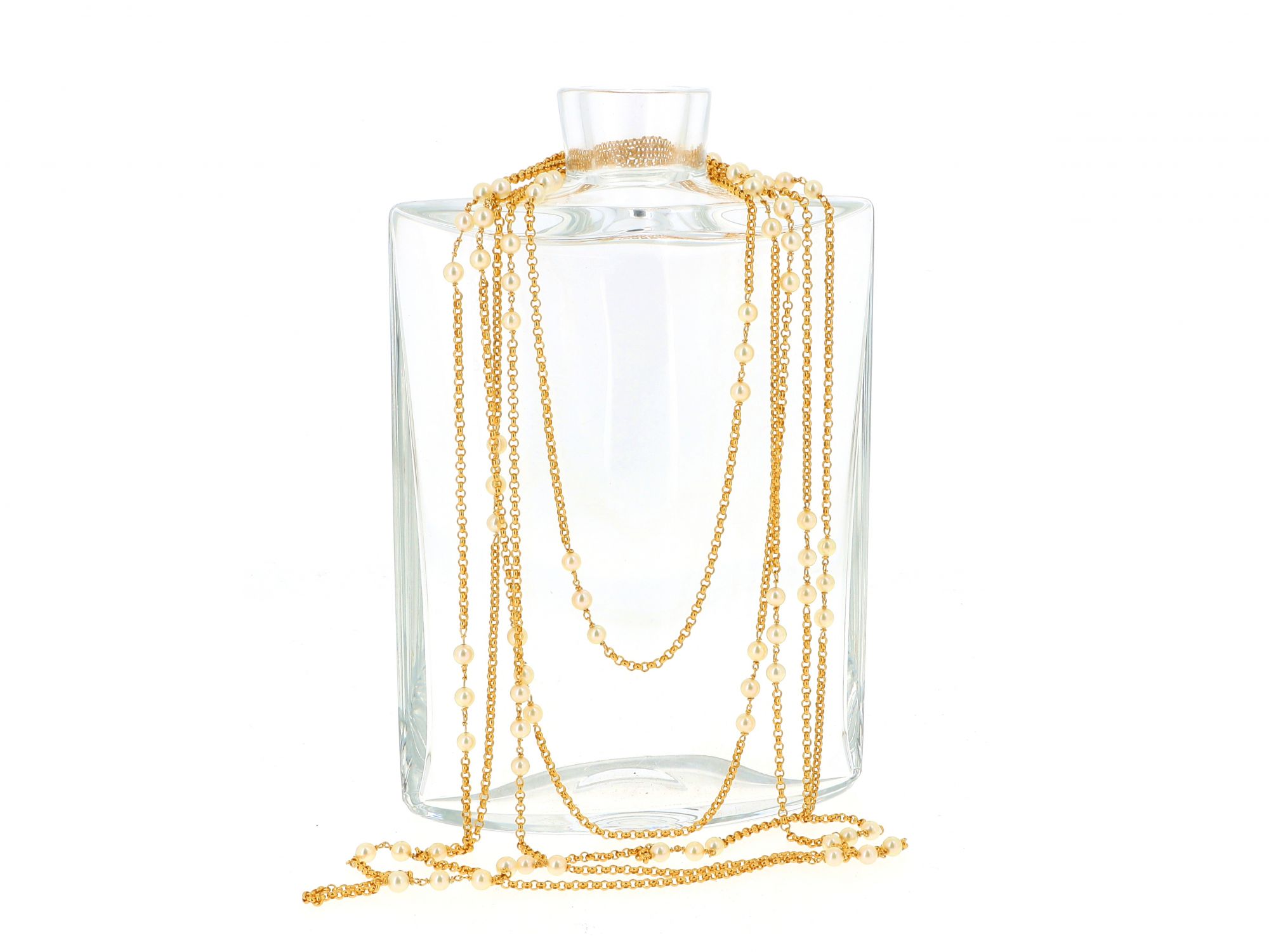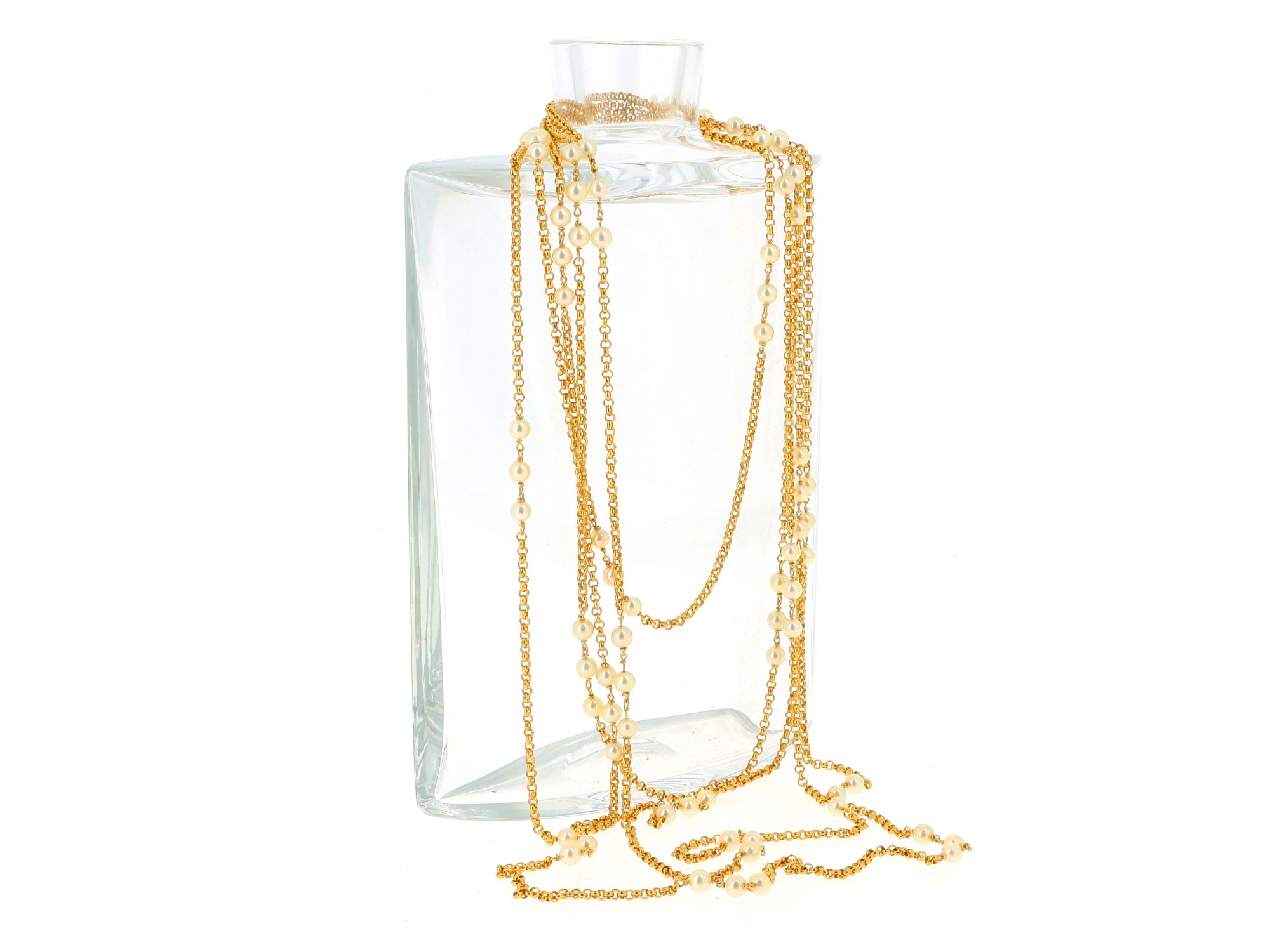Lote 008 - Cordão em Ouro de malha Elo Português  intercalado por três pérolas da cultura, elaborado em OURO 19,2 QUILATES. Estado de Conservação: Muito Bom, ligeiros sinais de uso. Contraste: sem marcas de contraste, com mais de 50 anos ao abrigo do Decreto Lei 120/2017, artigo 2.º, alínea c). Medidas (Comp): 130,6cm. Peso Total: 53,15g.