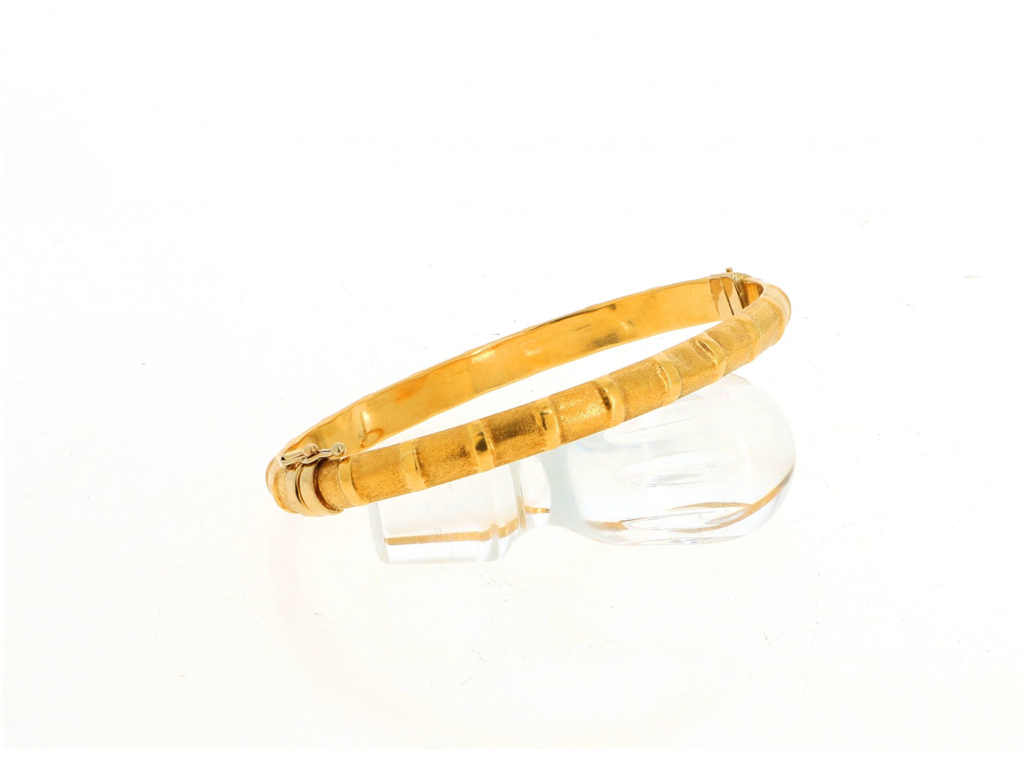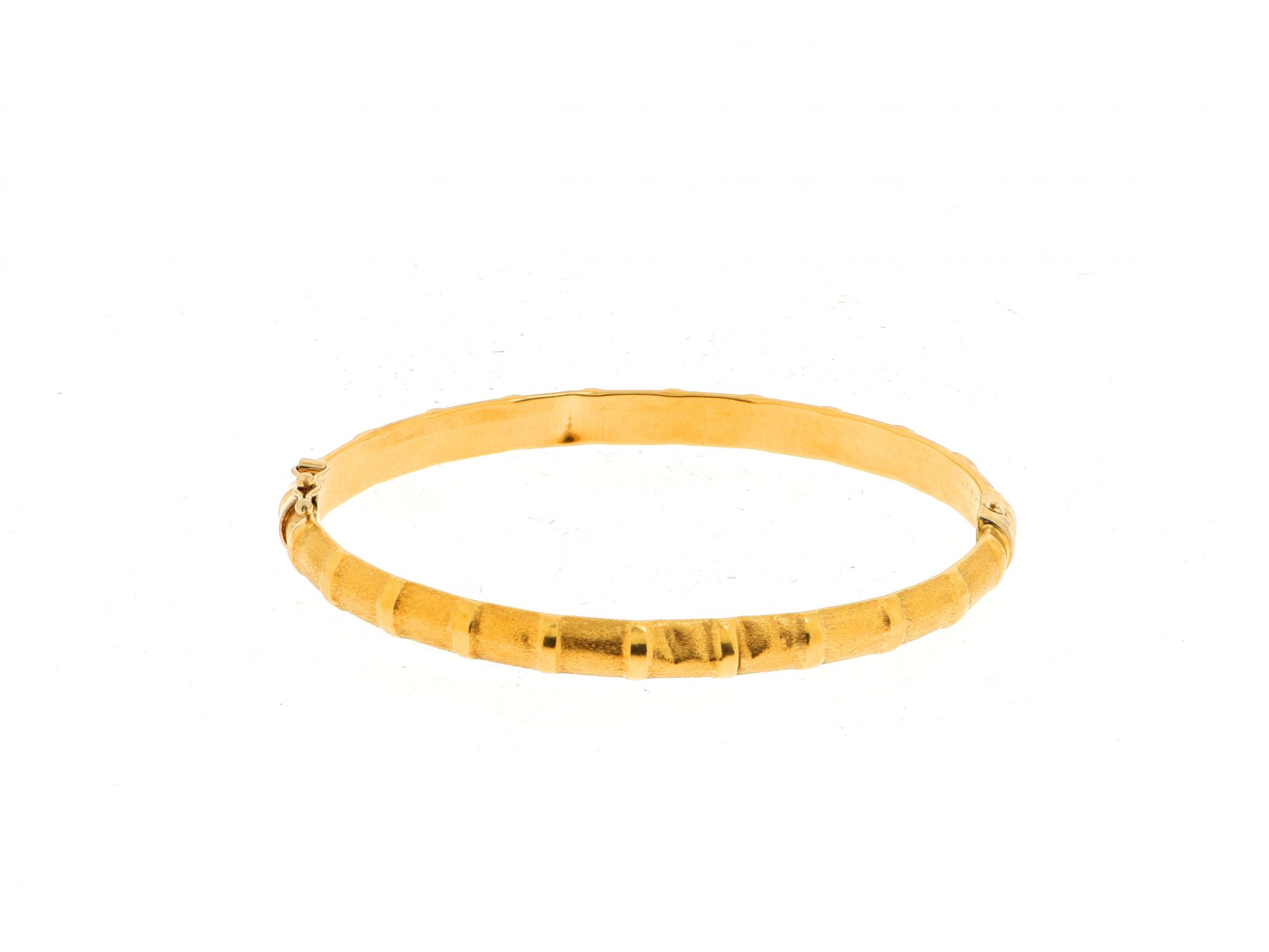Lote 018 - Bracelete em Ouro escovado ao estilo de bambu com fecho caixa com mola de proteção, elaborado em OURO 19,2 QUILATES. Estado de Conservação: Bom, sinais de uso. Contraste: Cabeça de Veado 800 (OURO - 1985-2020, ao abrigo do Decreto Lei 120/2017, artigo 3.º, alínea y). Medidas (LxA): 7*5,3cm. Peso Total: 8,46g.