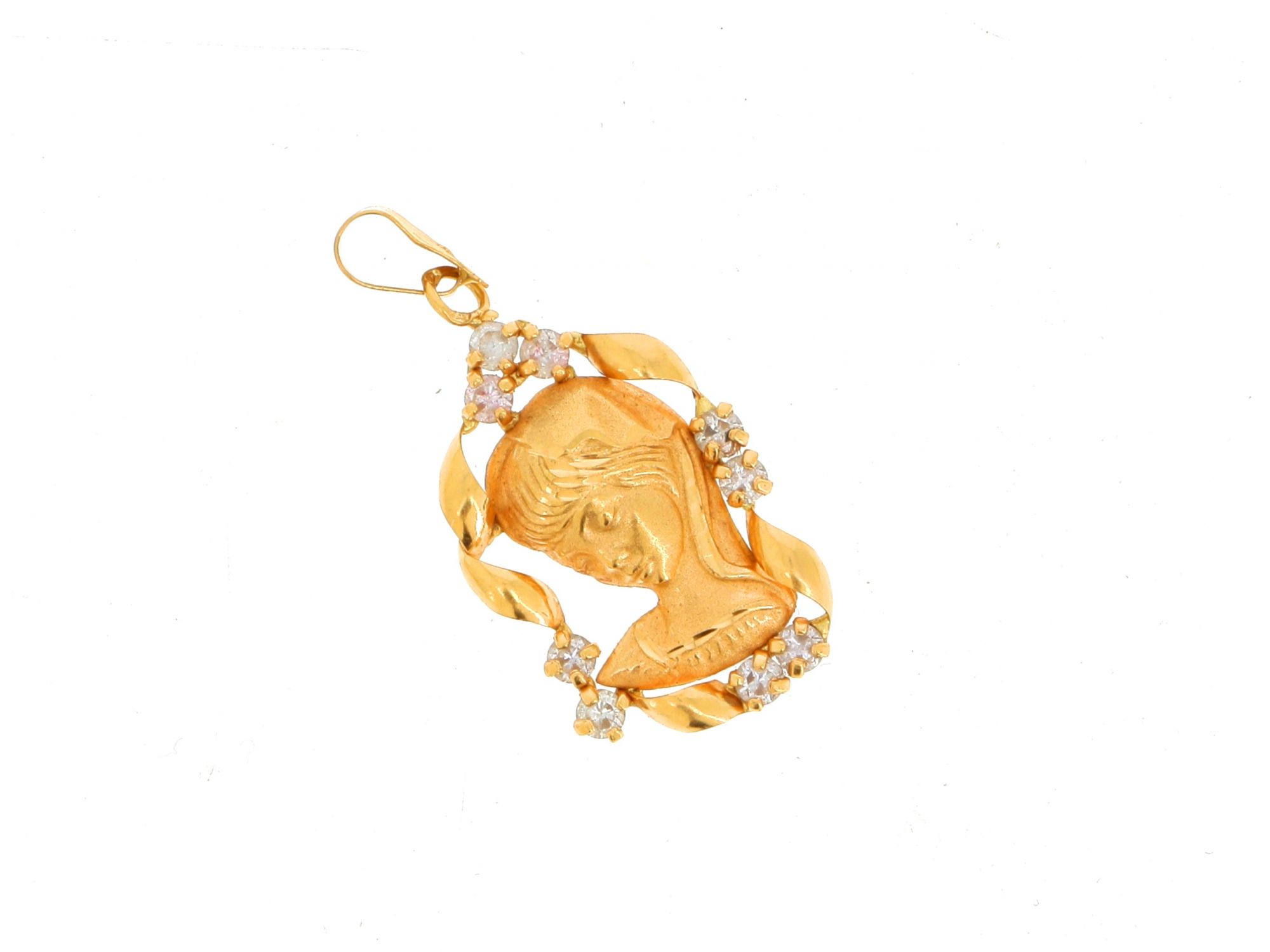 Lote 024 - Pendente em Ouro com design de rosto de mulher adornado de zicórnias incolores, elaborado em OURO 19,2 QUILATES. Estado de Conservação: Bom. Contraste: Cabeça de Veado 800 (OURO - 1985-2020, ao abrigo do Decreto Lei 120/2017, artigo 3.º, alínea y). Medidas (CxL): 3,2*1,6cm. Peso Total: 2,2g.