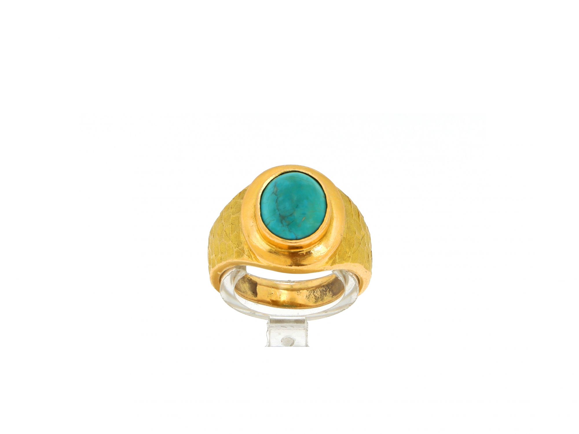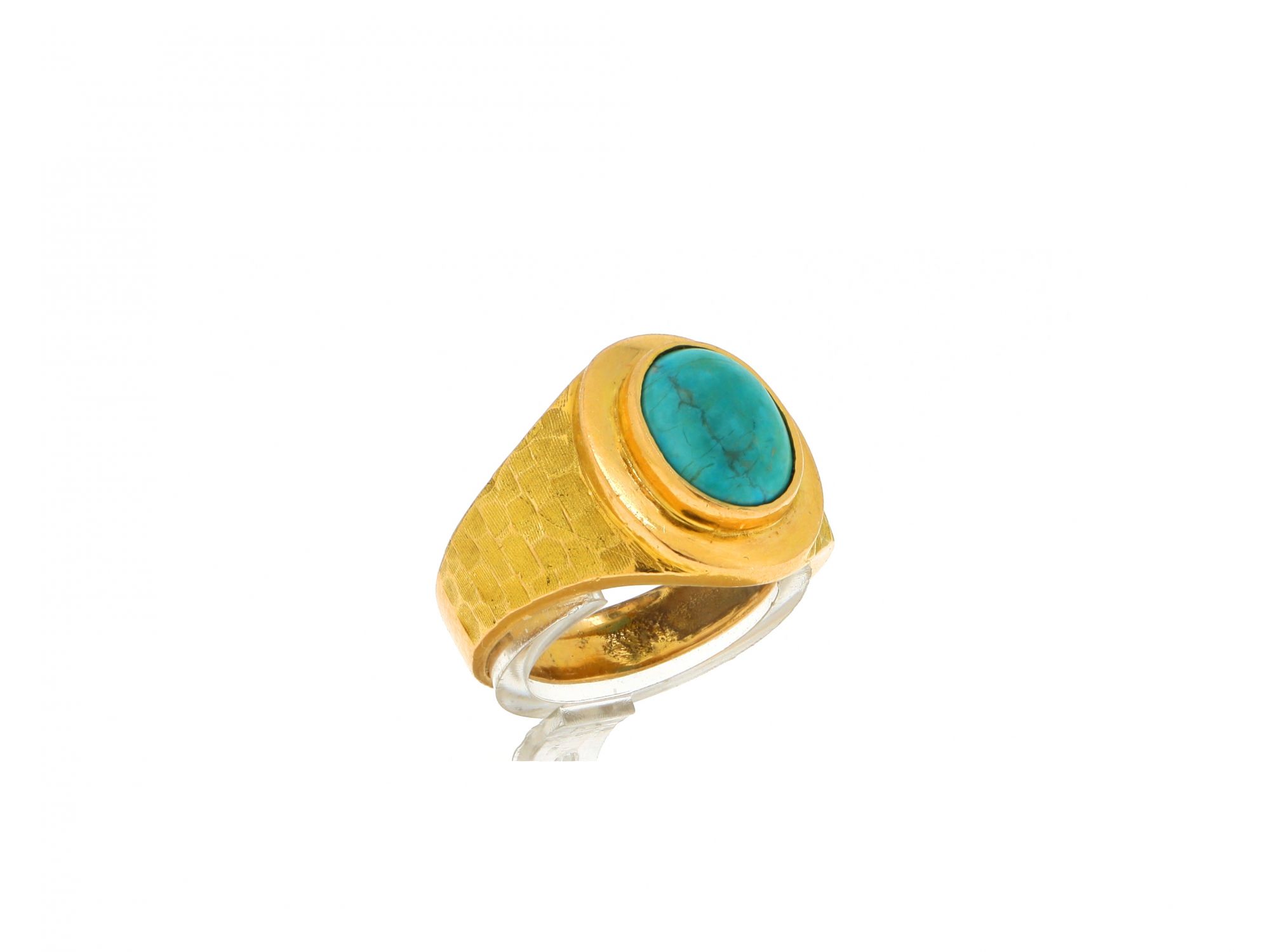 Lote 005 - Anel em Ouro de aro largo com acabamento martelado, rústico com 1 TURQUESA oval ao centro emoldurada por borda polida, elaborado em OURO 19,2 QUILATES. Estado de Conservação: Muito Bom. Contraste: Cabeça de Veado 800 (OURO - 1985-2020, ao abrigo do Decreto Lei 120/2017, artigo 3.º, alínea y). Tam.: 13,5. Medidas (CxLxA): 2*1,6*2,3cm. Peso Total: 5,32g.