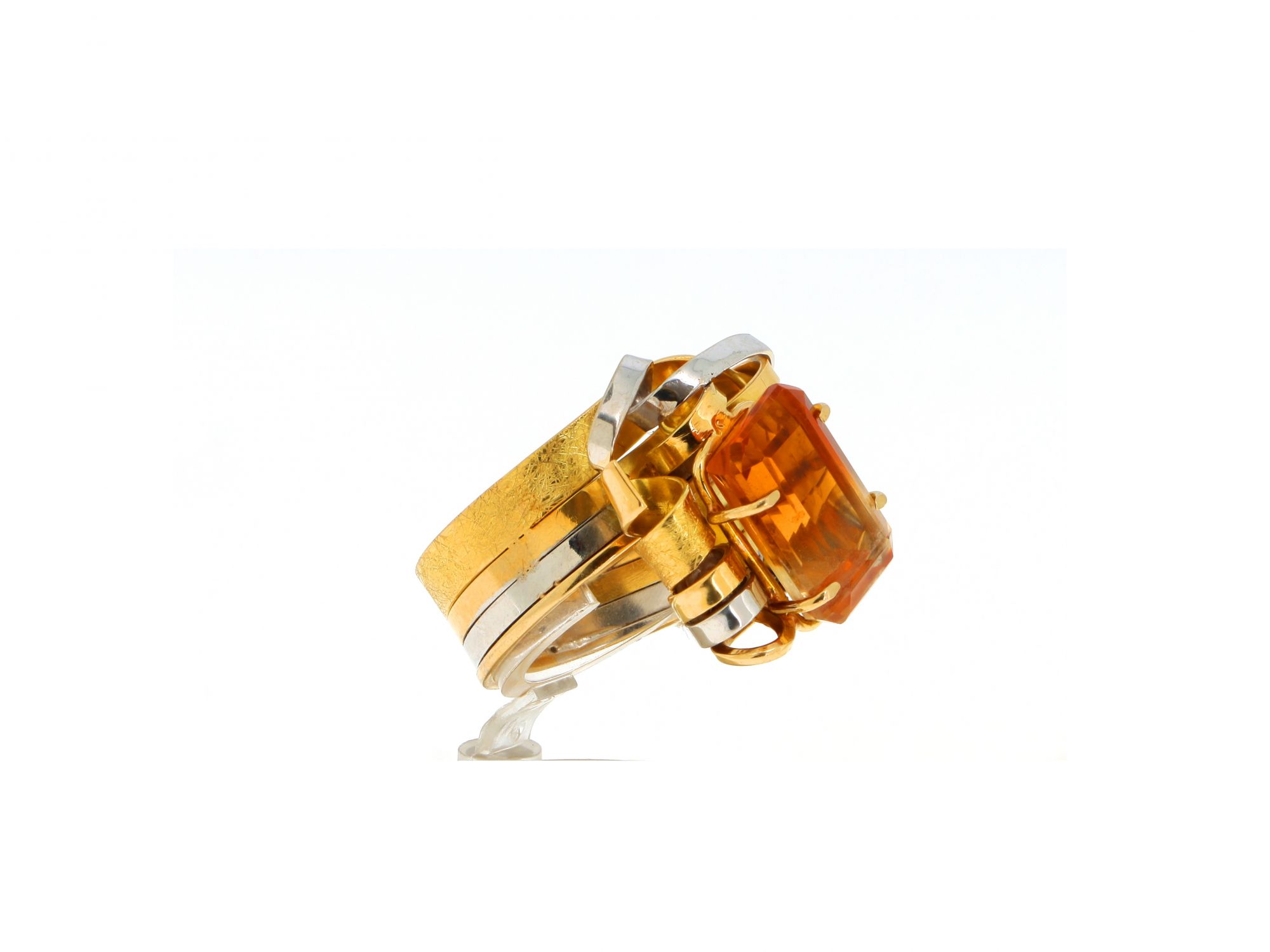 Lote 017 - Anel em Ouro Bicolor abstrato com tiras em ouro escovado e outras polidas, com topo trabalhado e cravado com Pedra Citrino em dois tons, elaborado em OURO 19,2 QUILATES. Estado de Conservação: Excelente. Contraste: Cabeça de Veado 800 (OURO - 1985-2020, ao abrigo do Decreto Lei 120/2017, artigo 3.º, alínea y). Tam.: 17. Medidas (CxLxA): 2,1*2,2*2,7cm. Peso Total: 11,52g.